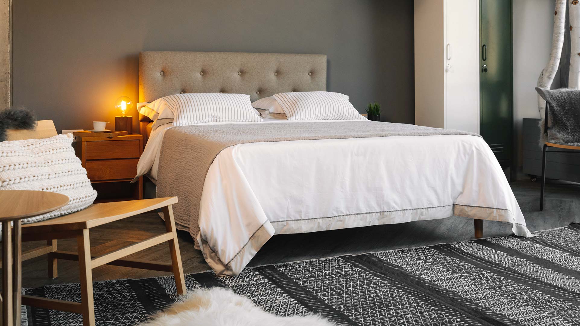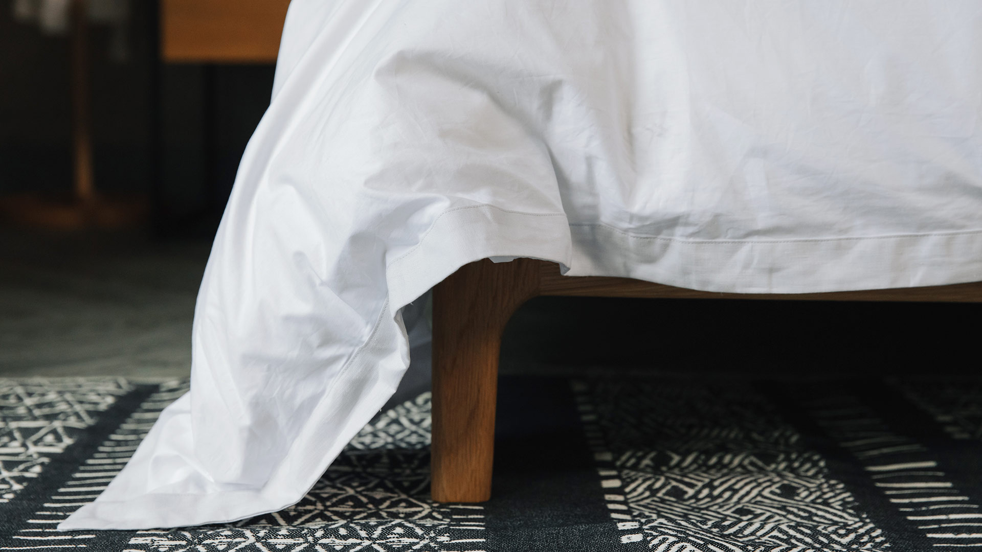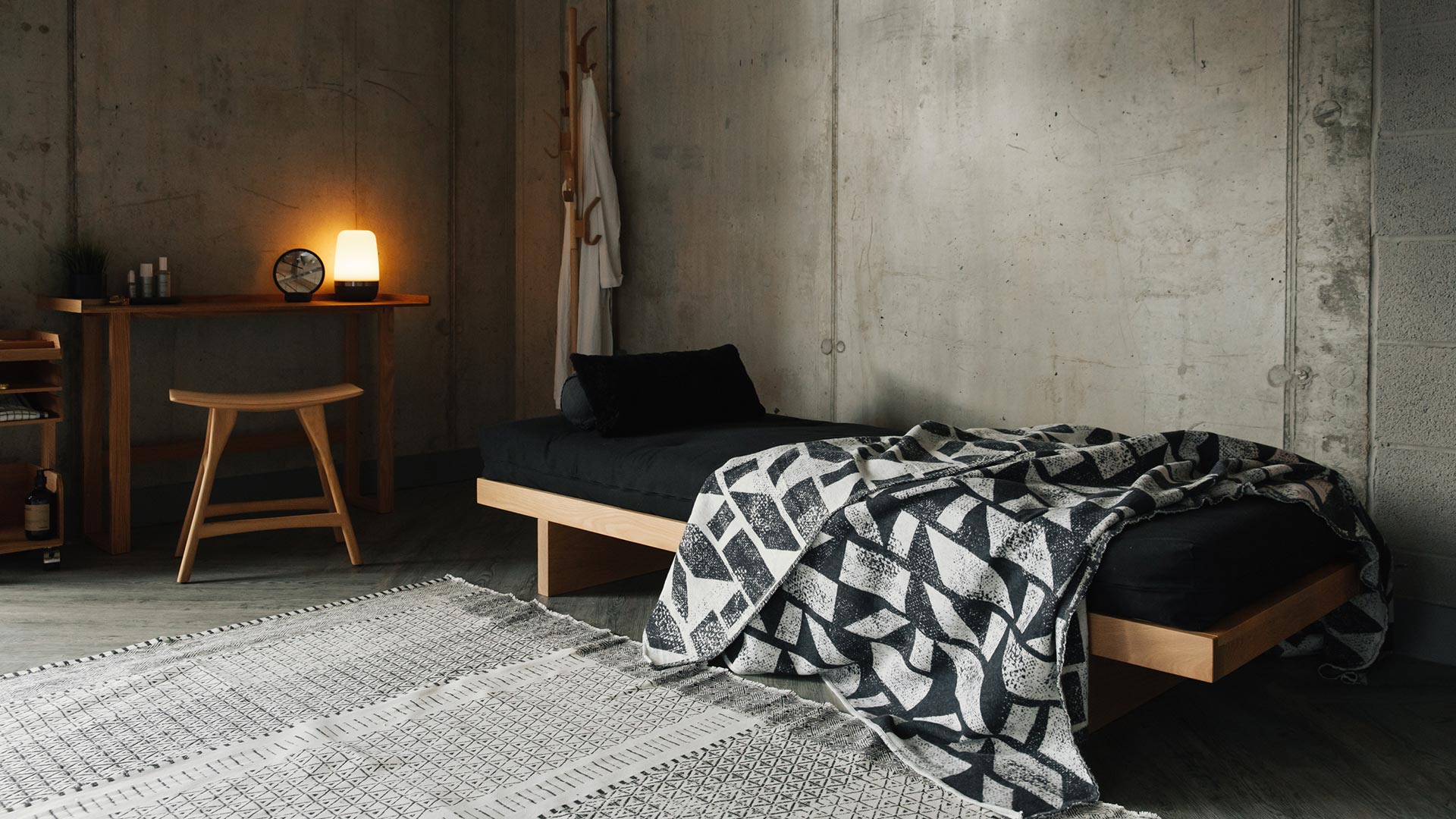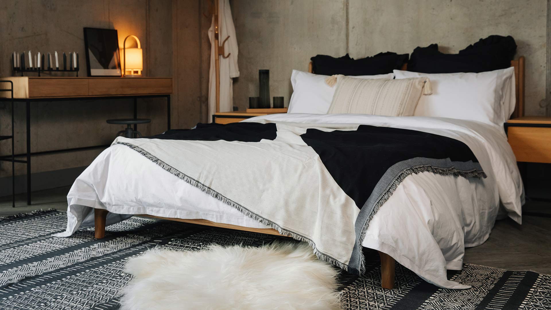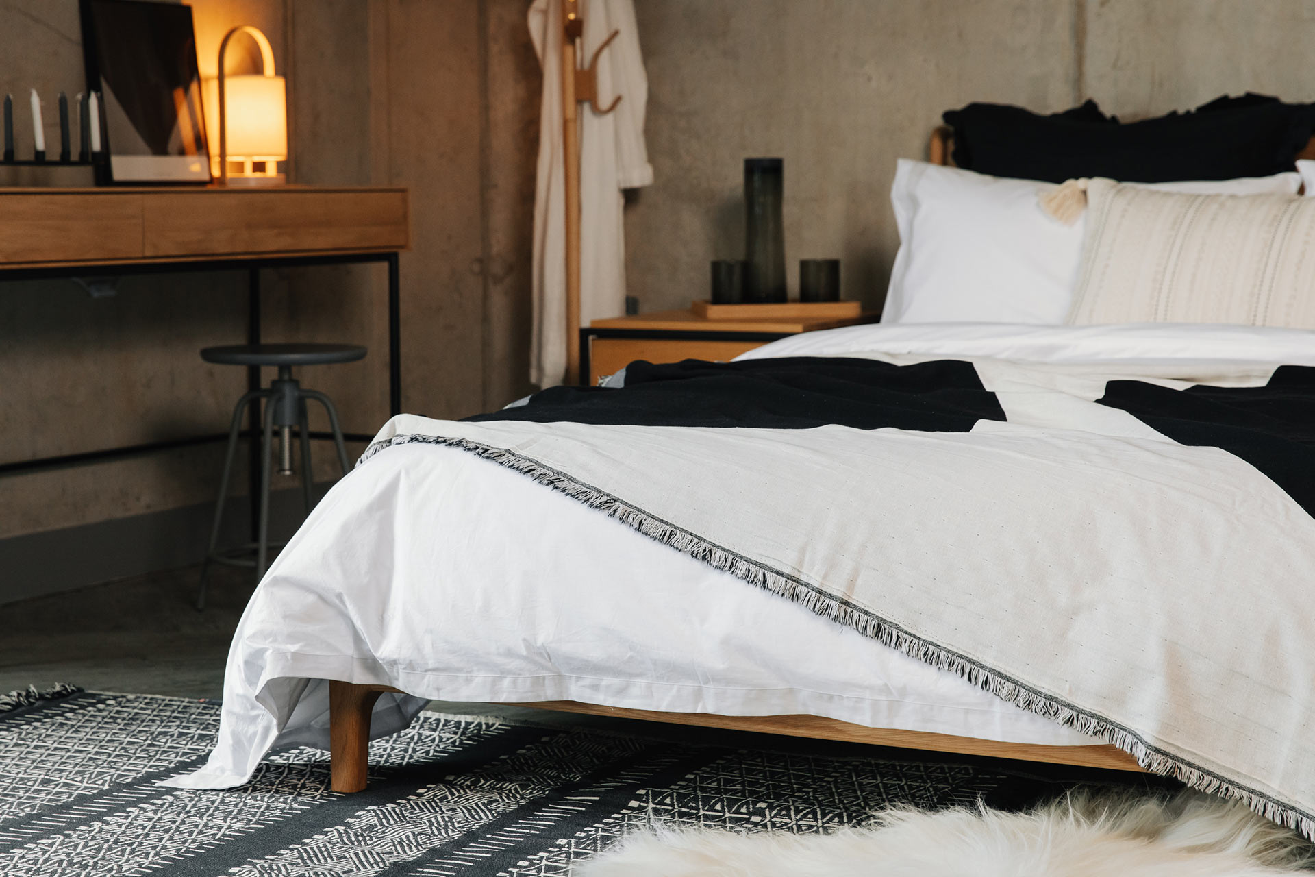 Luxe, modern monochrome cotton rich rugs. Woven with a blend of black and ivory thread in contemporary, slightly boho patterns. Made using recycled cotton. Ideal for a modern, bohemian look bedroom; we love to display them tucked under the foot-end of our beds. This elongates the shape of your bed, making your bed and room look larger and more spacious.