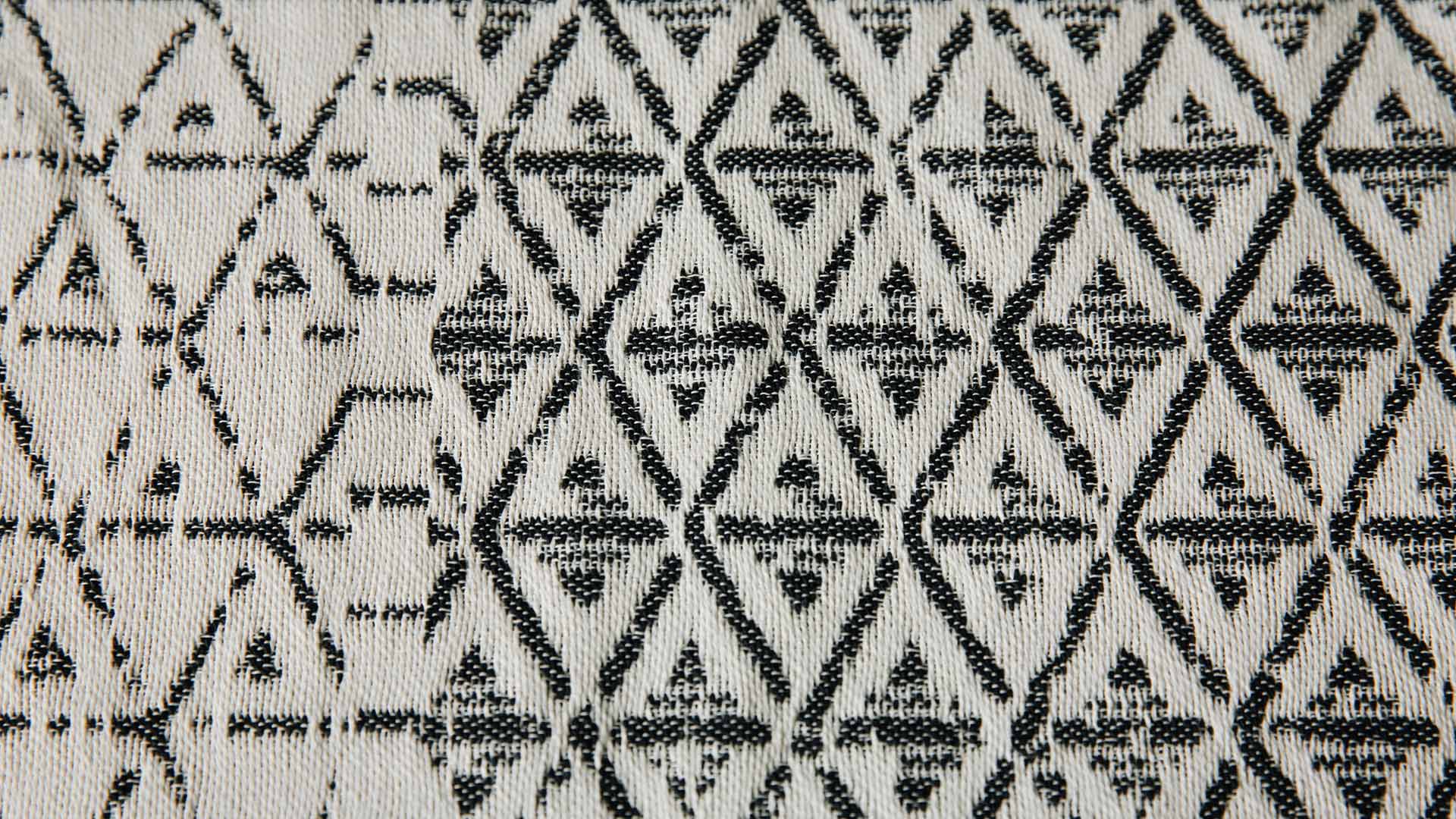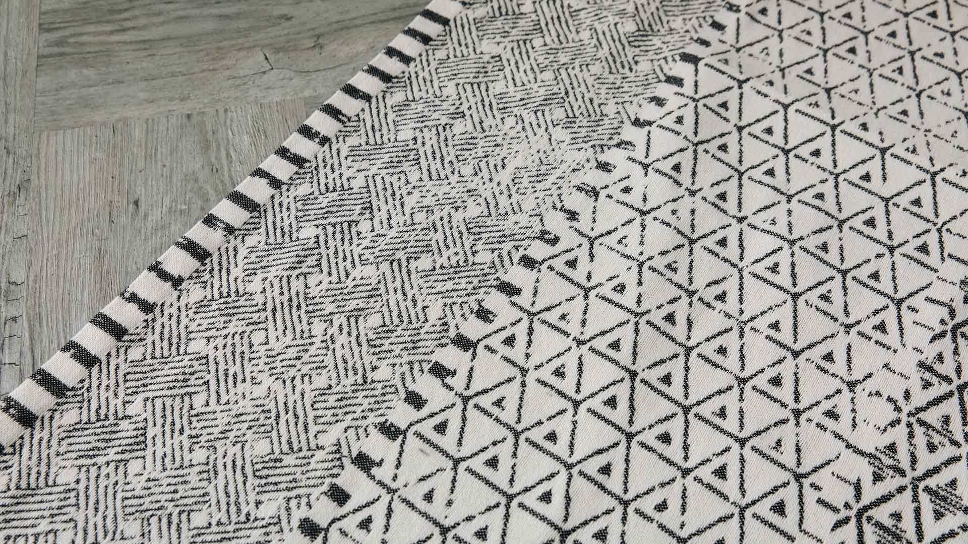 A stylish, cotton rich rug made using recycled cotton. A reversible rug in black and ivory with a contemporary, abstract pattern of stripes, diamond shapes and dots. Available in two sizes: 150x200cm or 200x300cm.
