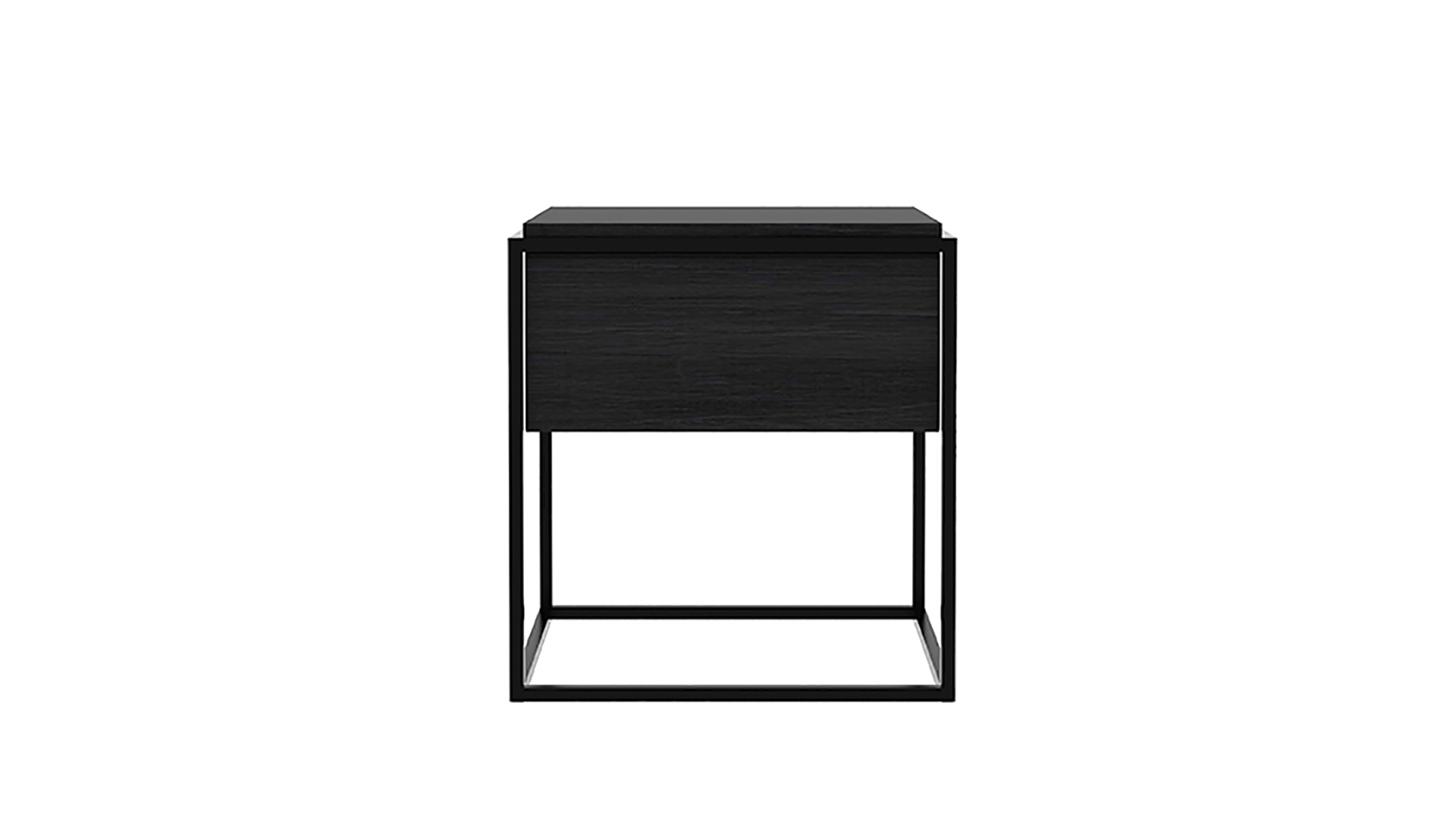 The Monolit bedside tables are modern, single drawer units in oak with a metal frame in black. The minimalist Monolit bedside table offers ample storage and serves as a convenient stand for bedside essentials.