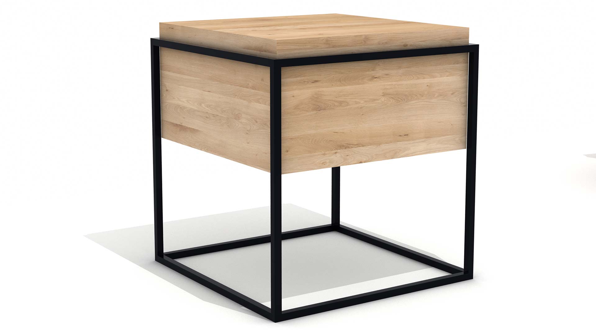 The Monolit are stylish, minimalist bedside tables from Ethnicraft. Characterised by it has a lacquered metal, square section frames, and comprising of a single drawer. Available in either black-stained or natural oak, paired with a black metal frame. This useful unit can be used as a nightstand or side table.