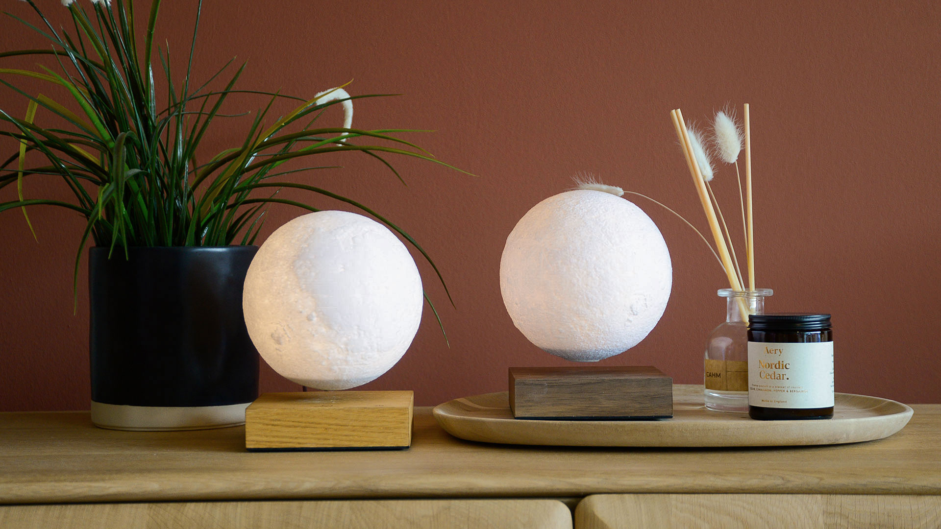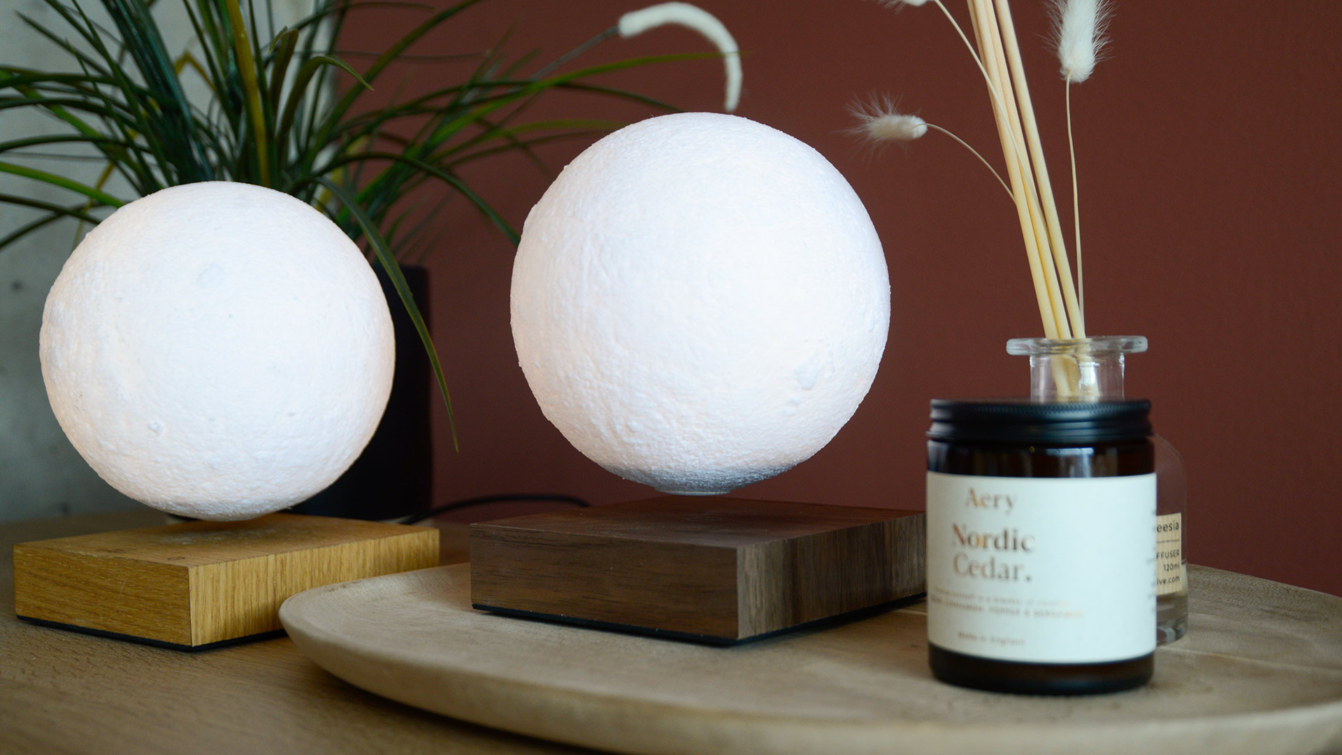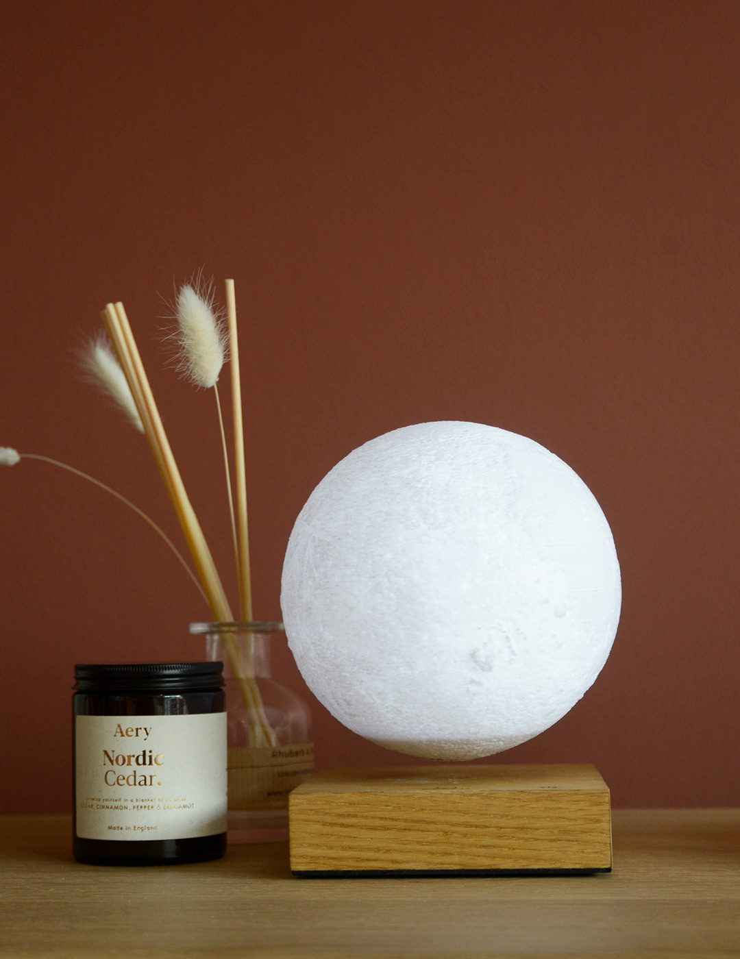 A breathtaking moon lamp, available with a white ash or a walnut base – the moon ‘floats’ above the base, emitting a cool or warm light while slowly rotating.