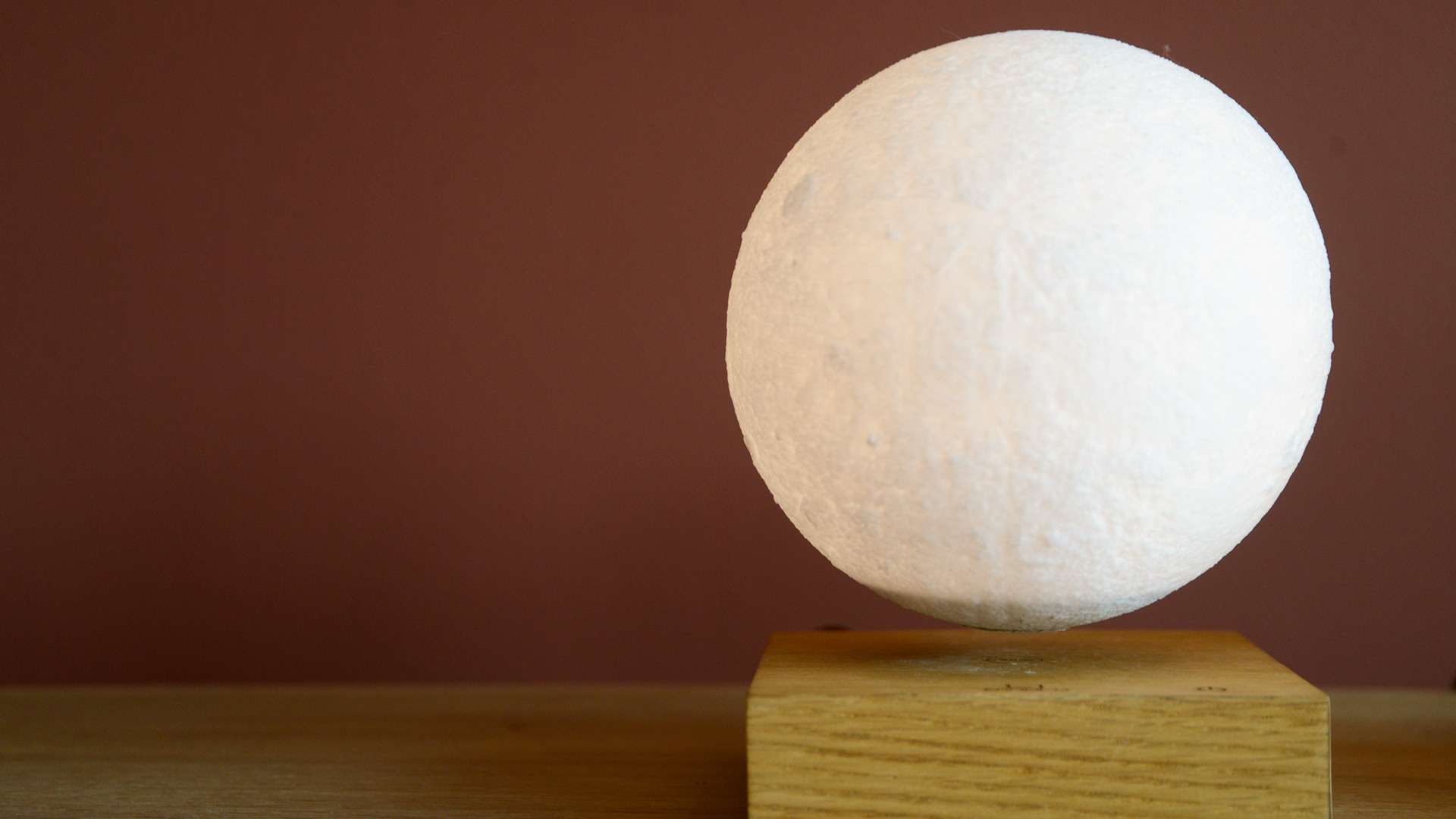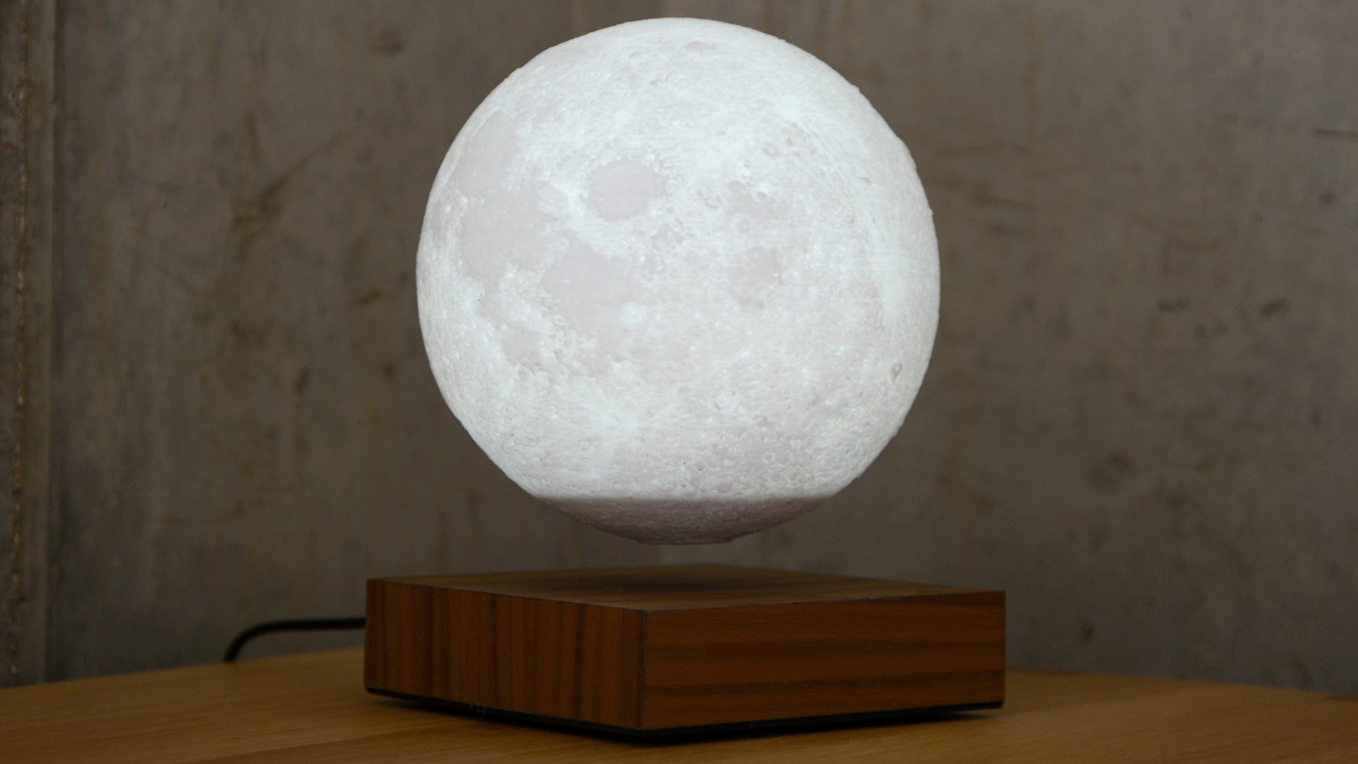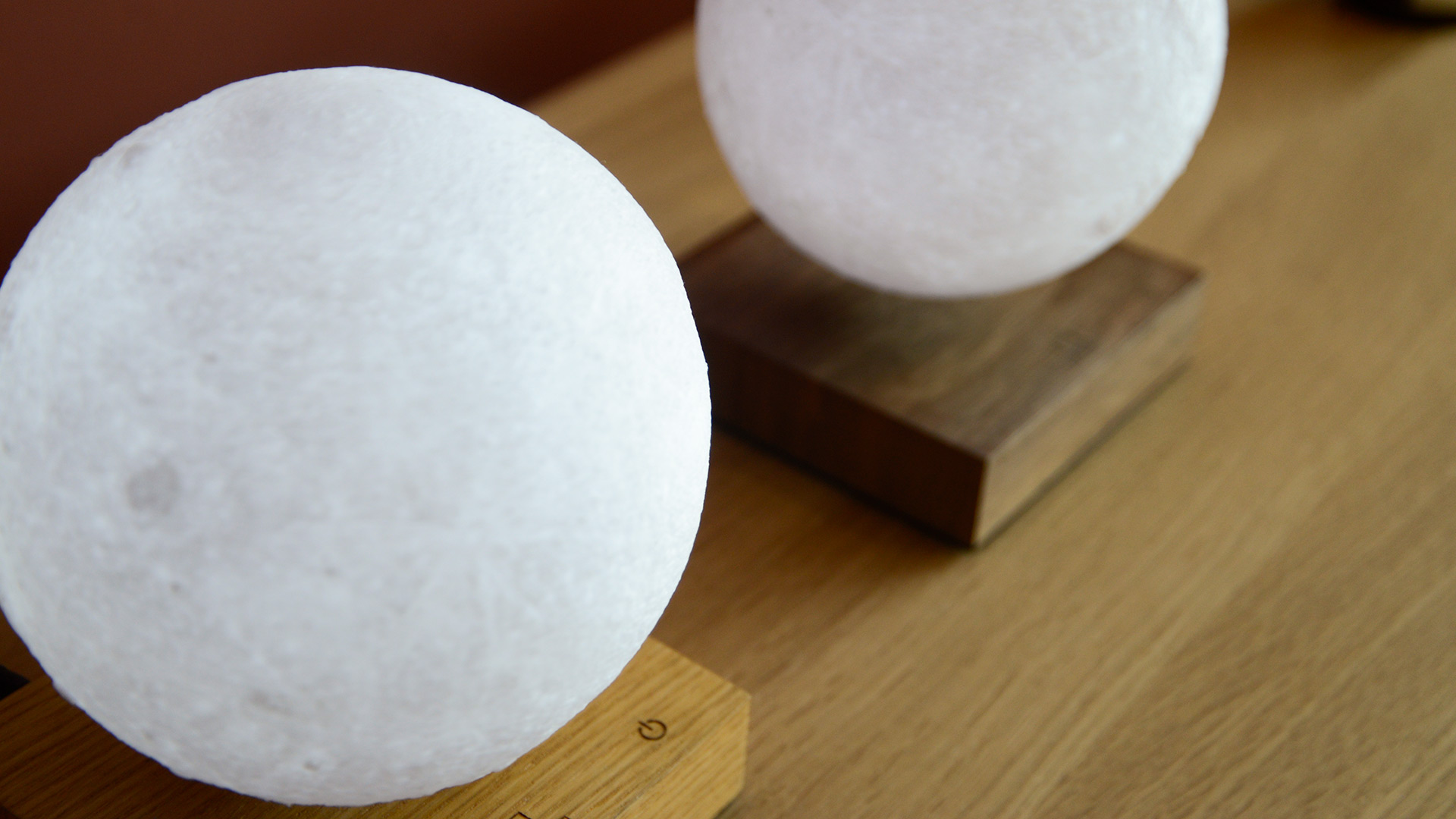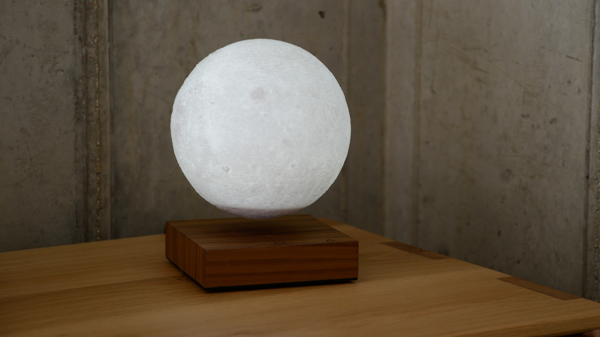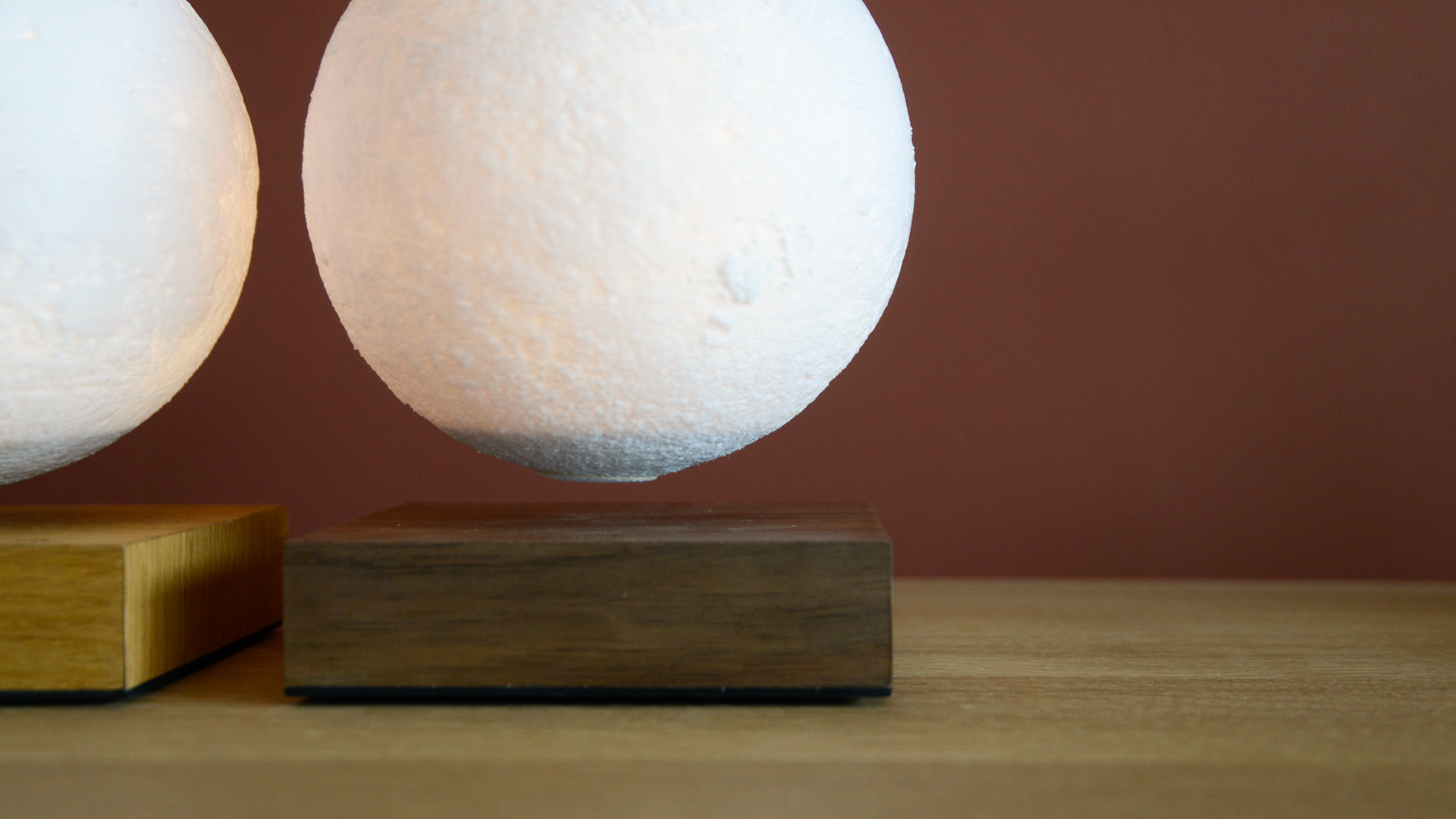 A beautiful moon lamp, it floats over its wooden base while emitting a soft glow and slowly rotating. Available in two different base options; white ash or walnut.