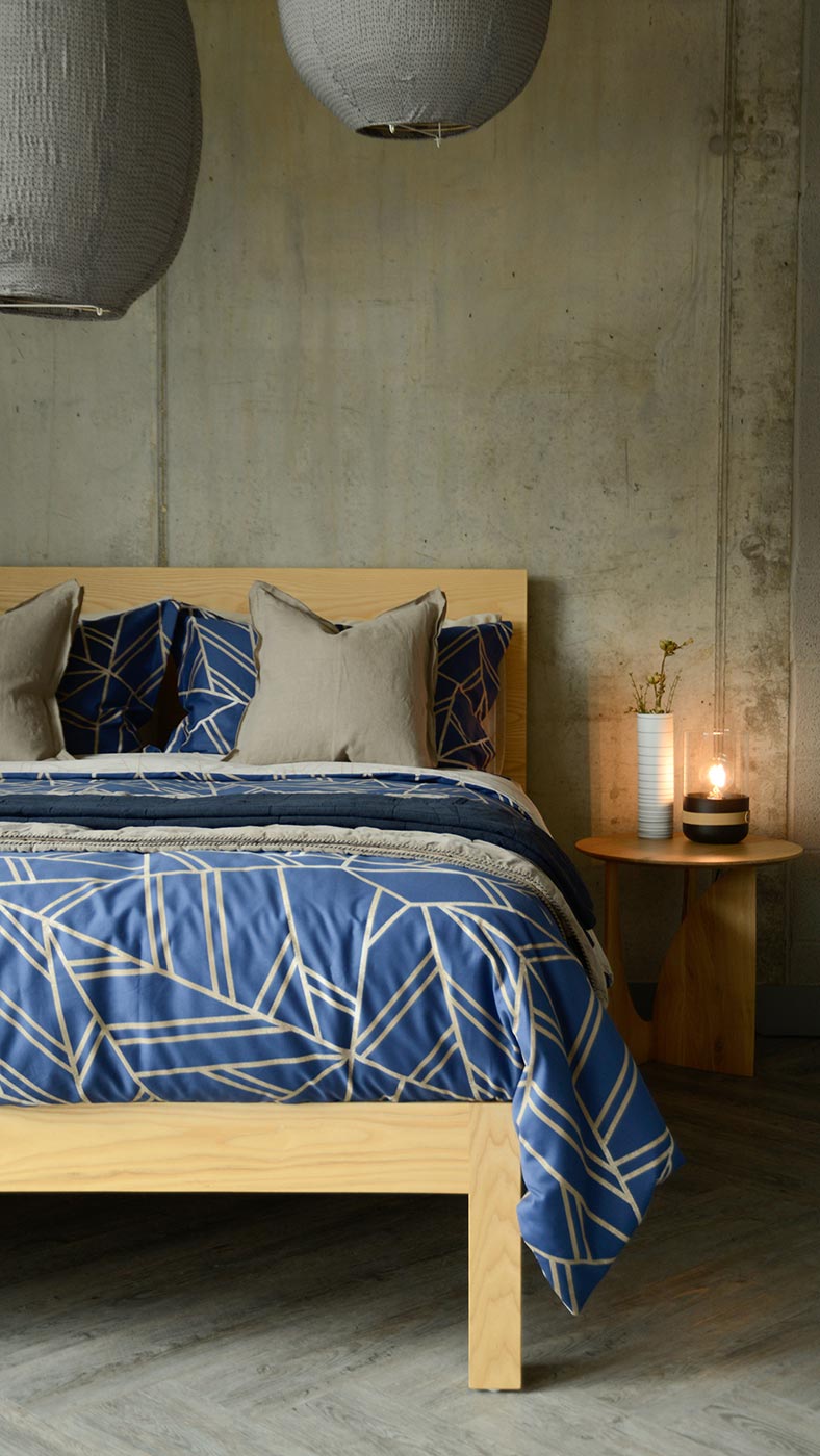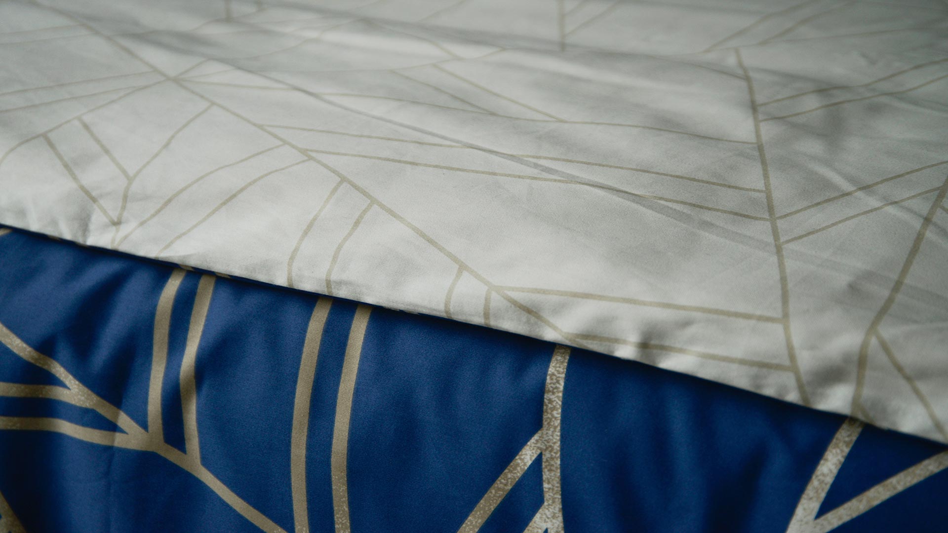 A stylish, reversible blue duvet set. This duvet set is adorned with a contemporary mosaic pattern in an antique gold, spread over a deep blue background. Printed with a muted golden shade, overlaid with a mottled ivory pattern, the lines make up this set’s characteristic mosaic pattern. On the reverse is a fine mosaic print; in muted gold over a light ecru background.