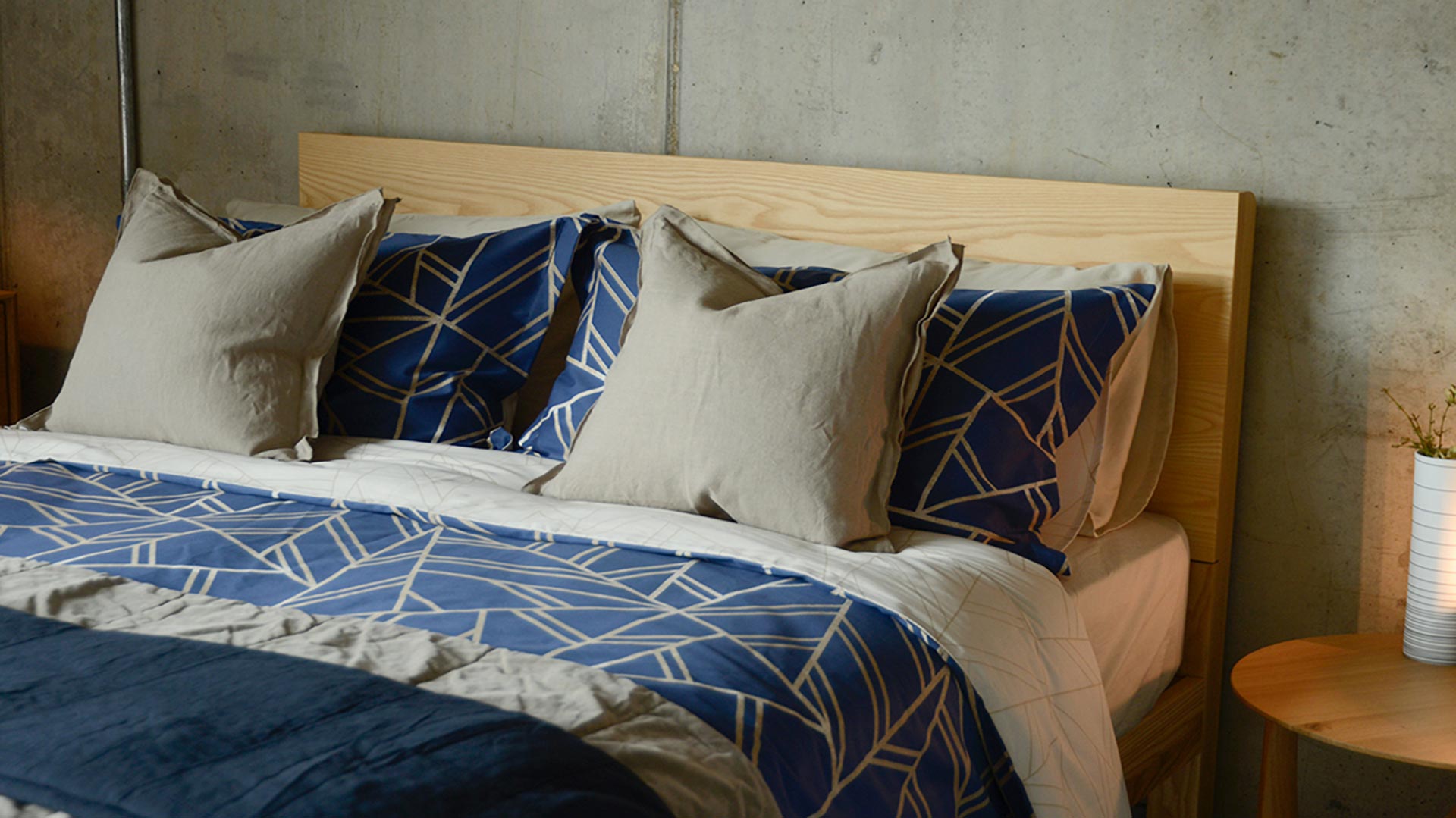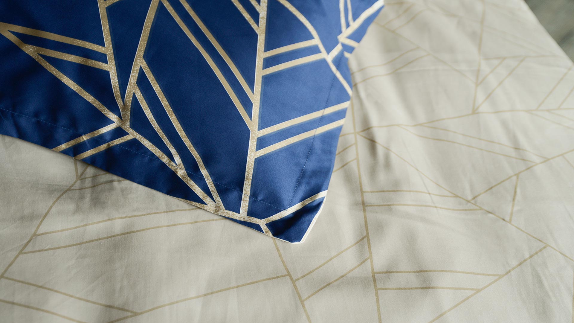 A reversible duvet set with a modern, large scale mosaic pattern in muted gold colour over a deep blue background. A beautiful, contemporary design.