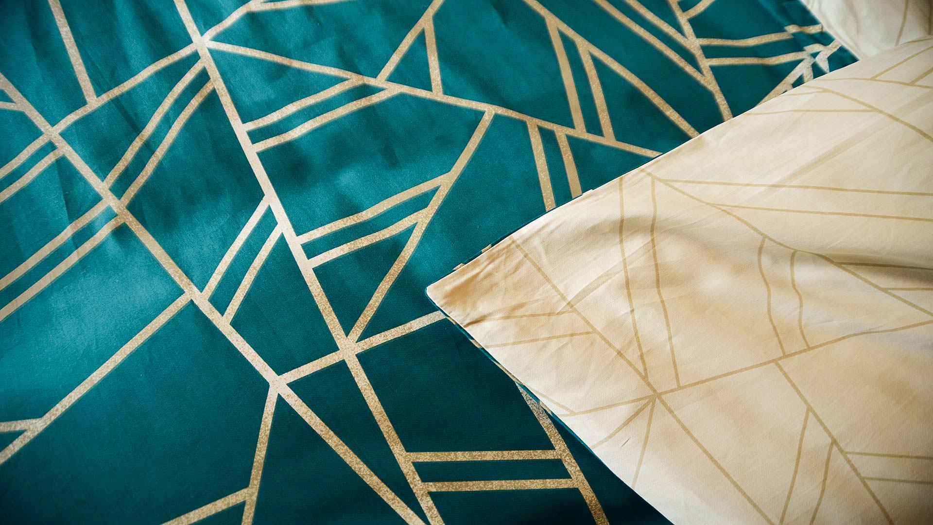 A stylish, reversible teal duvet set. This duvet set is adorned with a contemporary mosaic pattern in an antique gold, spread over a deep teal background. Printed with a muted golden shade, overlaid with a mottled ivory pattern, the lines make up this set’s characteristic mosaic pattern. On the reverse is a fine mosaic print; in muted gold over a light ecru background.
