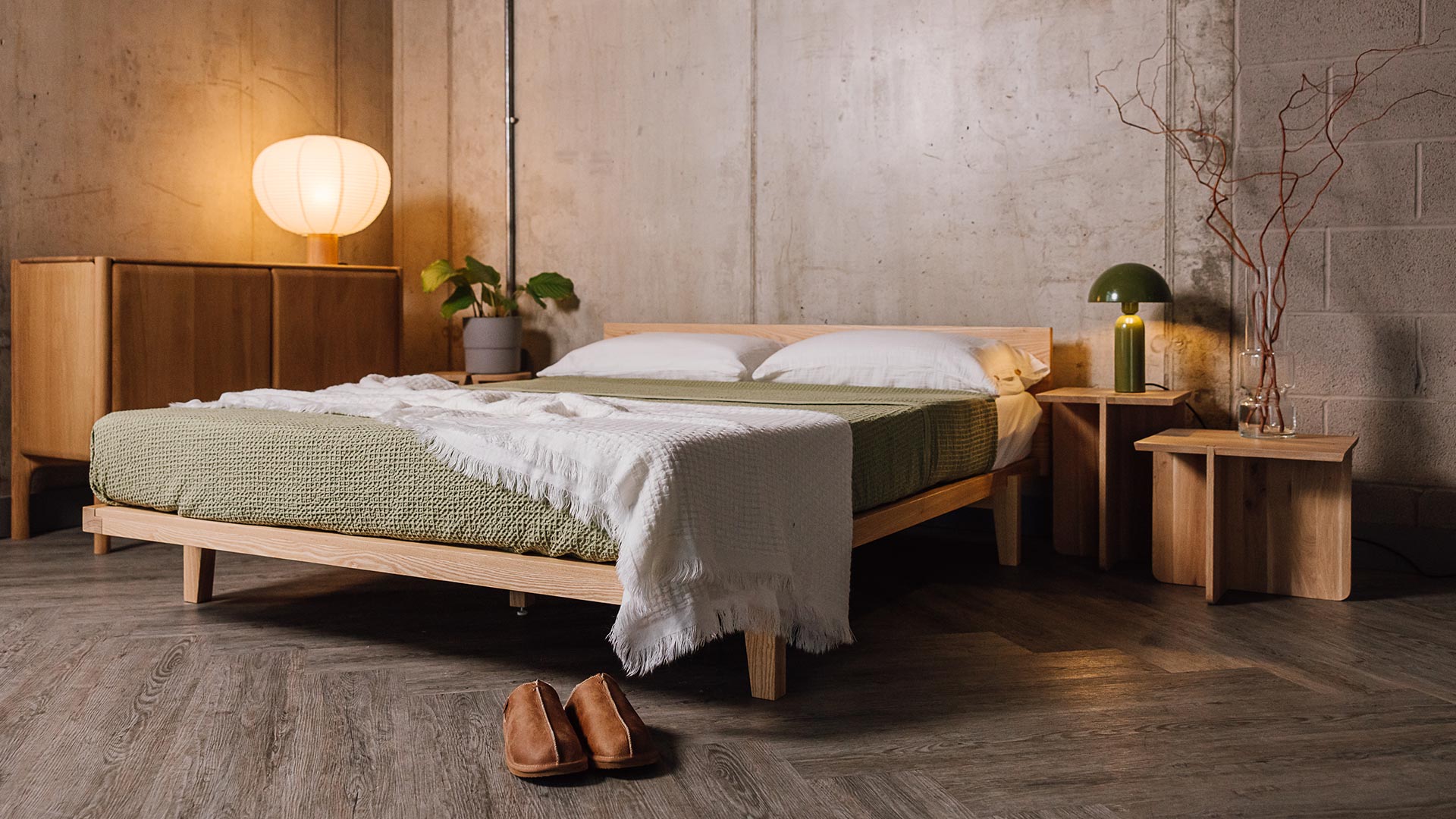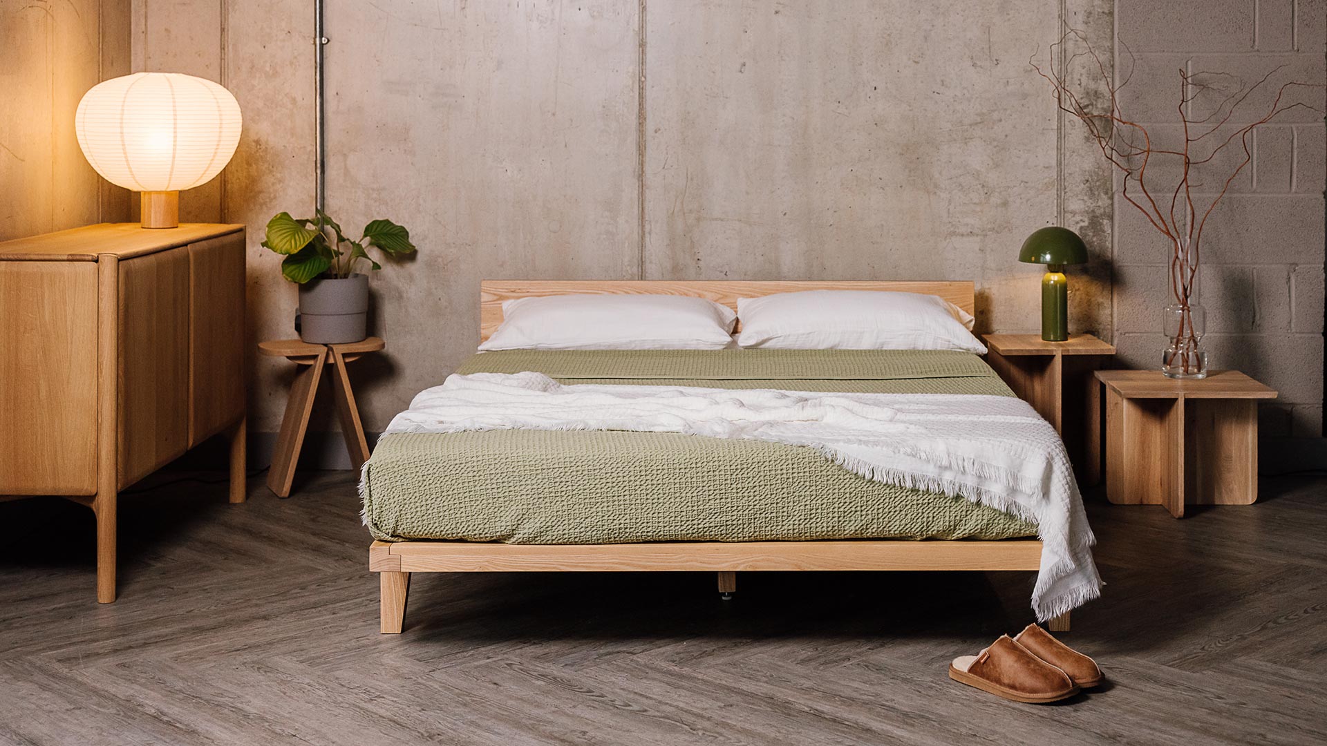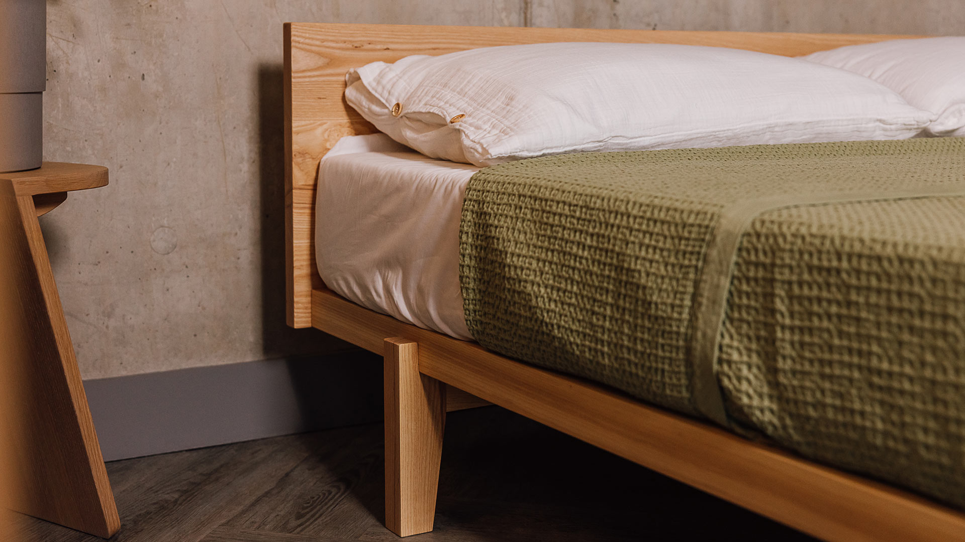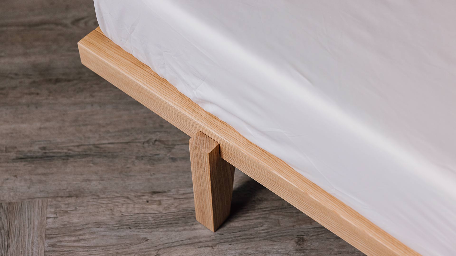 Drawing from both mid-century modern design and minimal Japanese style, the Nara handmade contemporary bed cuts a geometric profile. With a slightly larger footprint than that of our popular Kyoto bed, the Nara still boasts a compact frame, but with a more modern look. The angular, straight legs and edges are a real statement, and draw the eye with their subtle, yet bold design.