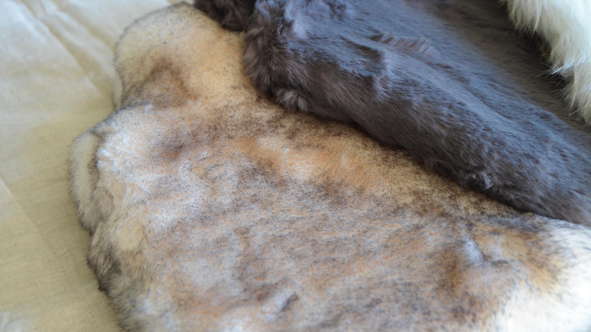 Brown Bear: Dark, chocolatey brown tones Blue Russian: A deep pile in a dark, warm grey Silver Fox: Frosted ‘fur’ with a variety of soft grey shades and a subtle blush tone to the tips Alaska Fox: Deep pile frosted ‘fur’ with charcoal depths and light silver tones to the tips Siberian Wolf: An extra-deep pile incorporating cream and burnt caramel tones Reindeer: A deep pile incorporating cream and burnt caramel tones with a stripe of ivory ‘fur’ Brown Snow Fox: A super soft pale cream pile with dark brown tips Cement Grey: a mid-toned solid grey with a super soft feel Deep Charcoal: a dark, almost black shade of grey with a deeper, thicker pile