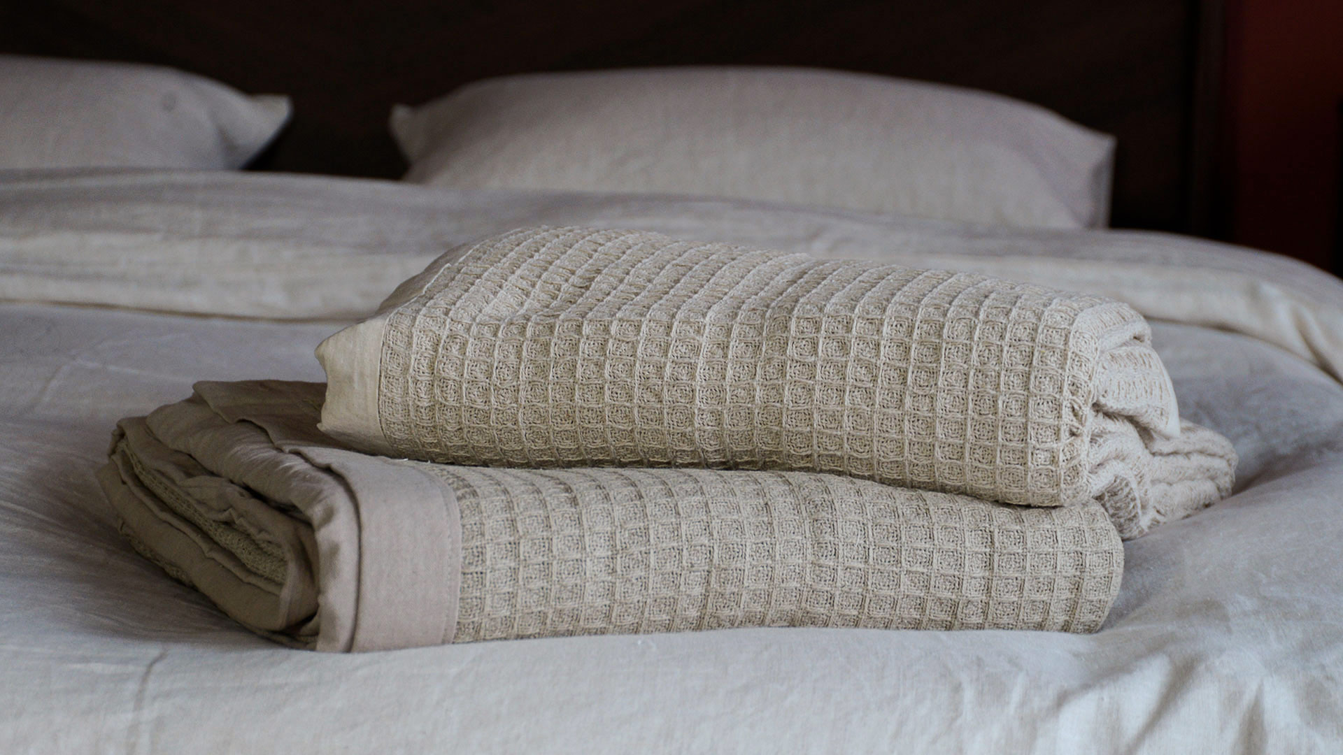 These simple yet stylish neutral waffle weave blankets are available here in two colour-ways; Natural (a lighter, creamy shade) & Stone (a slightly deeper beige shade). Featuring a wide oxford border, the large size of these blankets makes them ideal for double, kingsize and super-king beds, depending on the level of draping you prefer.