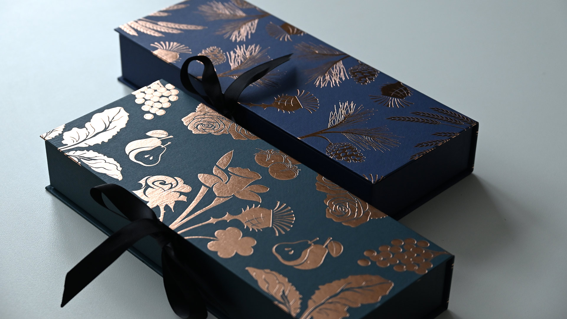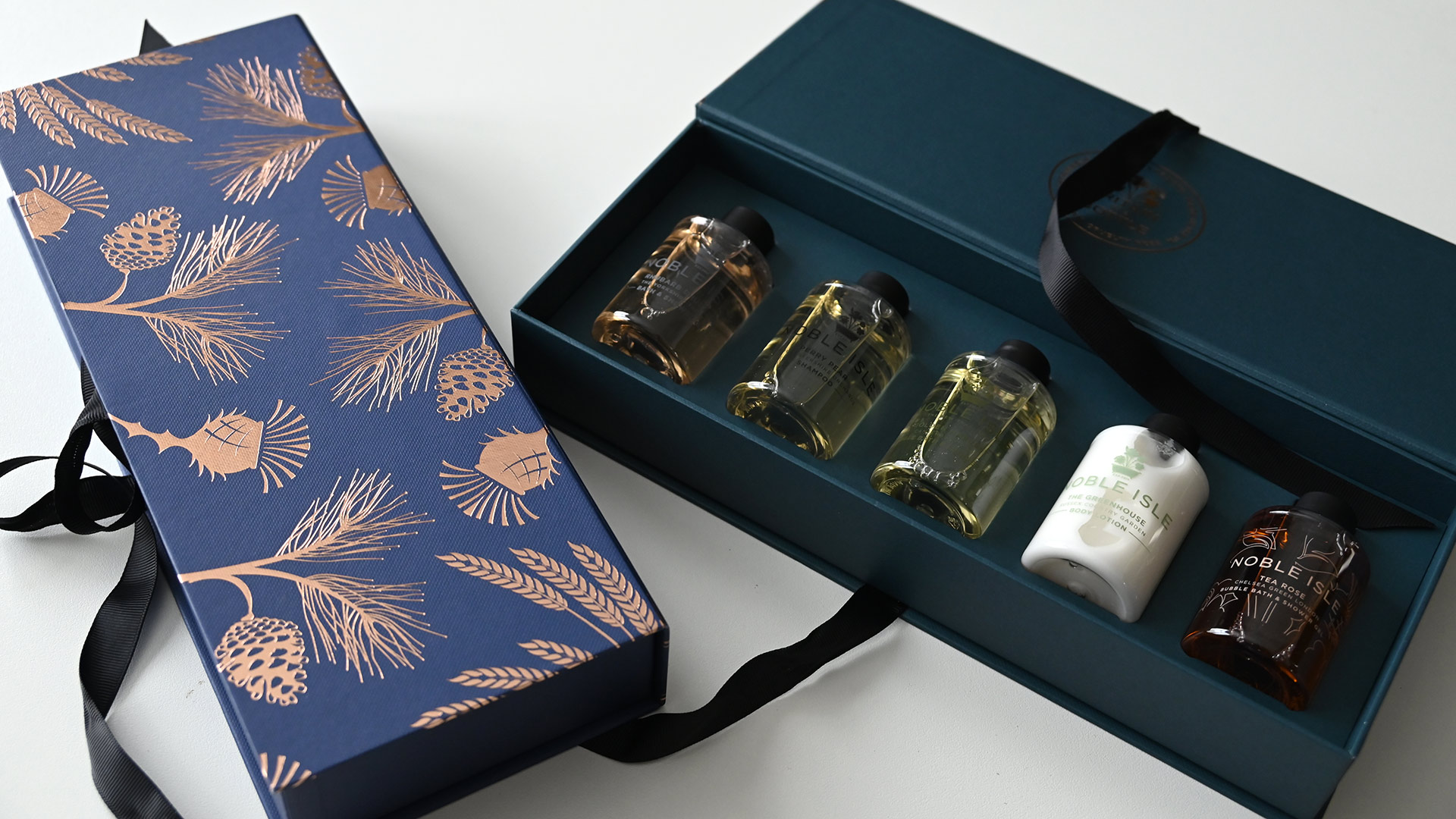 This set is pesented in a navy blue gift box with a gold sprig, reed and pine cone detailing, tied with a black ribbon.