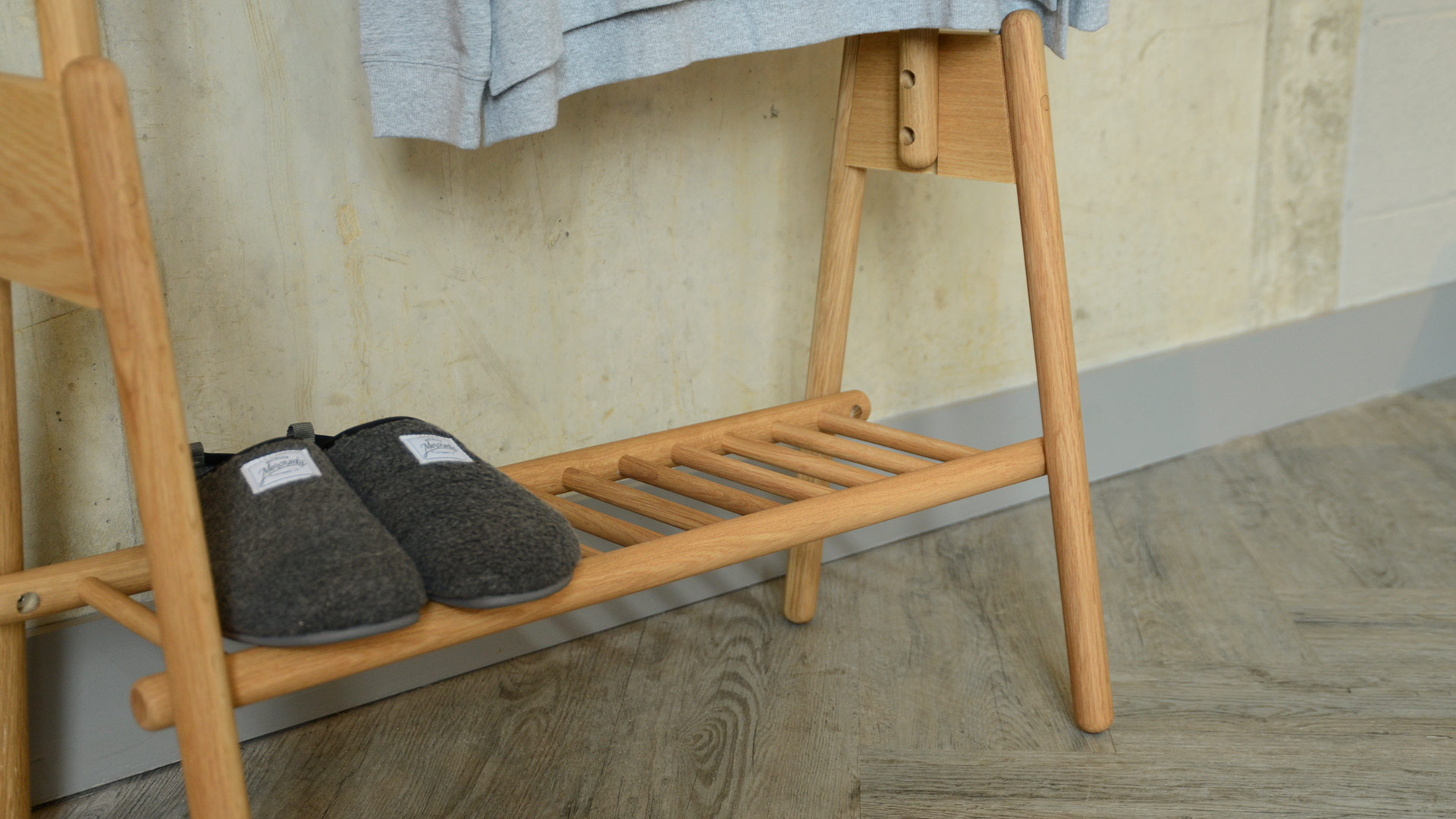 The spindle clothes rail is made with sustainably harvested, solid American white oak. All edges are crisp and modern, but finely hand sanded to make them soft to the touch. Ideal for storing coats, shirts, trousers, dresses and scarves, with a bottom rail that is perfect for storing shoes. There is also plenty of space underneath the bottom rail for more out of the way storage.
