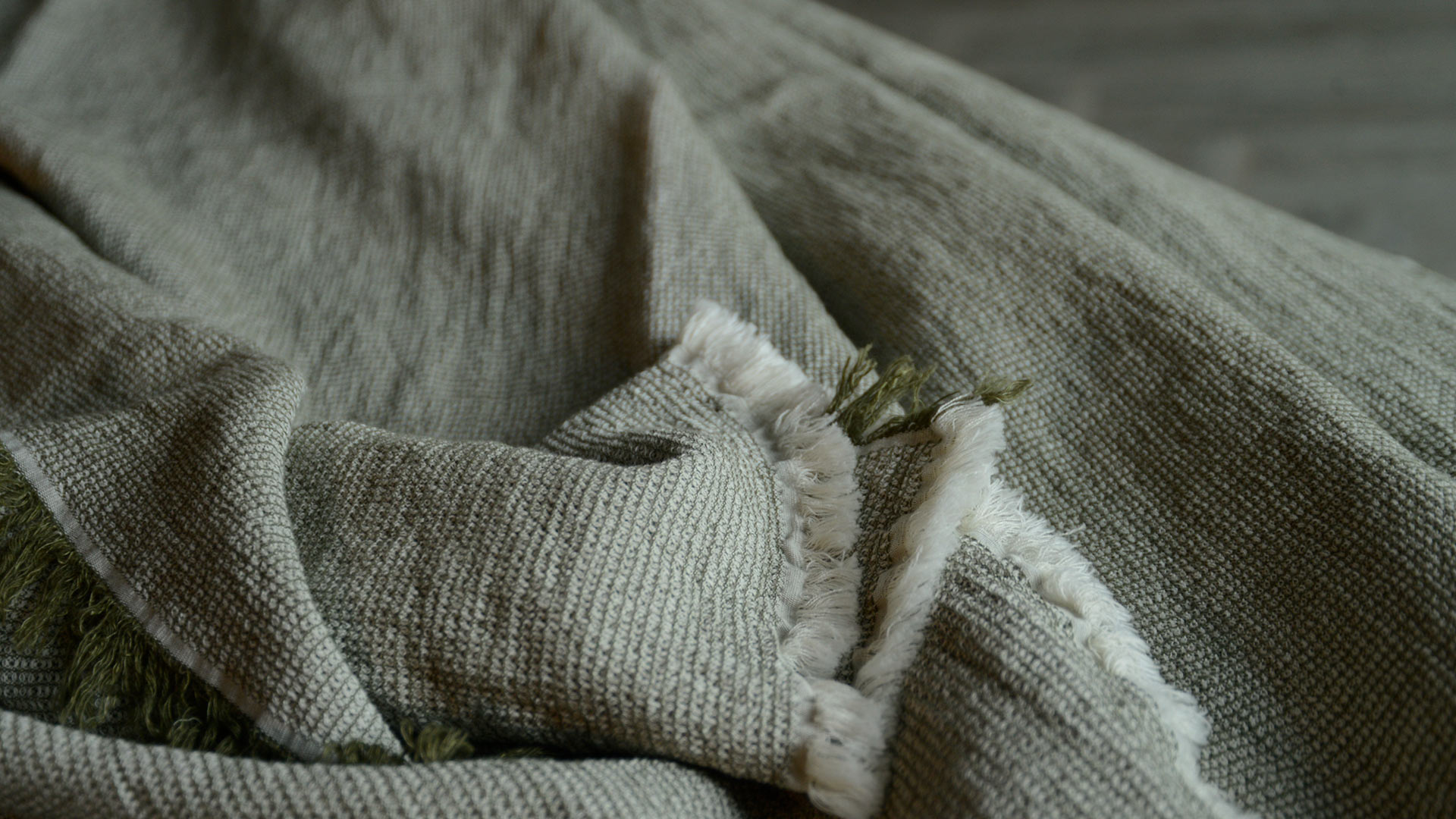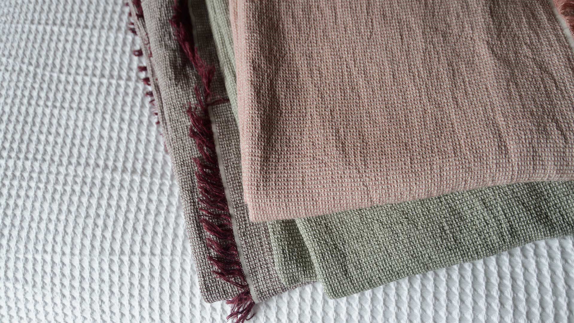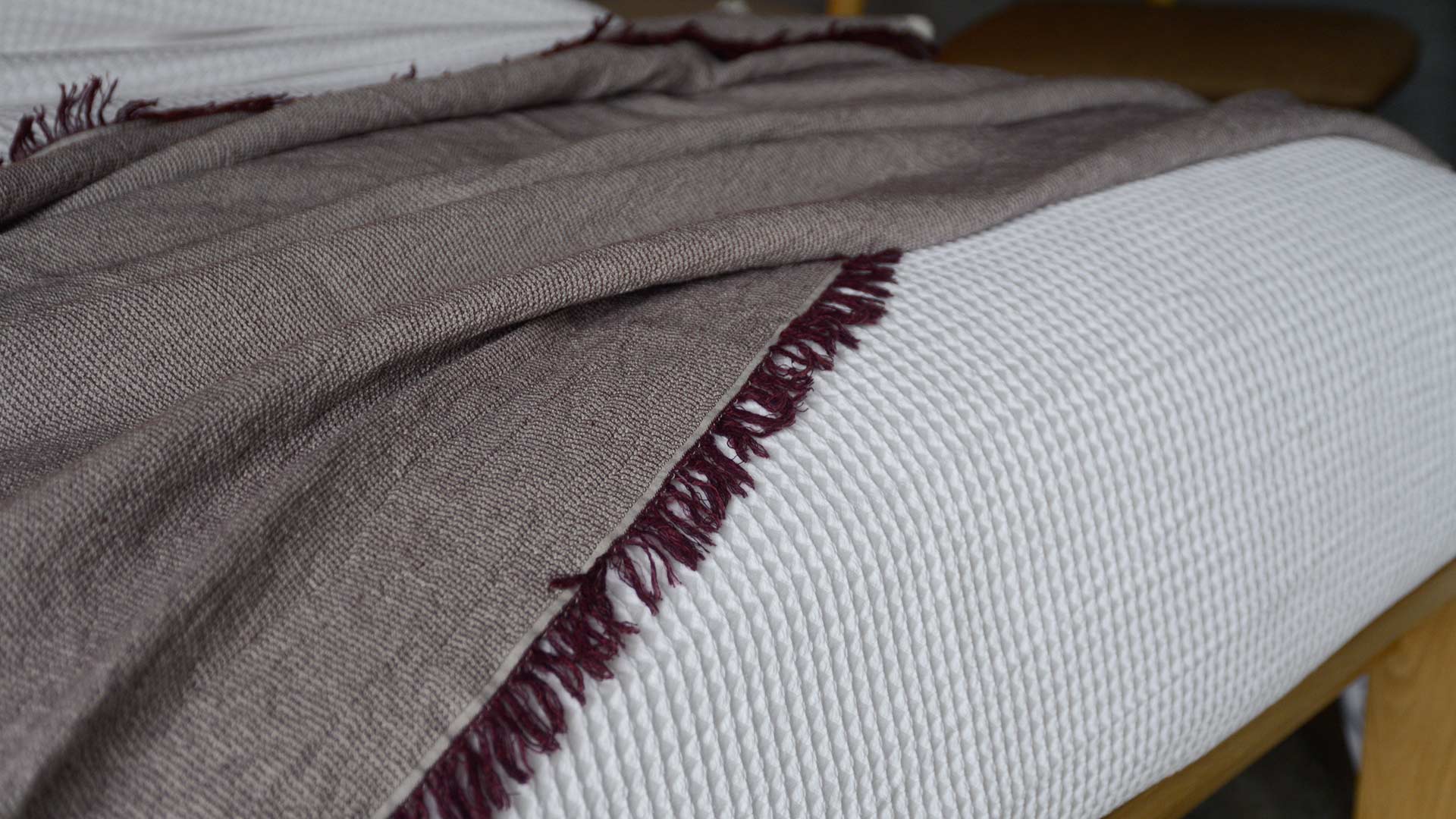 Organic cotton and linen throws with a cosy, woven texture. Available in the following colours: Sage Green – Ivory with warm, olive green threads Wine Red – Ivory with deep burgundy threads Rose Pink – Ivory with soft, dusty pink threads Grey –Â Ivory with silvery grey threads Camel Beige – Ivory with warm yellow threads