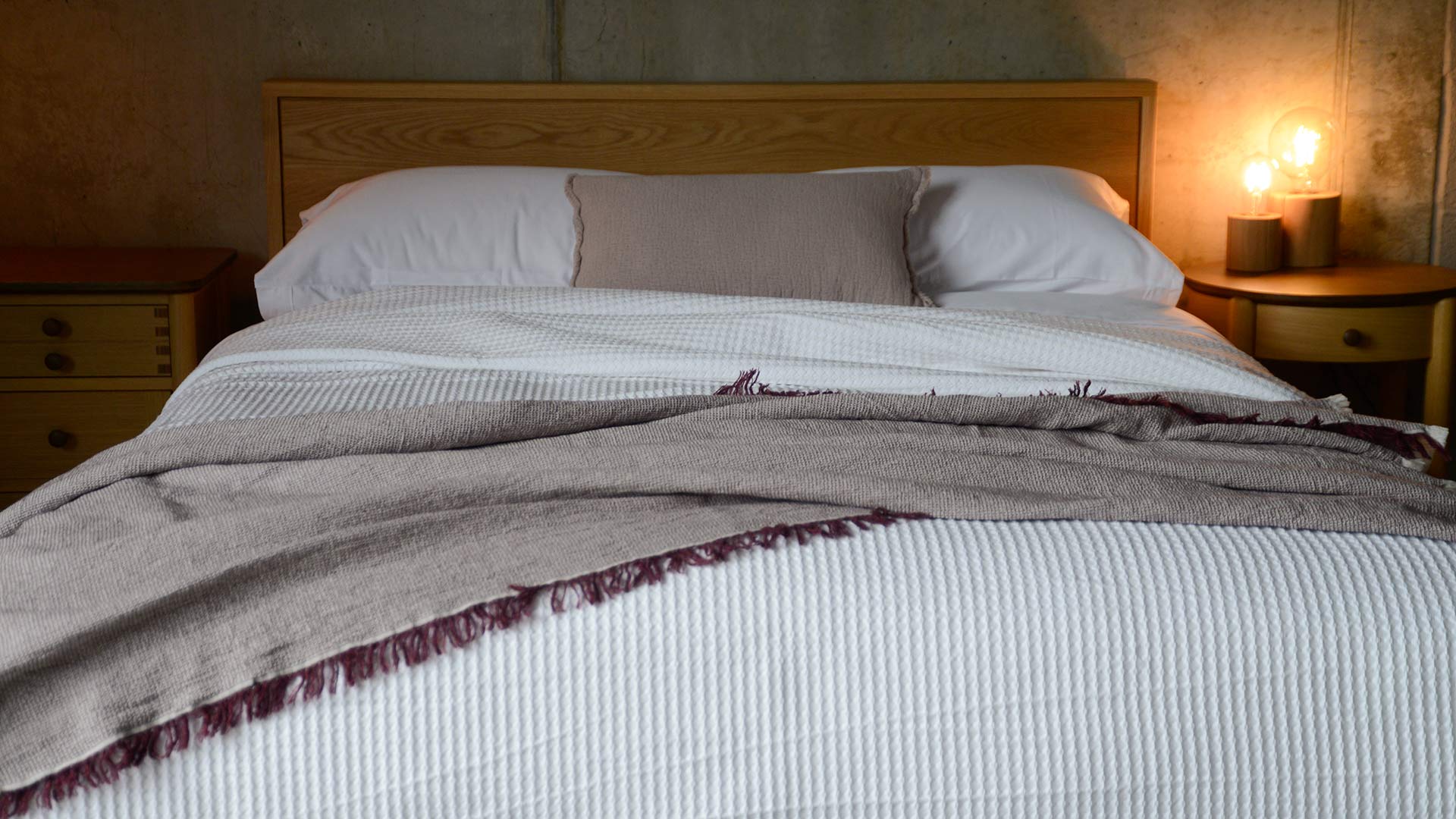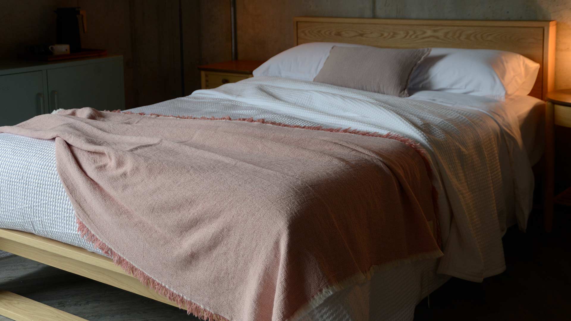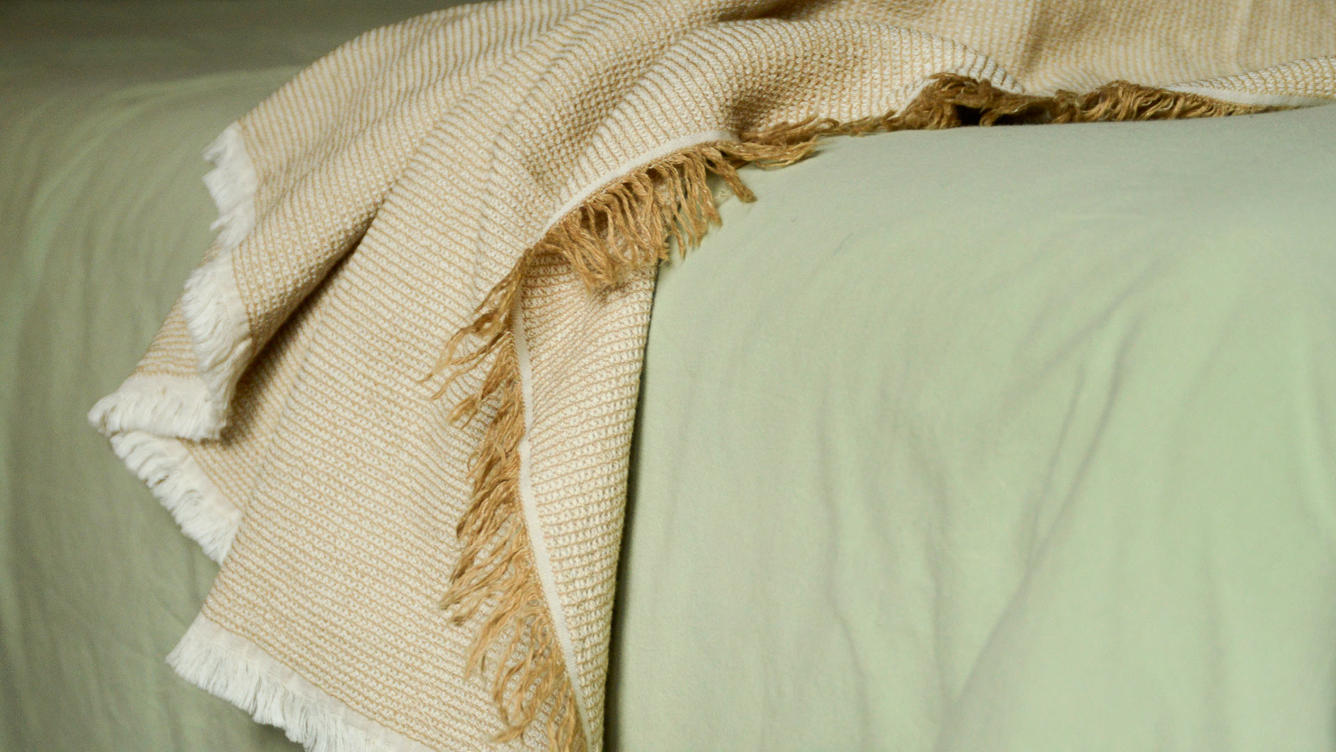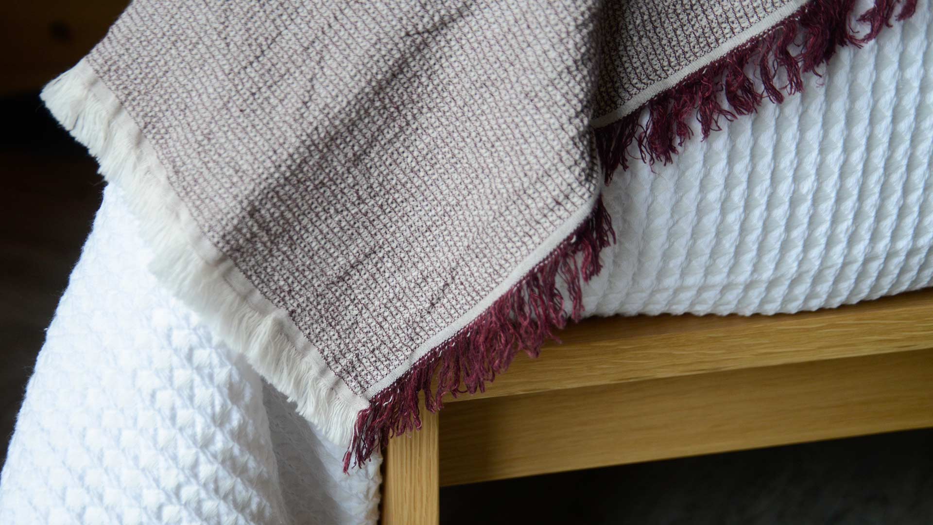 Organic cotton and linen throws with a cosy, woven texture. Available in the following colours: Sage Green – Ivory with warm, olive green threads Wine Red – Ivory with deep burgundy threads Rose Pink – Ivory with soft, dusty pink threads Grey –Â Ivory with silvery grey threads Camel Beige – Ivory with warm yellow threads