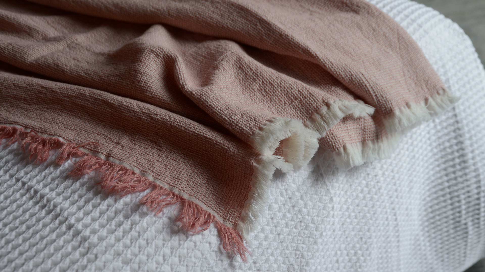 These stylish, organic cotton and linen blend throws are available in three colour-ways: subtle sage green, deep wine red and soft rose pink – all blended with ivory. These cosy, organic cotton and linen throws are perfect for adding texture. Drape over the back of the sofa, or along the end of the bed. Complete with short eye lash fringes with each colour represented to two sides which draws attention to the two colours. A woven, textured blend of threads, these make a subtle statement whilst still being perfect for cosying up on the sofa. 100% organic cotton and linen.