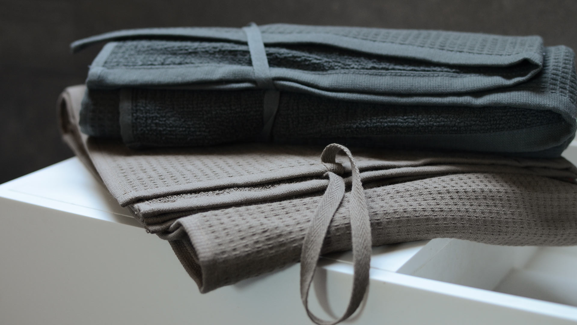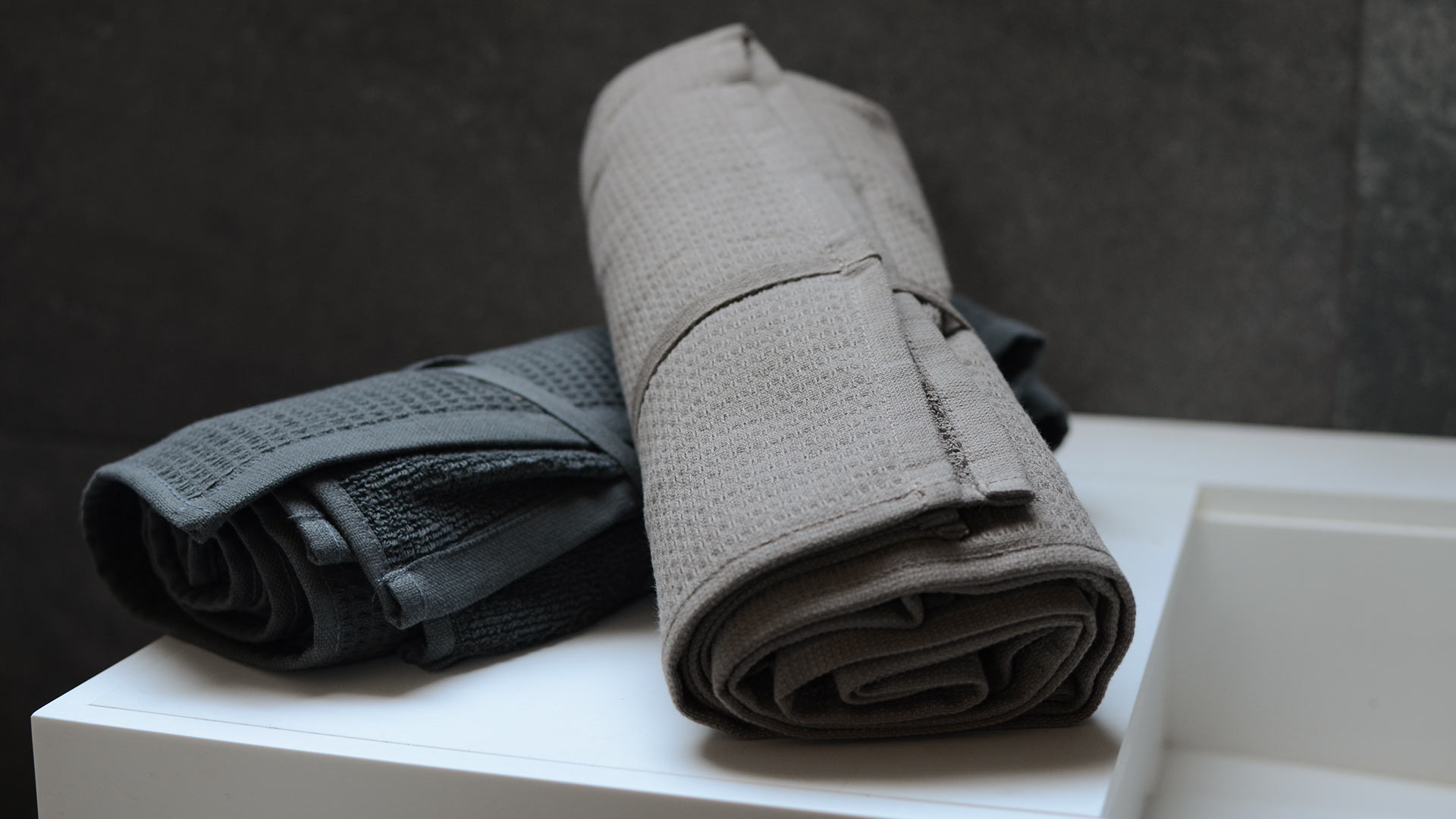 These stylish travel towels are made of 100% organic cotton in dark anthracite grey or a warm taupe ‘clay’ colour. A soft terry finish to one side and a smart woven finish to the reverse. These towels can be rolled and secured using a fixed loop, keeping them tidy and compact. Each towel is 60 x 120cm in size.
