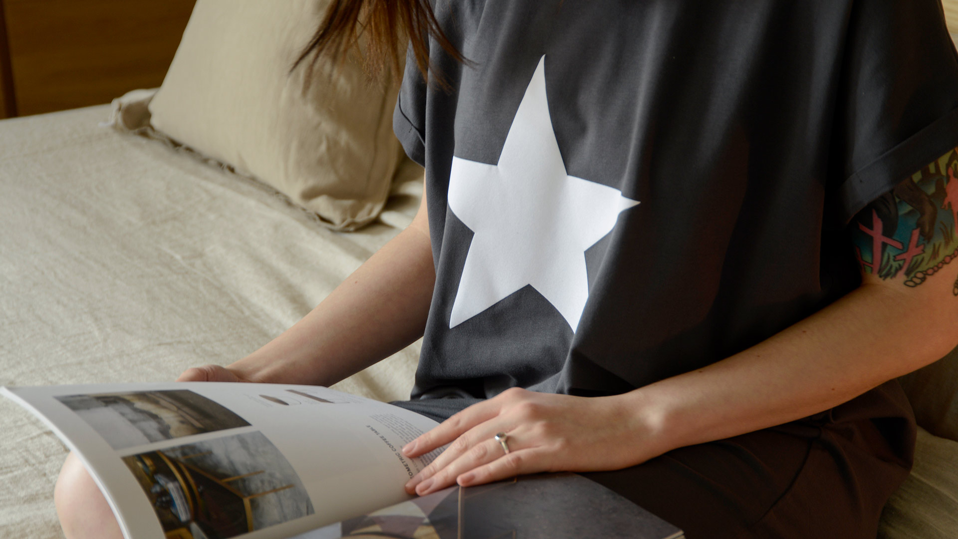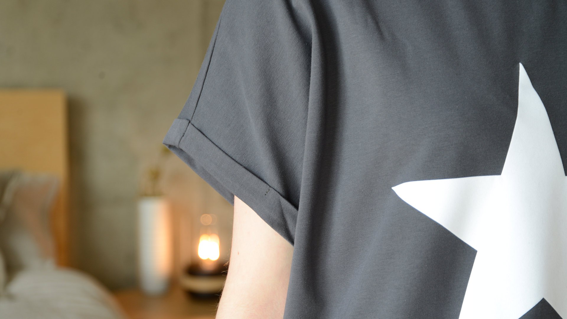 Part of our relaxed, luxury lounge-wear collection – organic cotton jersey T-shirt dresses in the following options: Black – £55.00 Warm Grey – £55.00 Charcoal + a large white star print – £59.00 Warm Grey + a large navy star print – £59.00