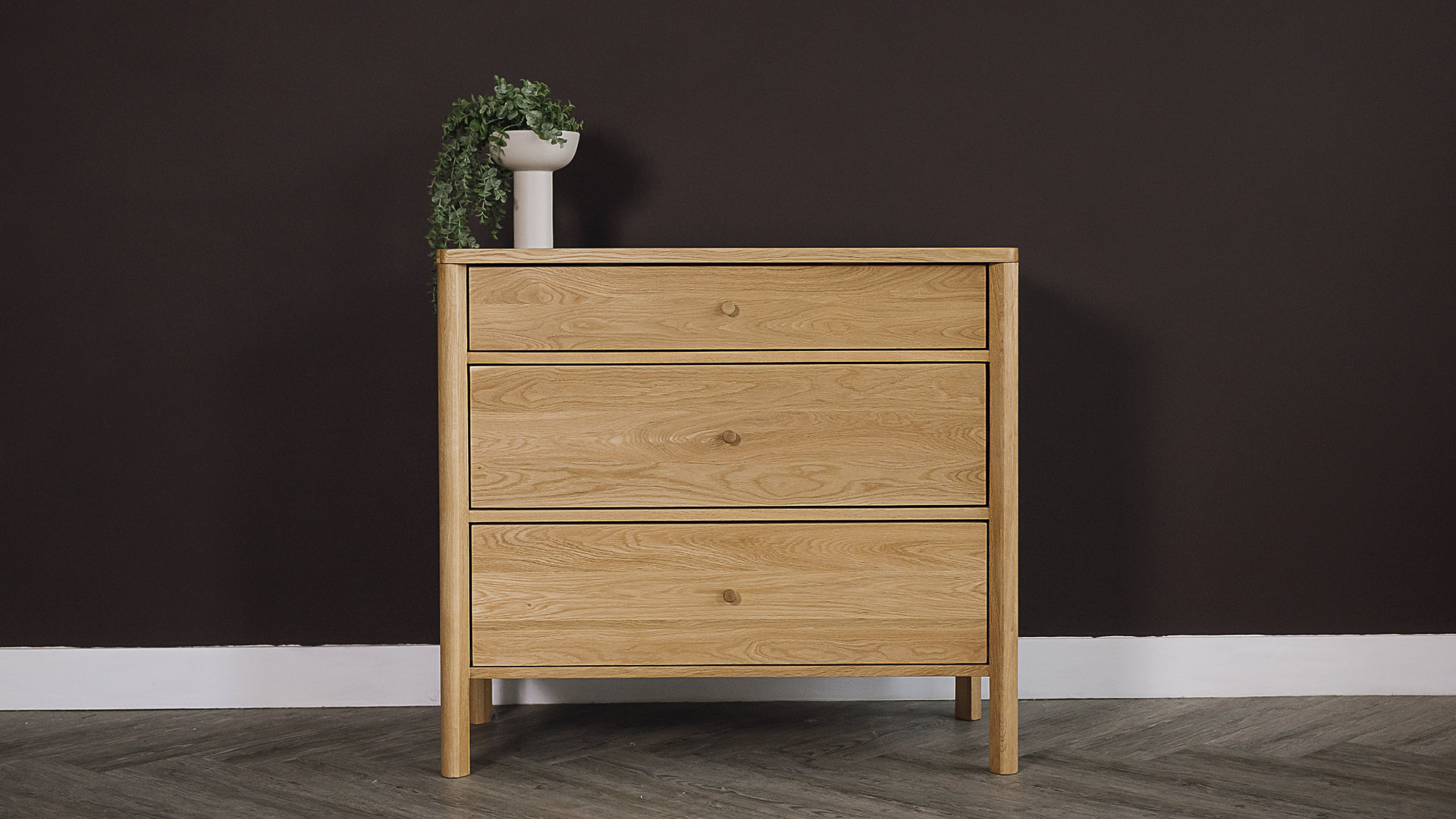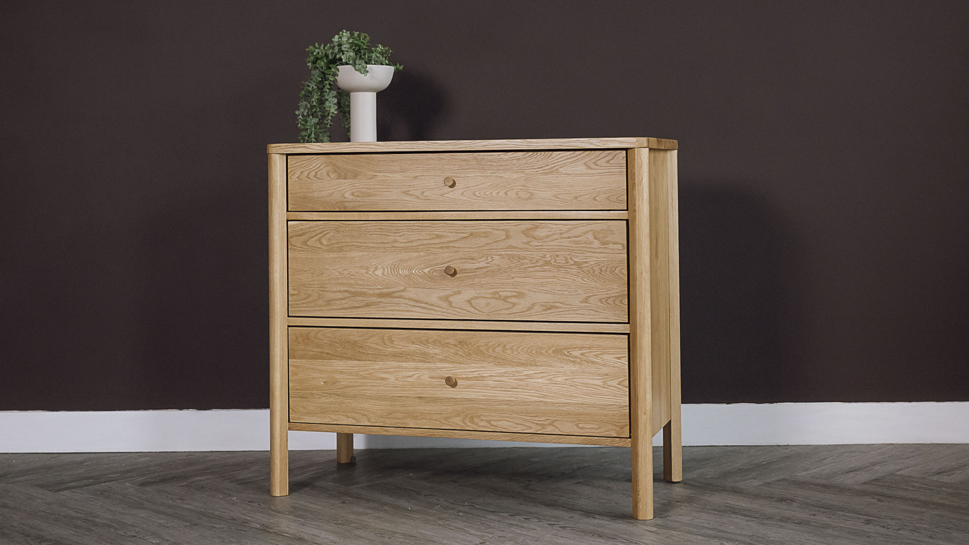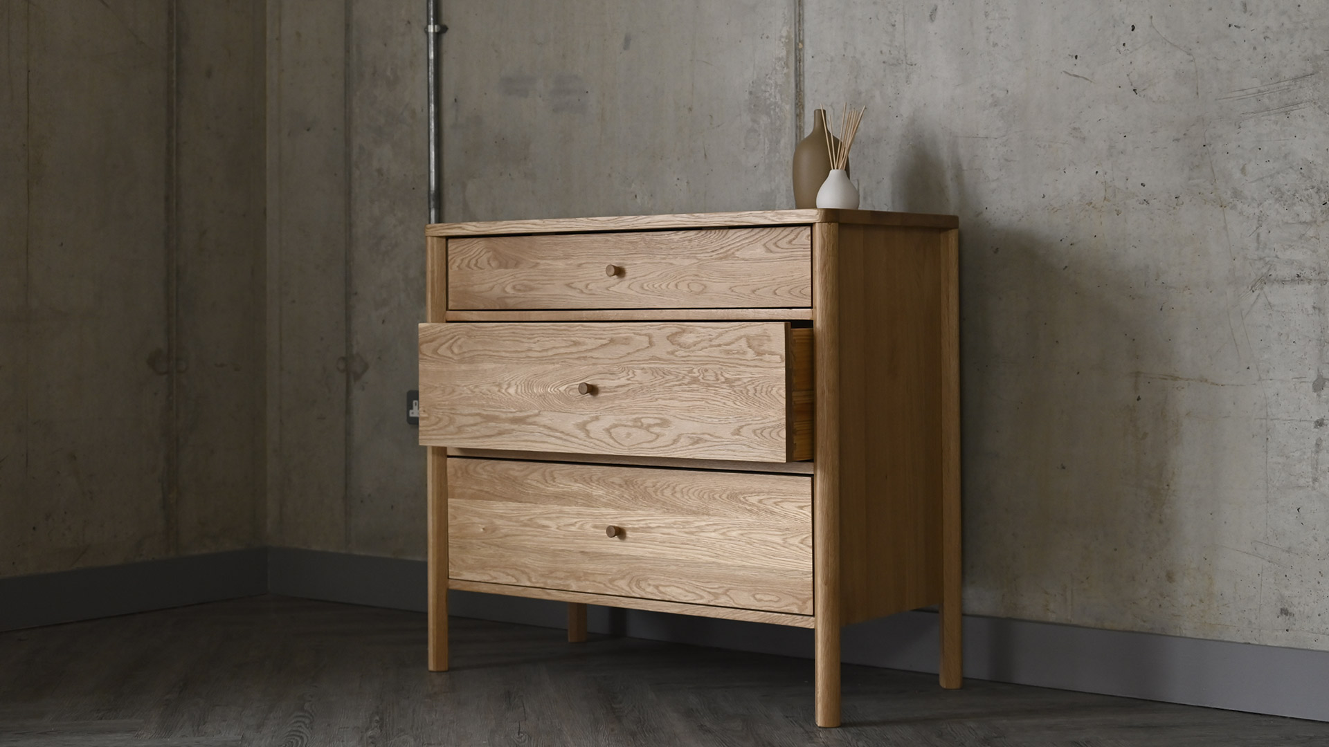 This mid-century style oiled oak chest of drawers offers ample storage across its three drawers. Perfect for storing accessories, clothing or books, this three-drawer chest offers wide, deep drawers to help keep your room tidy. It would also be suited for use in a hall or lounge if you require additional storage.