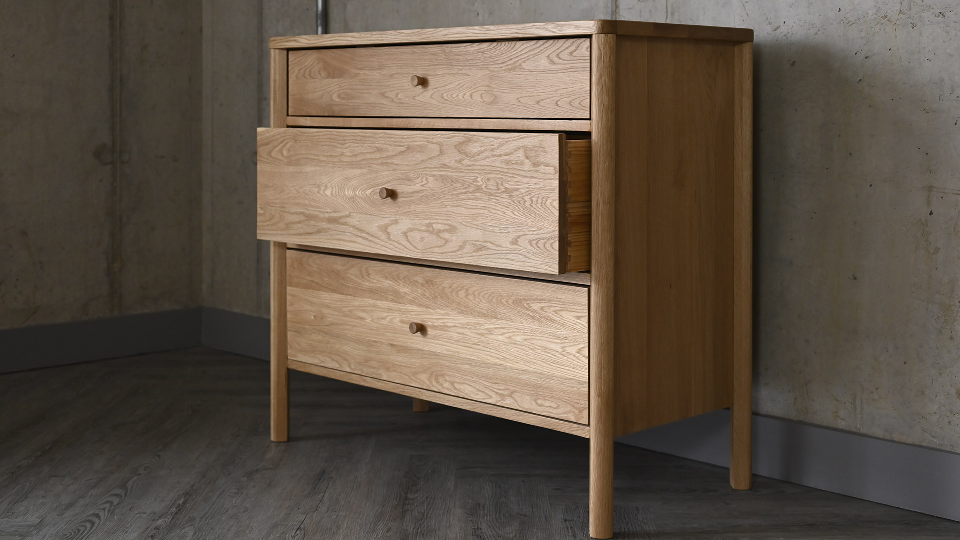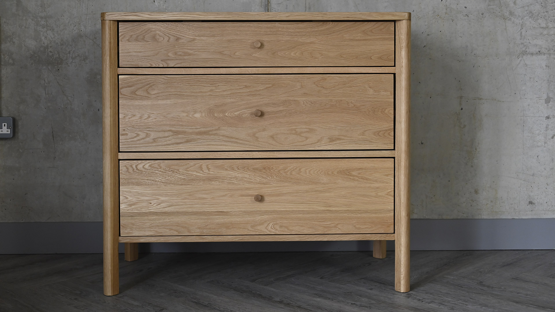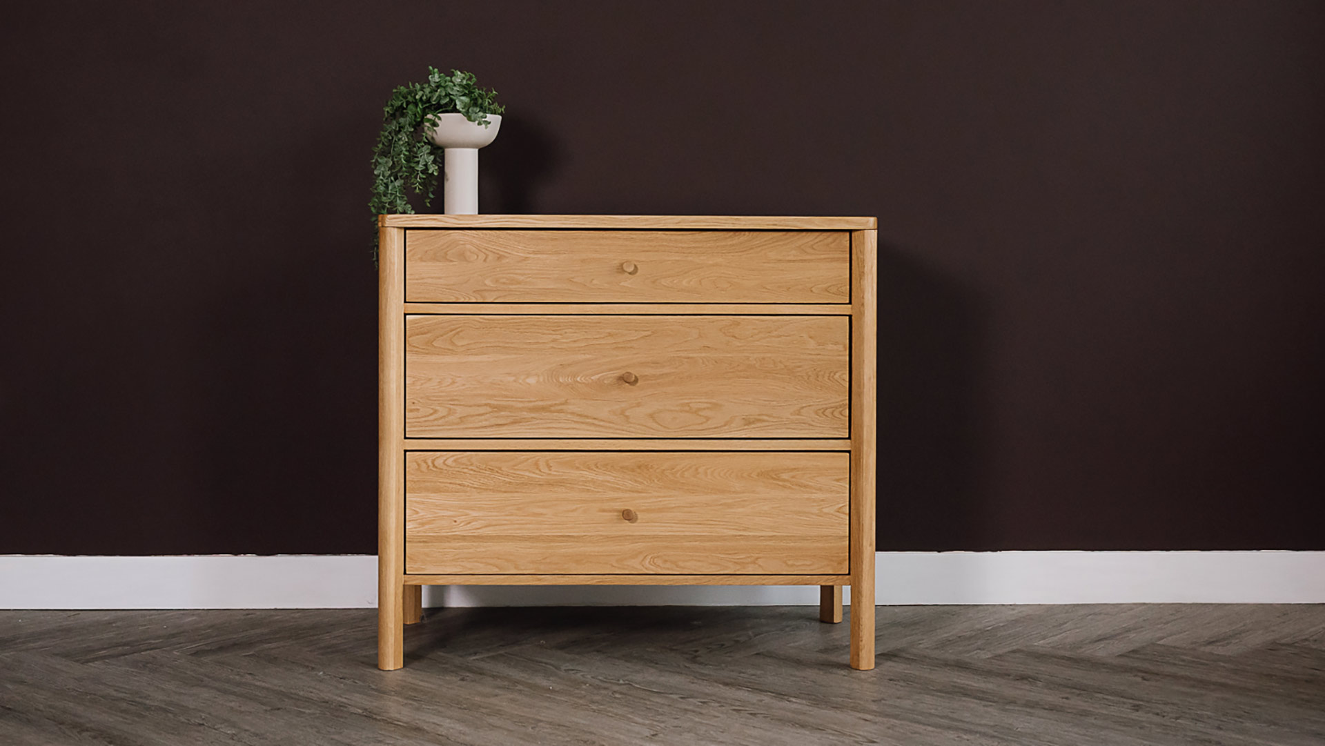 This mid-century style oiled oak chest of drawers offers ample storage across its three drawers. Perfect for storing accessories, clothing or books, this three-drawer chest offers wide, deep drawers to help keep your room tidy. It would also be suited for use in a hall or lounge if you require additional storage.