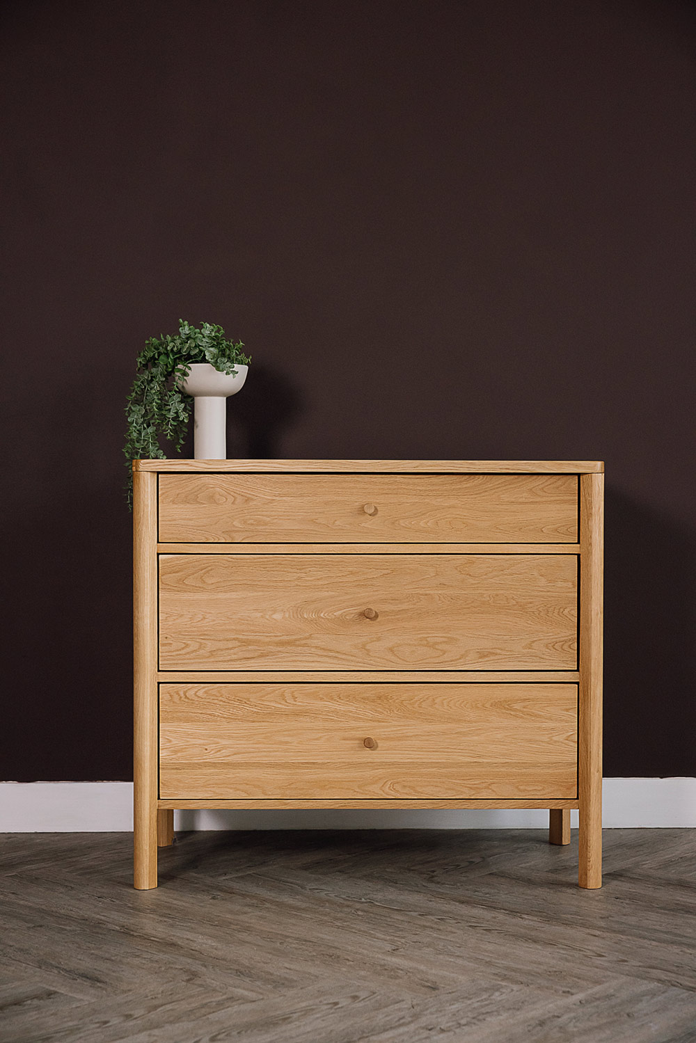The Oslo oiled oak chest of drawers has a classic mid-century style, featuring rounded legs and a warm-toned finish. Its three drawers provides ample storage for the bedroom, hall or living room.