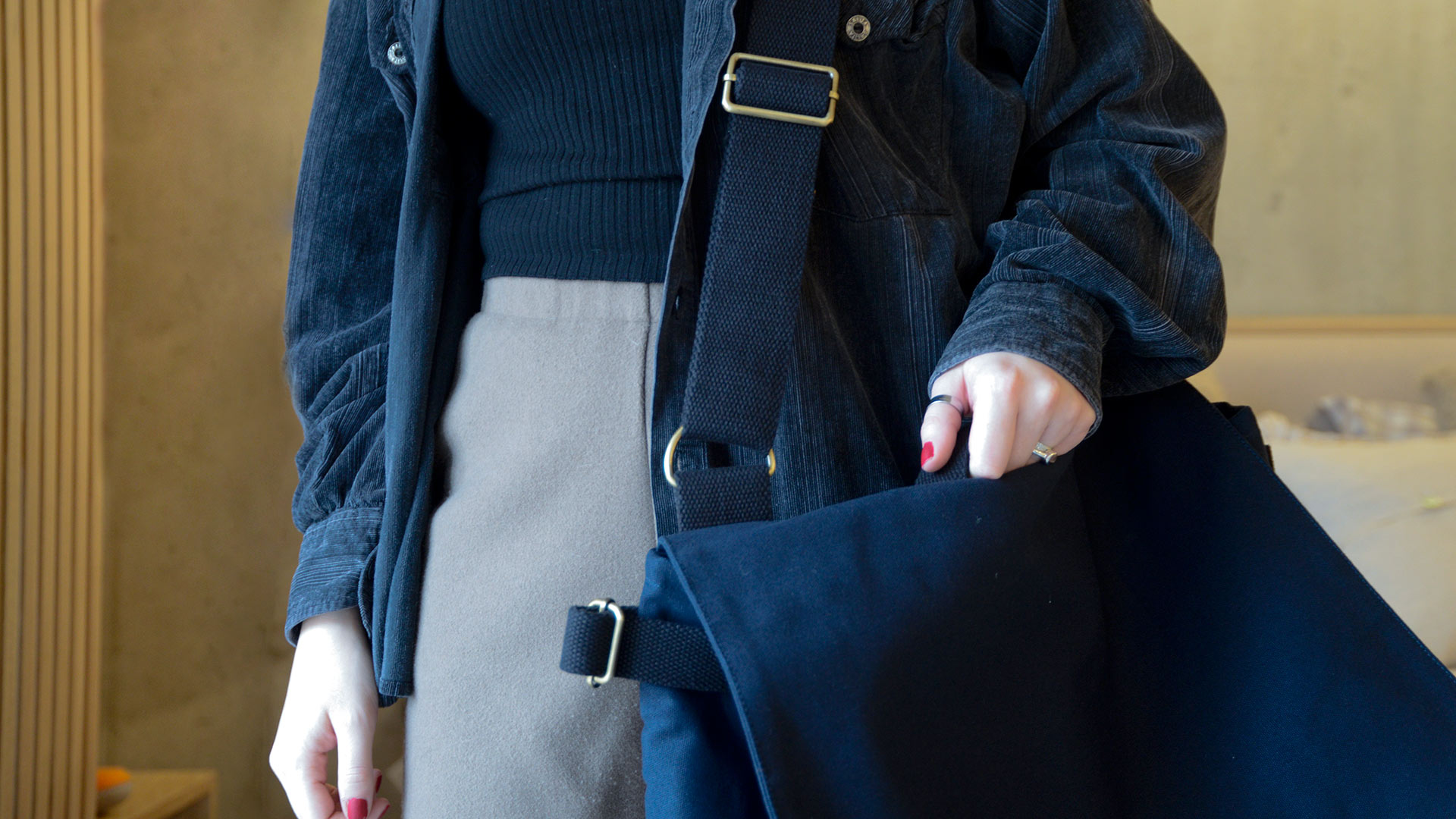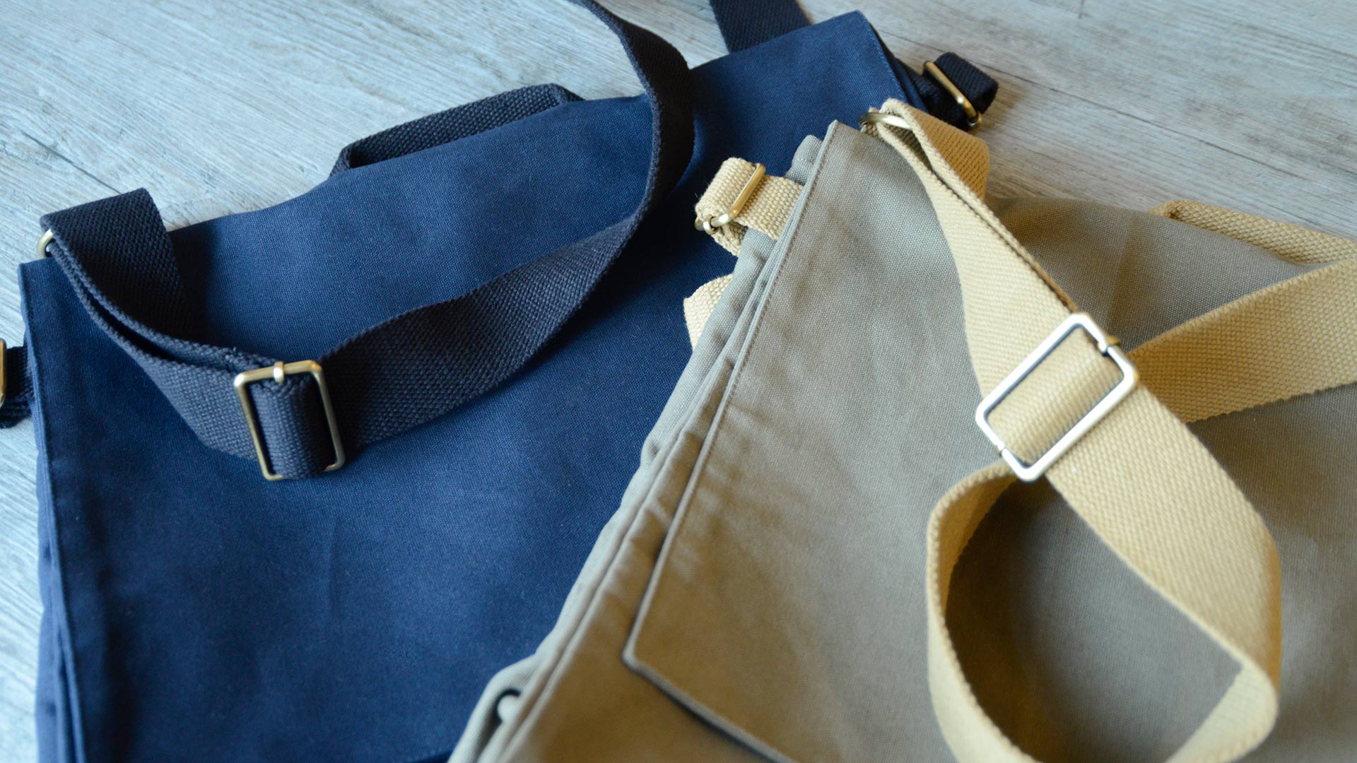 A range of oversized organic cotton satchel bags, available in either a dark navy blue, or a stylish mid khaki. Each has chunky handles and hardware in matching colours. You can also order matching mini purses in the same colours.