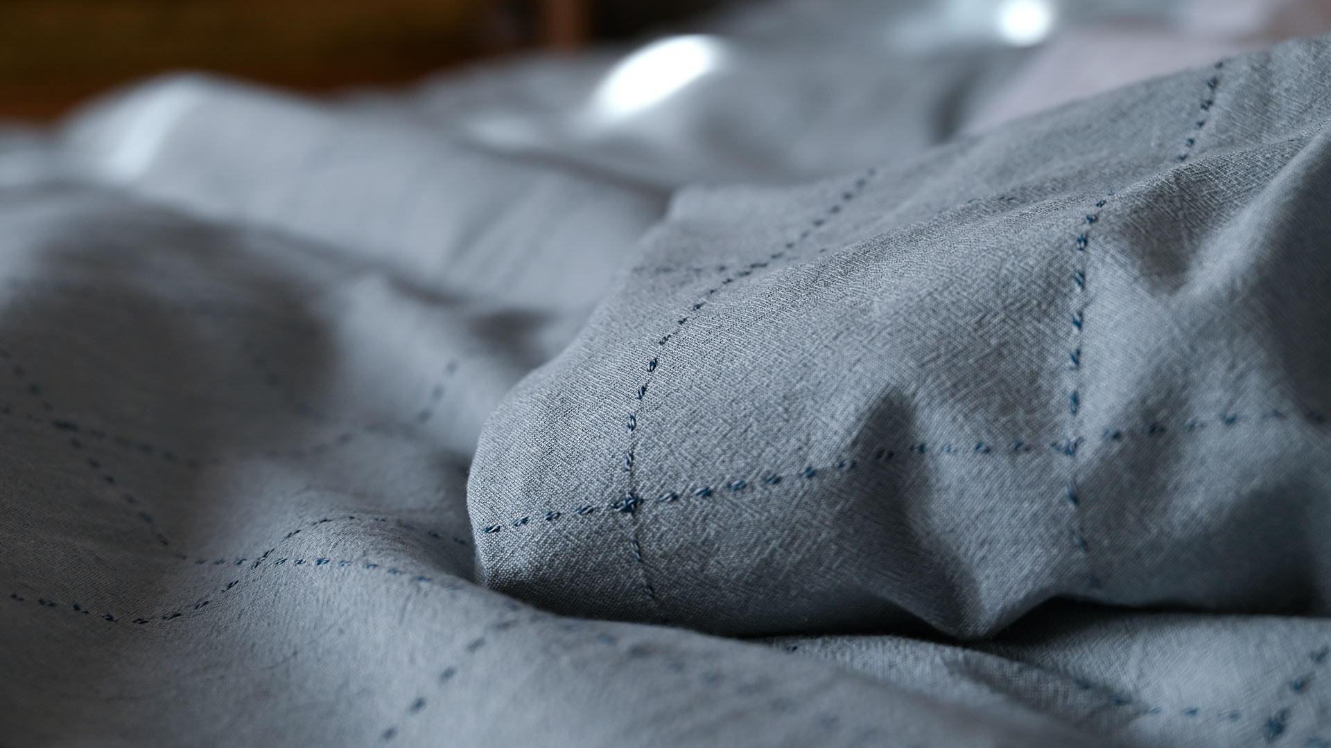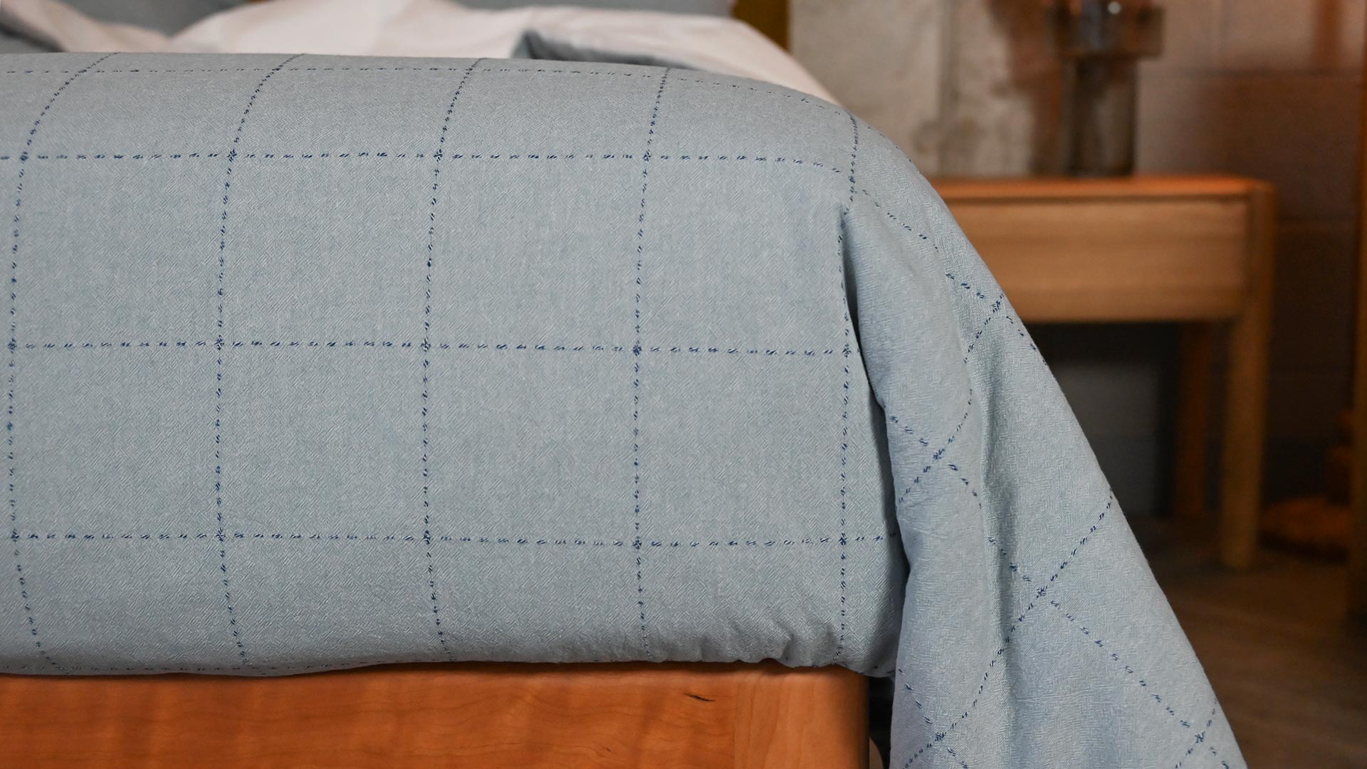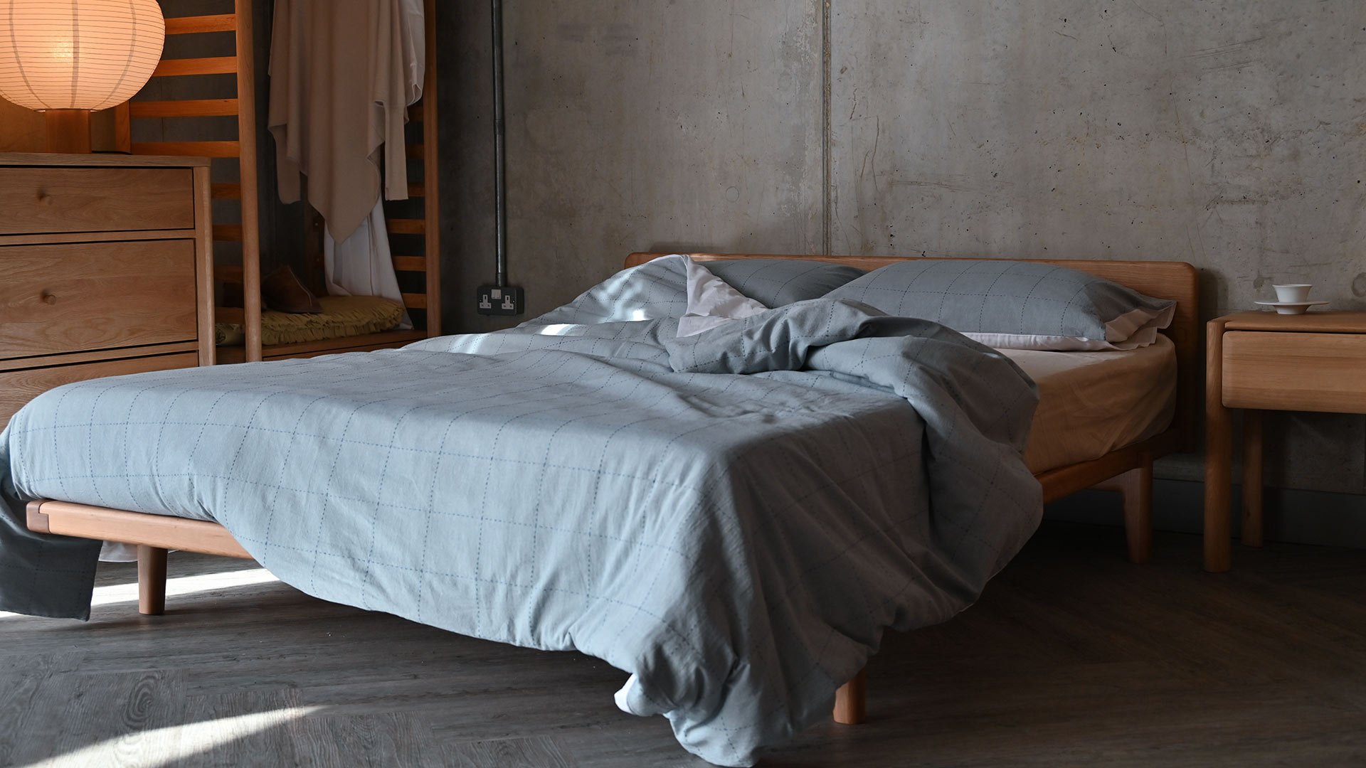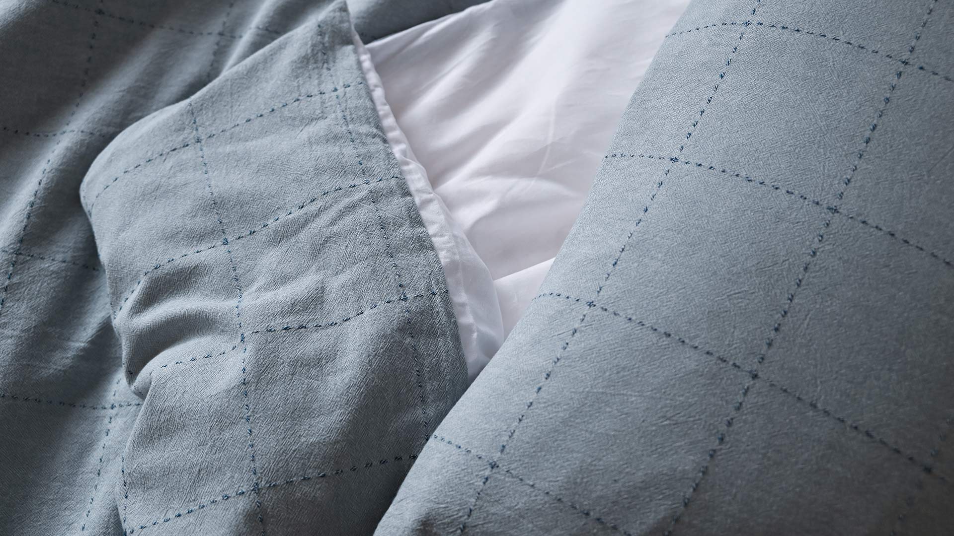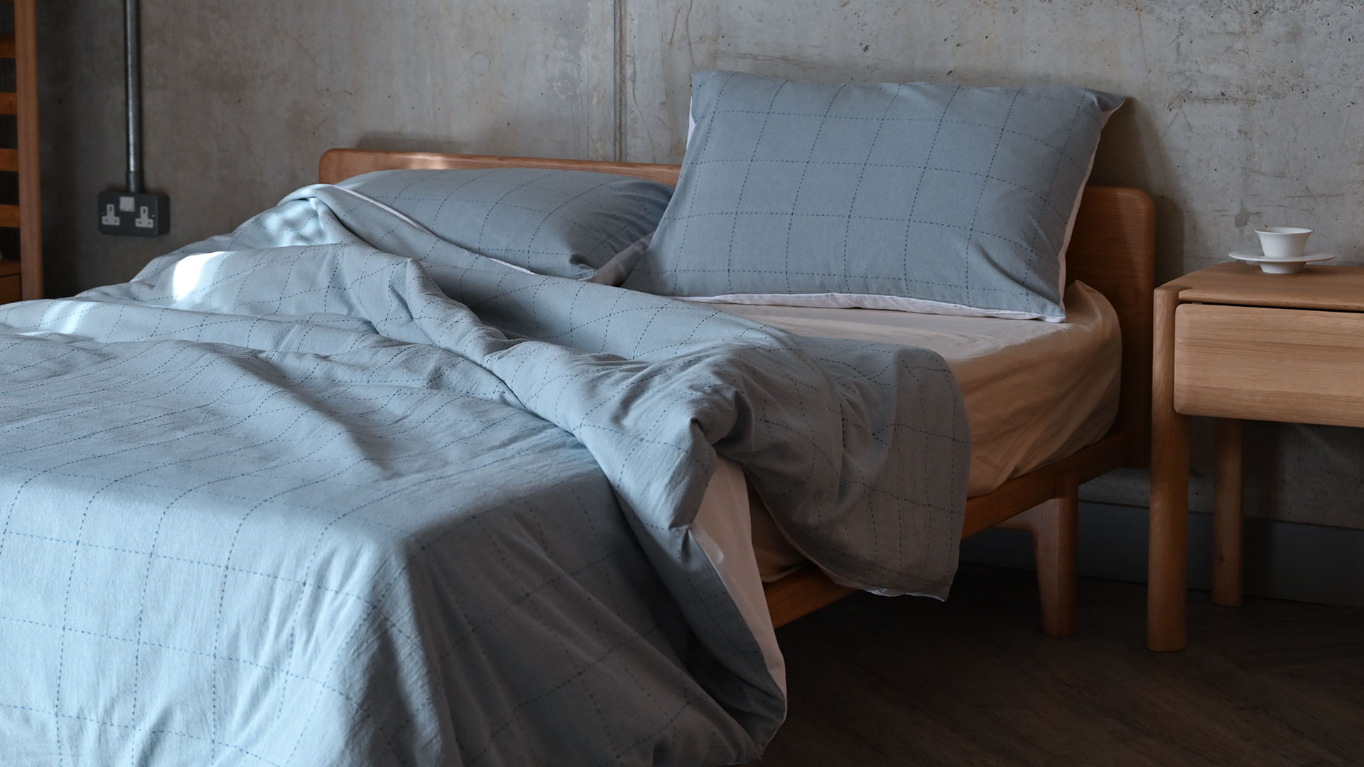 With a gentle texture and effortless style, this cotton duvet set features a subtle pattern in a timeless colour palette. Lightweight and breathable, made from 100% cotton, with a plain white reverse. With a relaxed look and soft pale blue shade, woven with darker blue squares to the front.