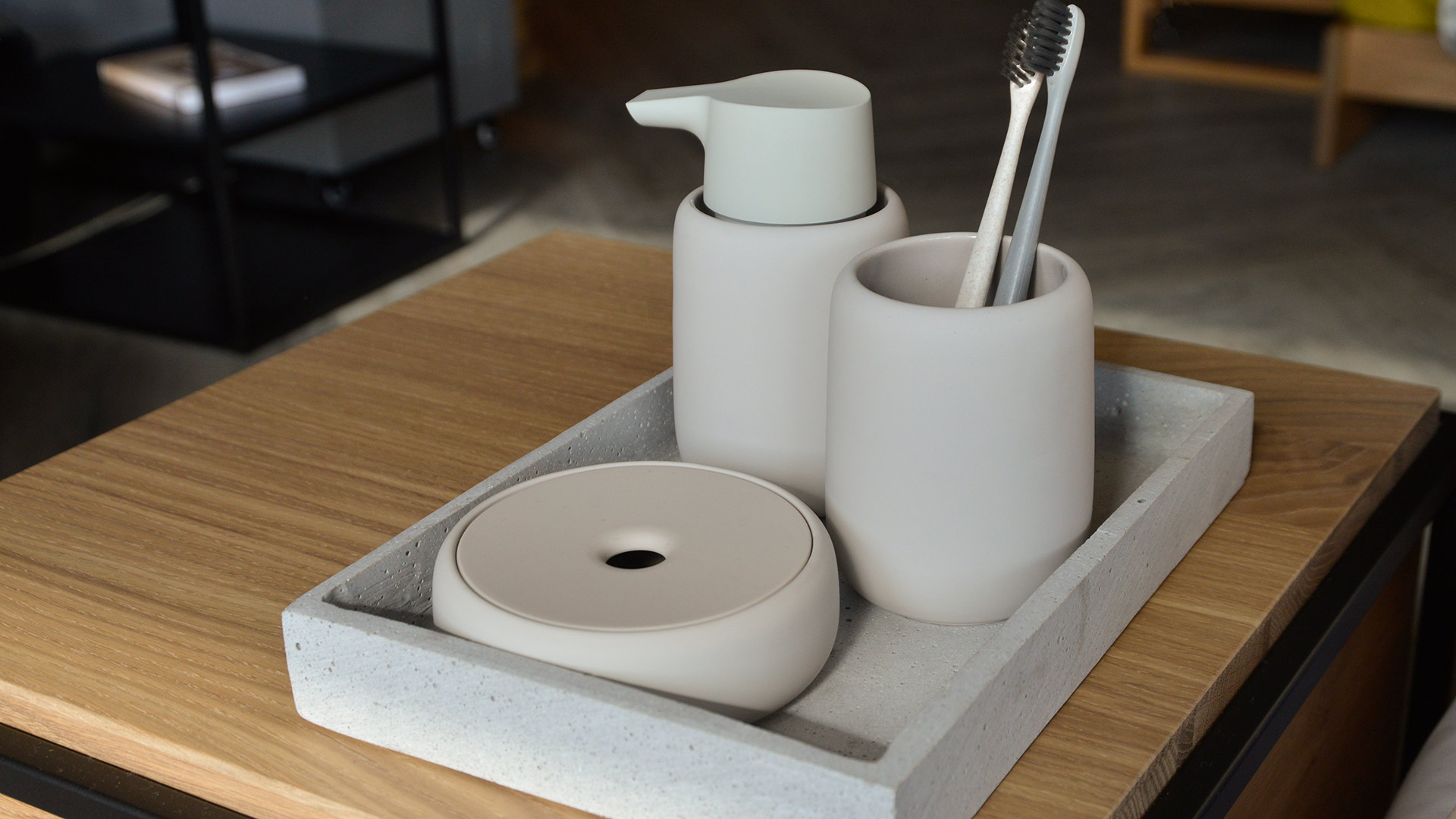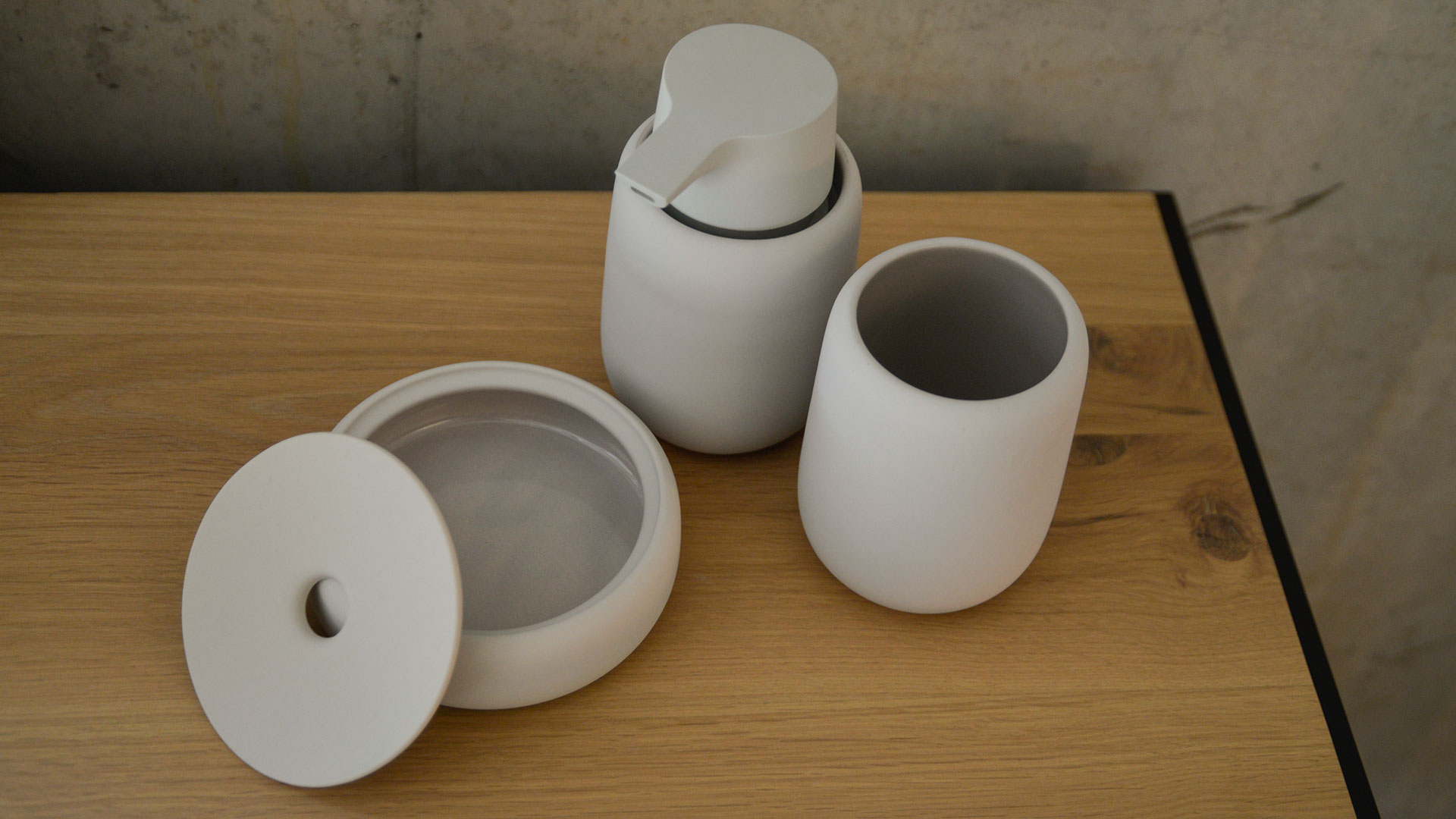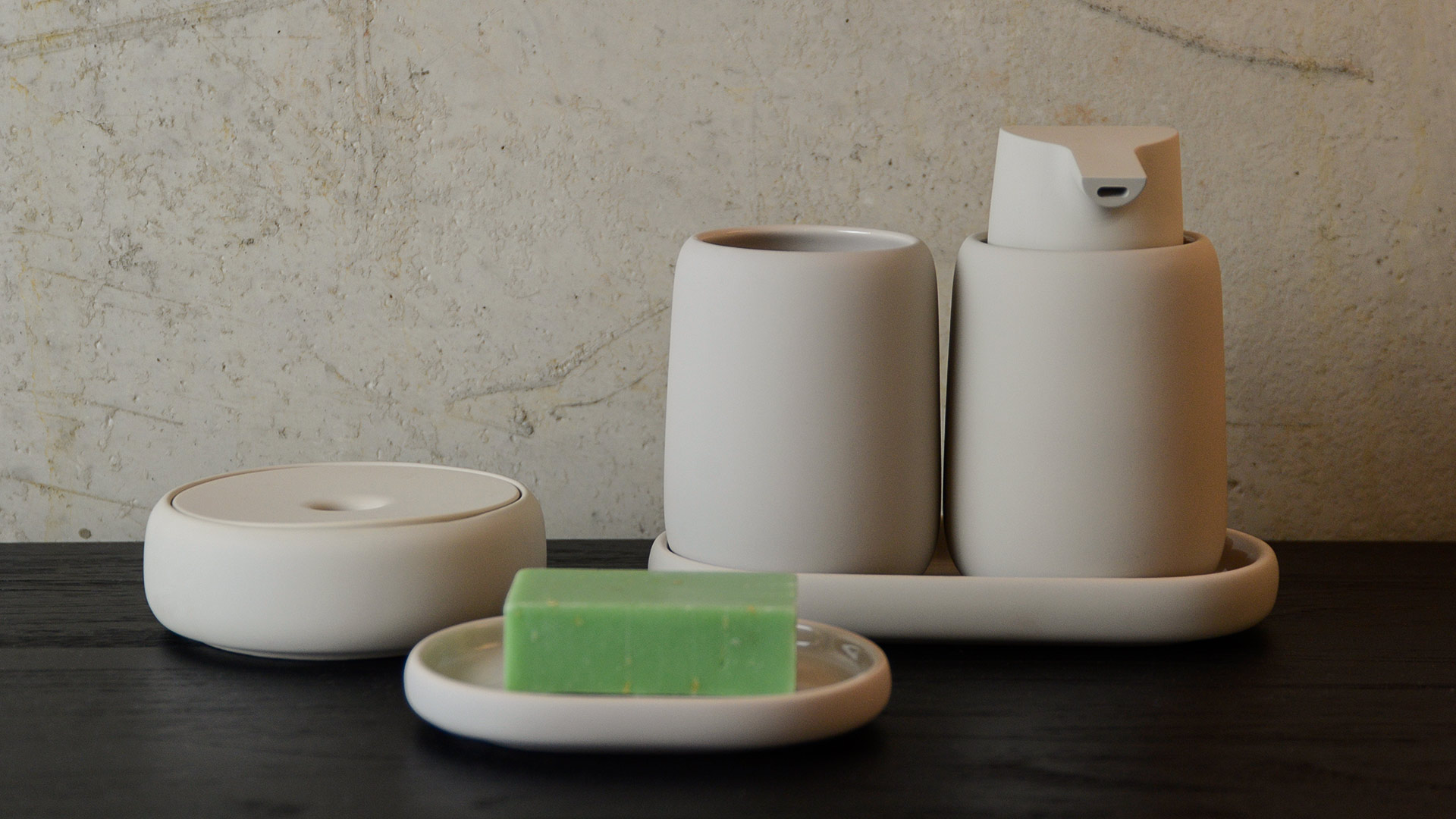 A collection of sophisticated bathroom accessories with a pleasing soft touch finish. The collection includes: – pump soap dispenser – tumbler/toothbrush holder – small storage box/soap dish – ovoid ceramic storage tray – ceramic soap dish