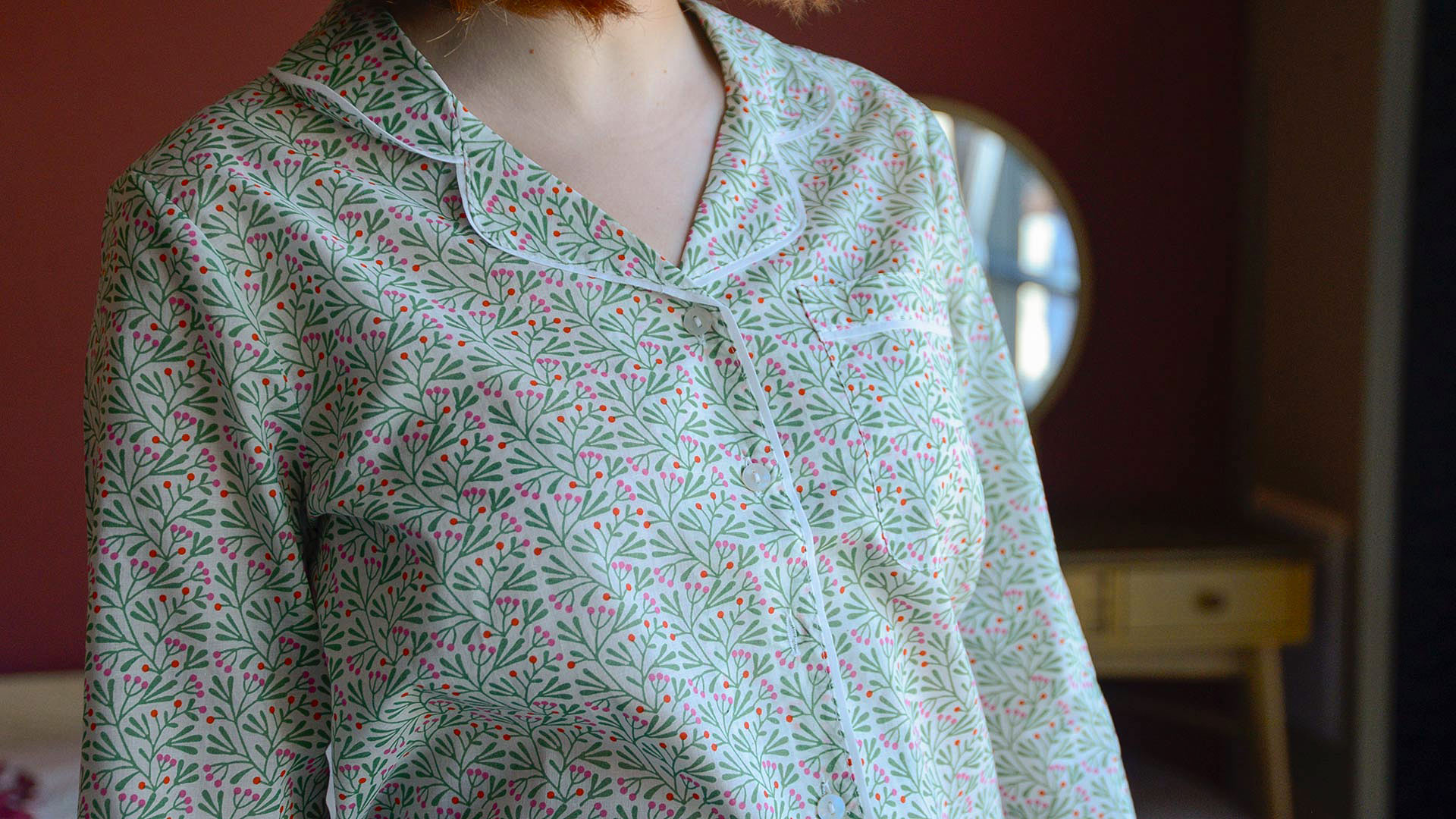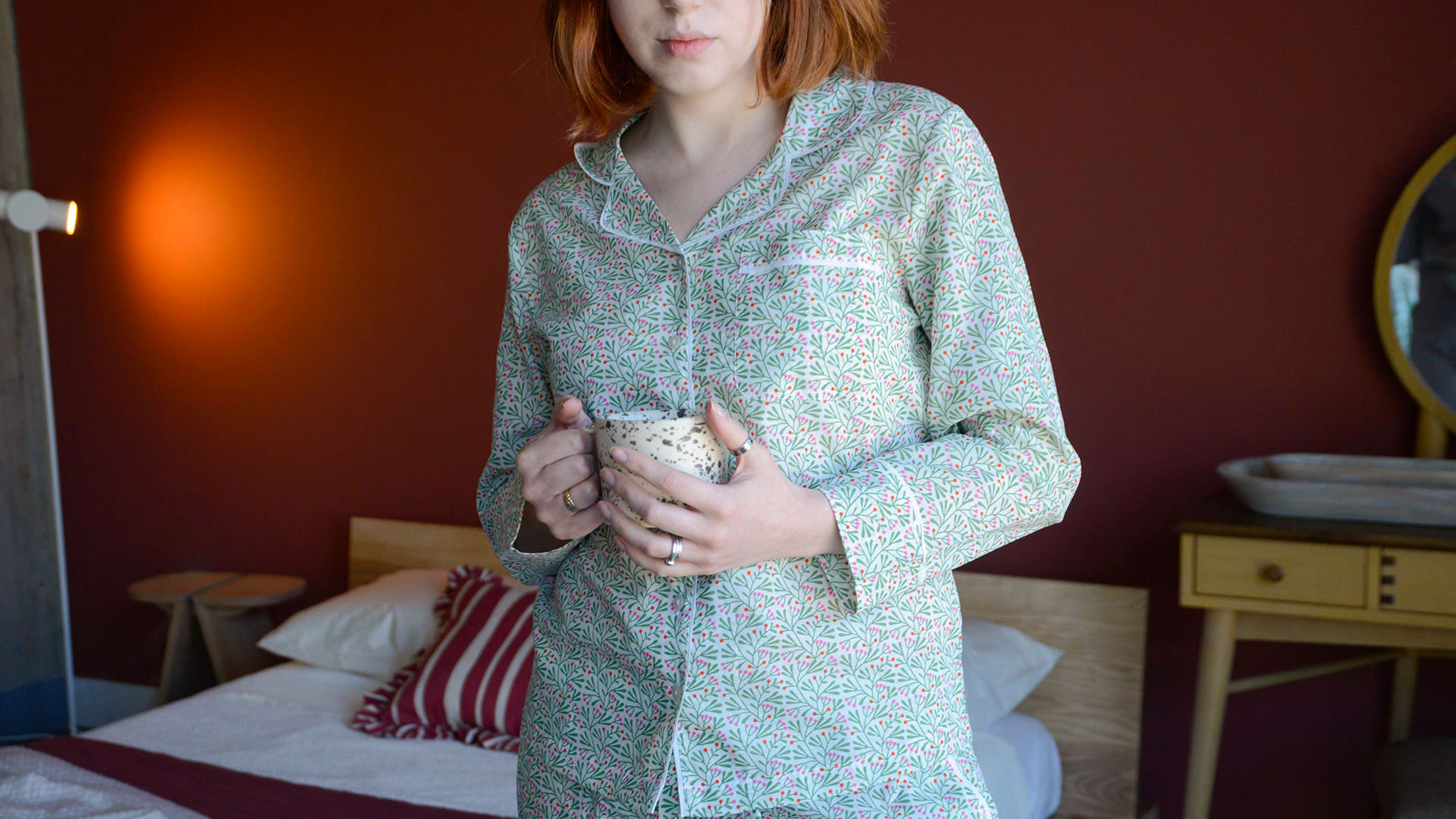 Soft cotton pyjamas featuring a pale green frond print, featuring pink and red floral buds. Made from 100% cotton.