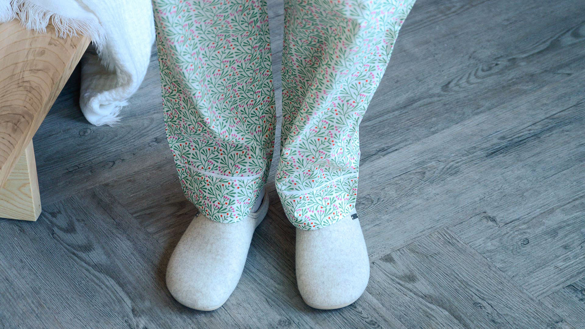 Lightweight pale green frond pyjamas, made from pure cotton. This pyjama set has a white background and a cute and colourful floral pattern. The wrist and leg cuffs and collar have a thin white trim border. These pale green frond pyjamas feature handy pockets and an elasticated waist on the pyjama bottoms, along with pearlescent buttons and a waist tie.