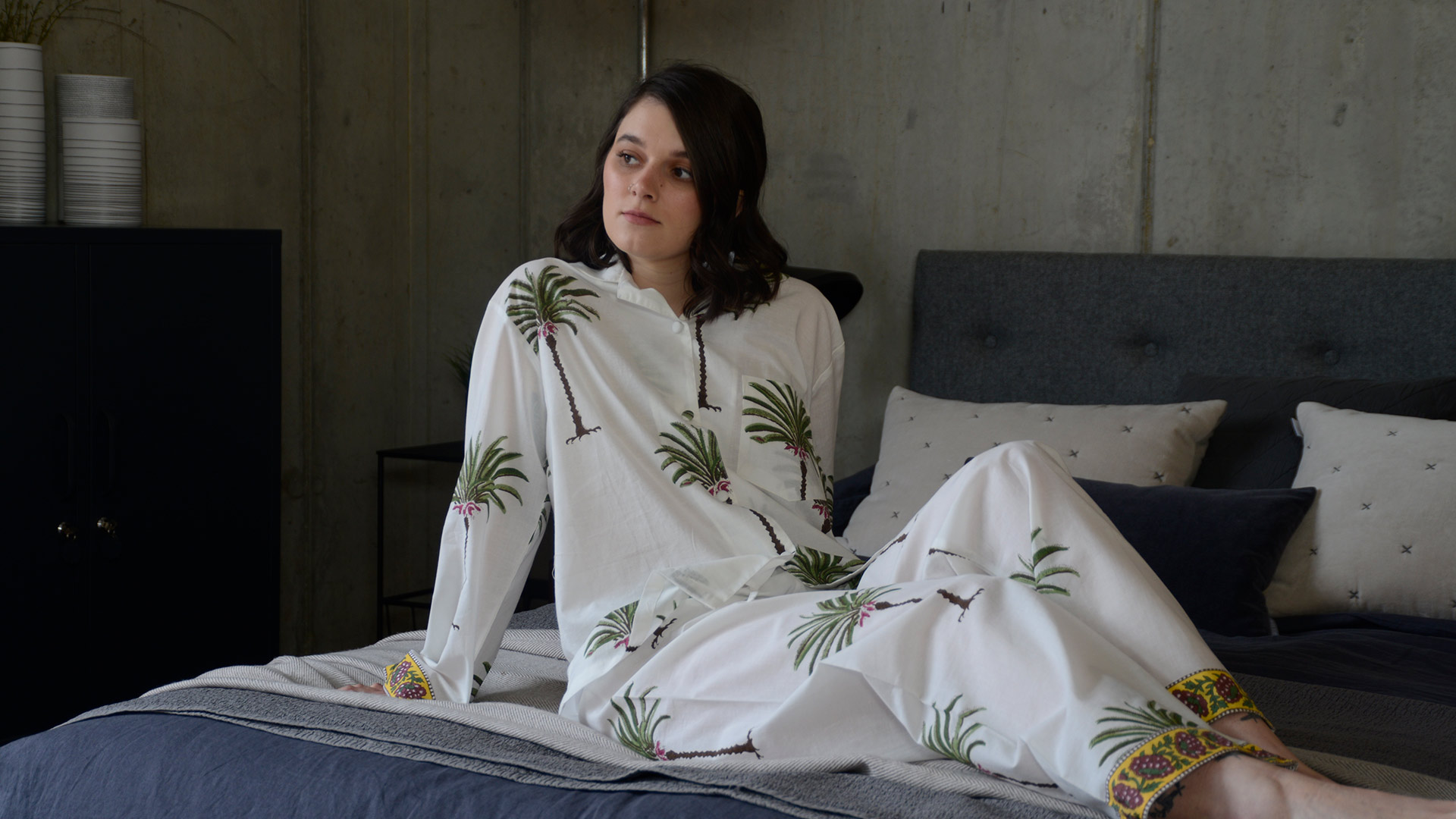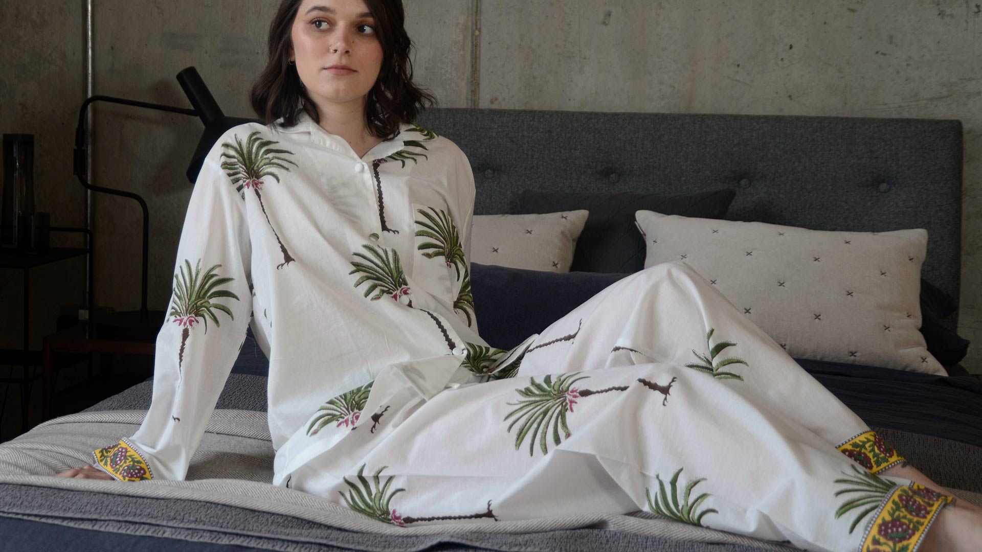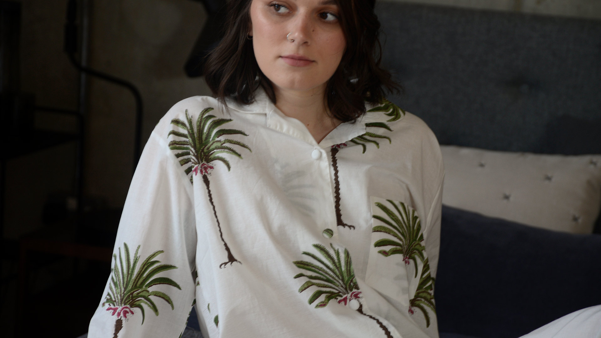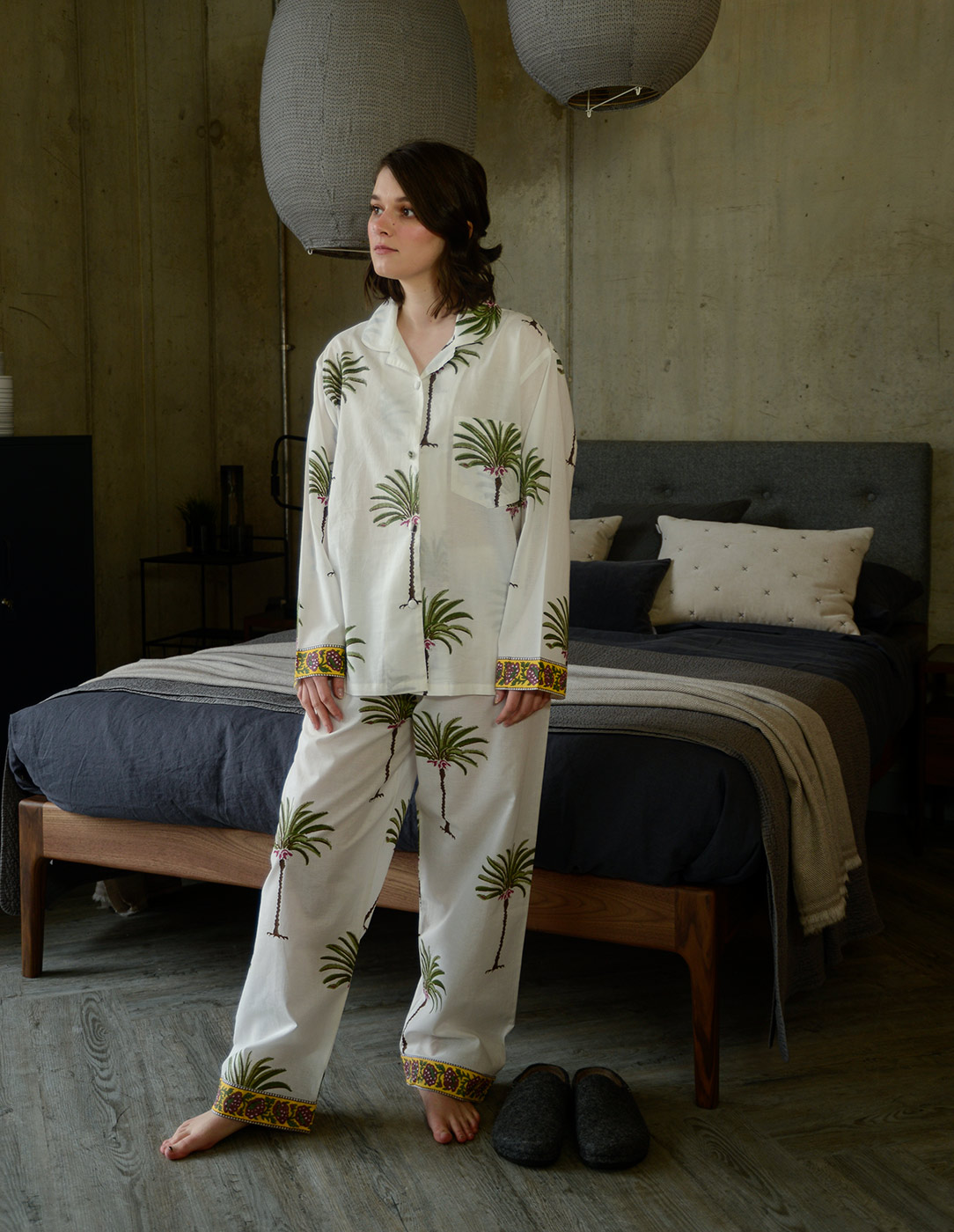 Lightweight soft cotton pyjamas with a bold print of palm trees over an ivory background.