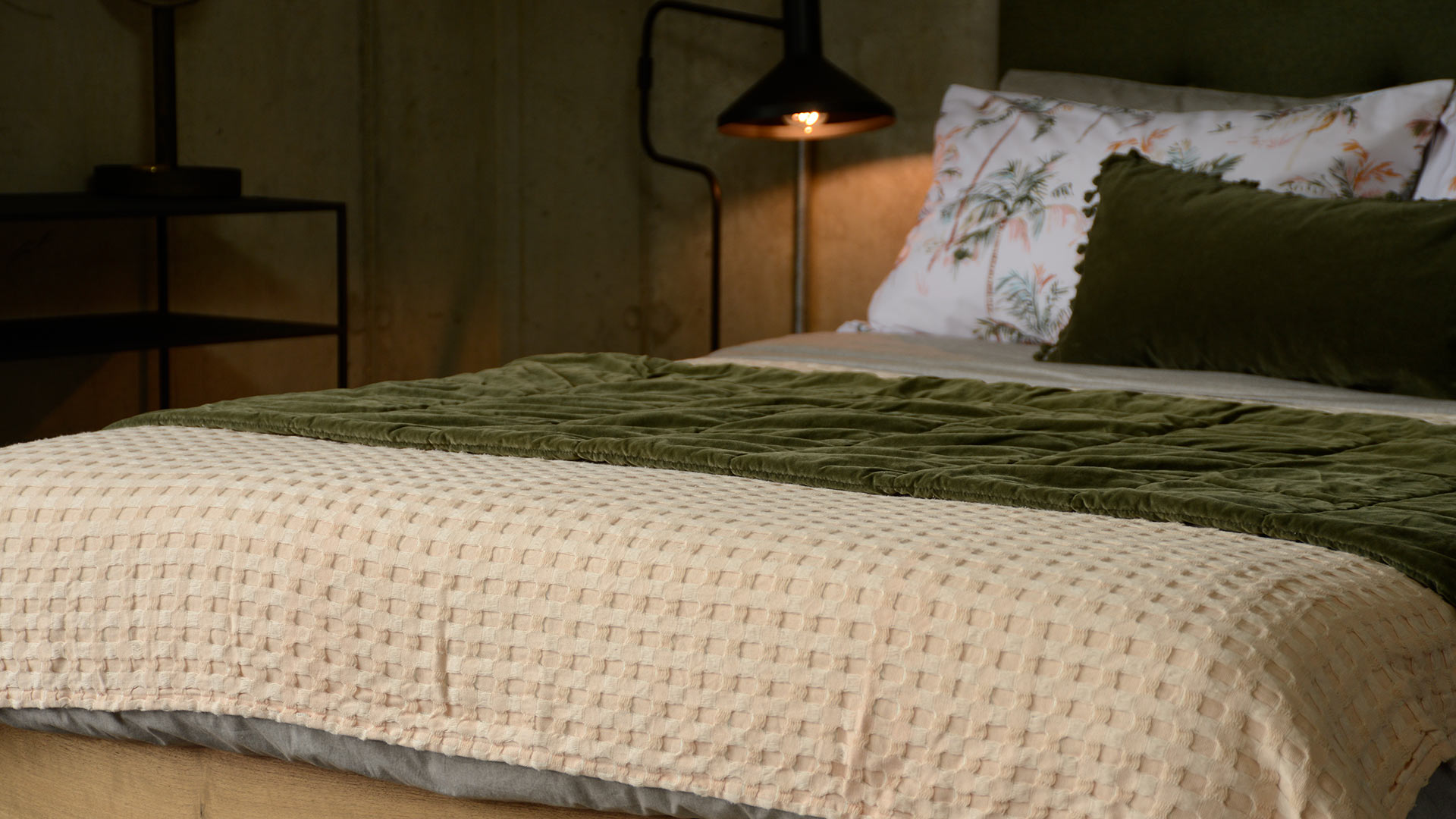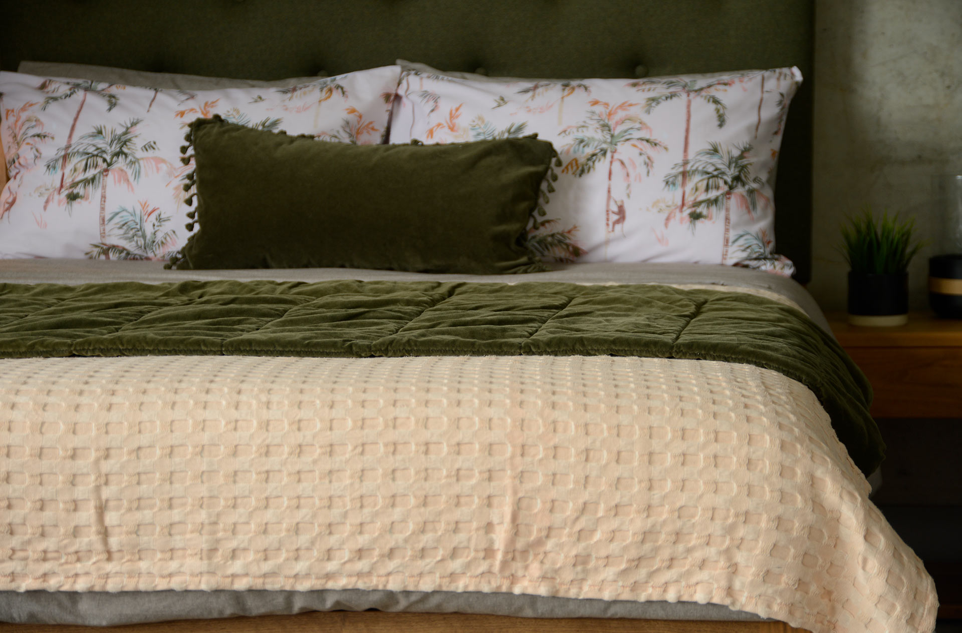 A peach, cotton waffle throw – cream on one side and a soft, pale peach colour on the other. Measuring 130 x 170cm, it is perfect for over the end of a bed or on the sofa. In addition, this throw is soft and simple, adding a subtle texture to your bedding scheme.