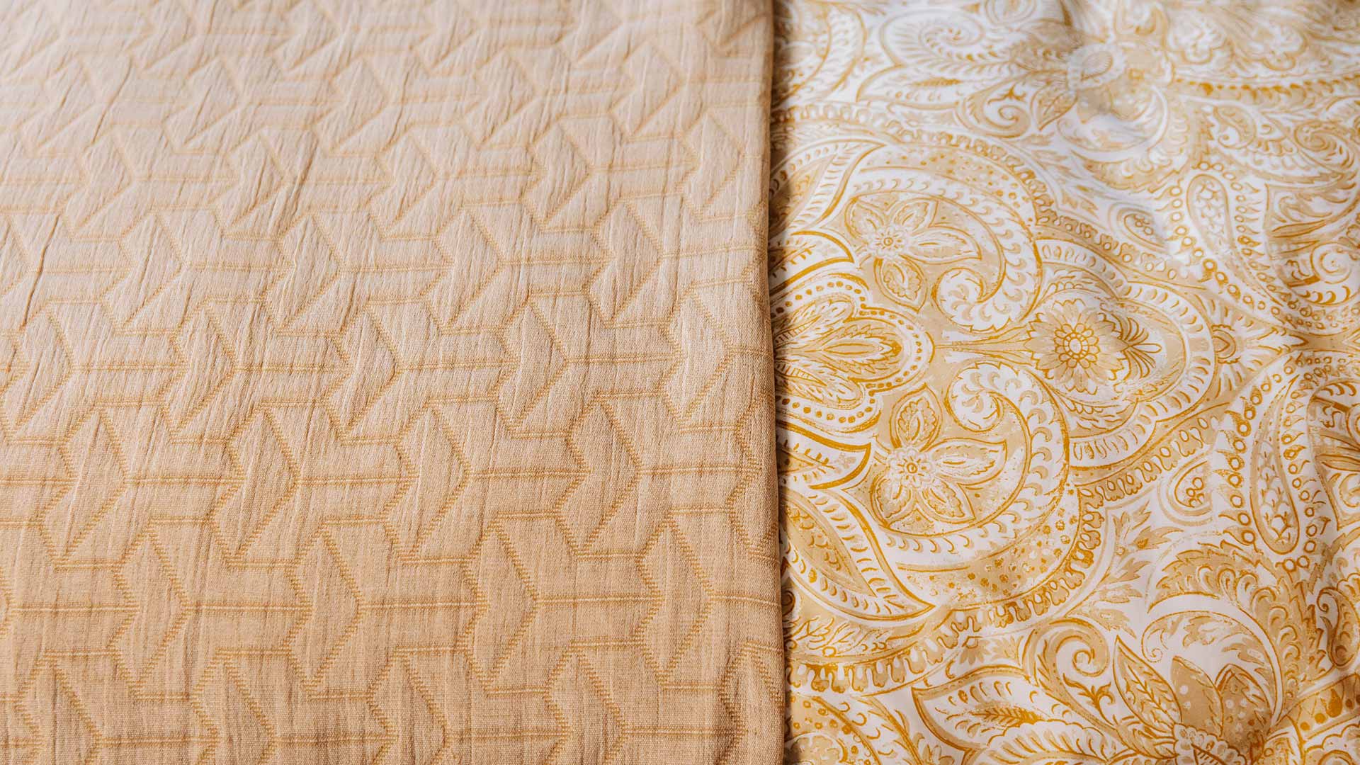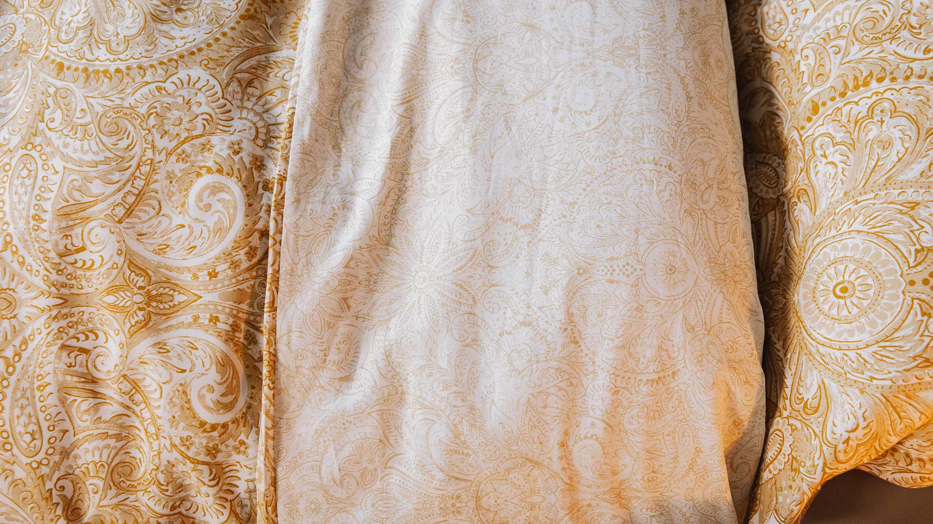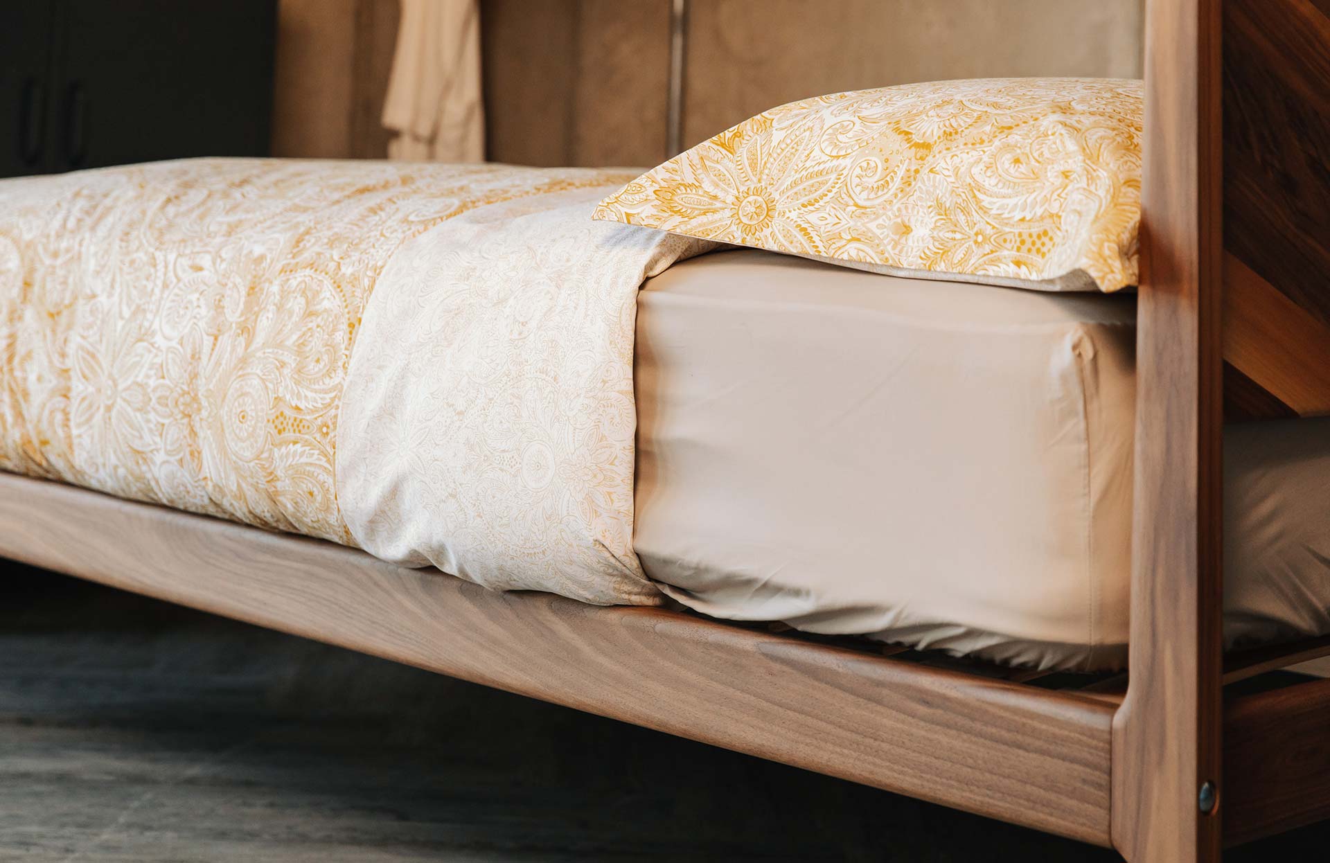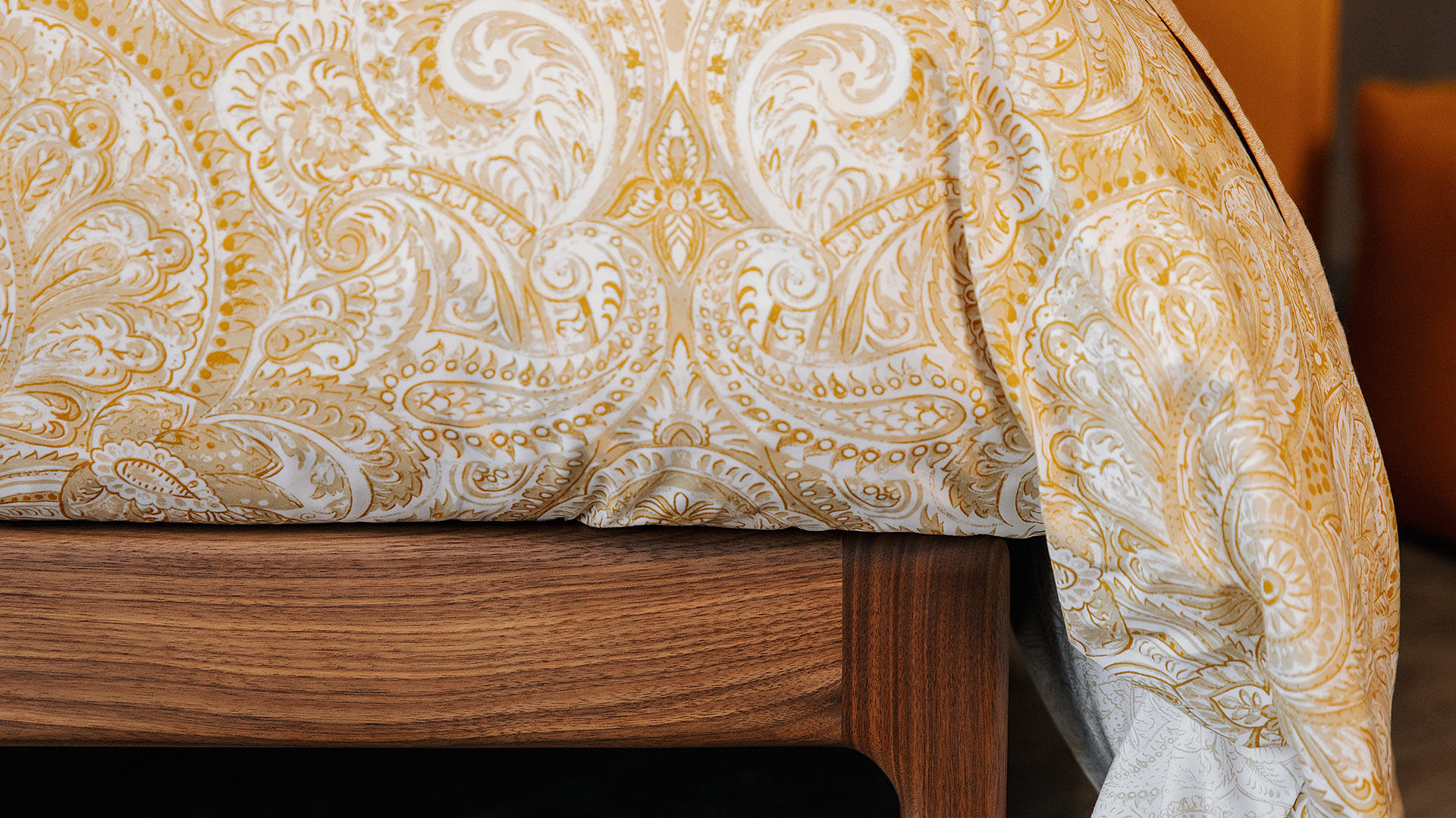 A contemporary take on a classic floral pattern, this lovely, reversible duvet set in ochre and ivory has an elaborate, large scale pattern. The print is in a mid golden shade and a deeper mustard colour over ivory, the reverse a paler version with a smaller, delicate print. This beautiful, modern design is printed onto a 200 thread count percale cotton. The pillowcases are Oxford style, like the duvet cover they can be used either way up.