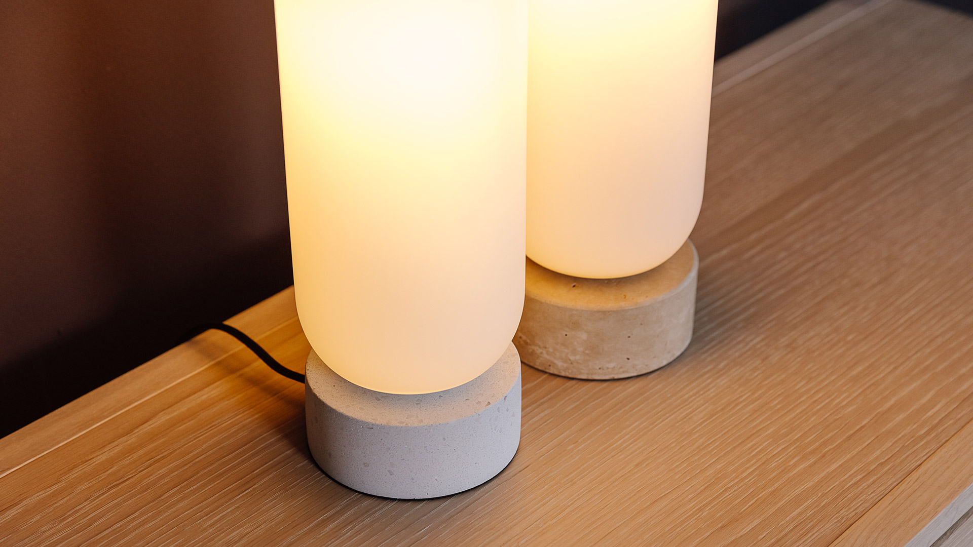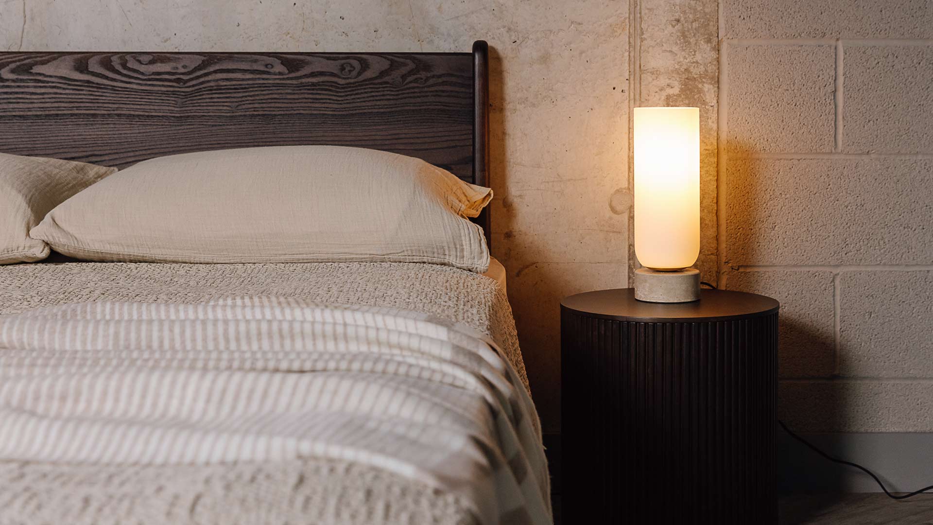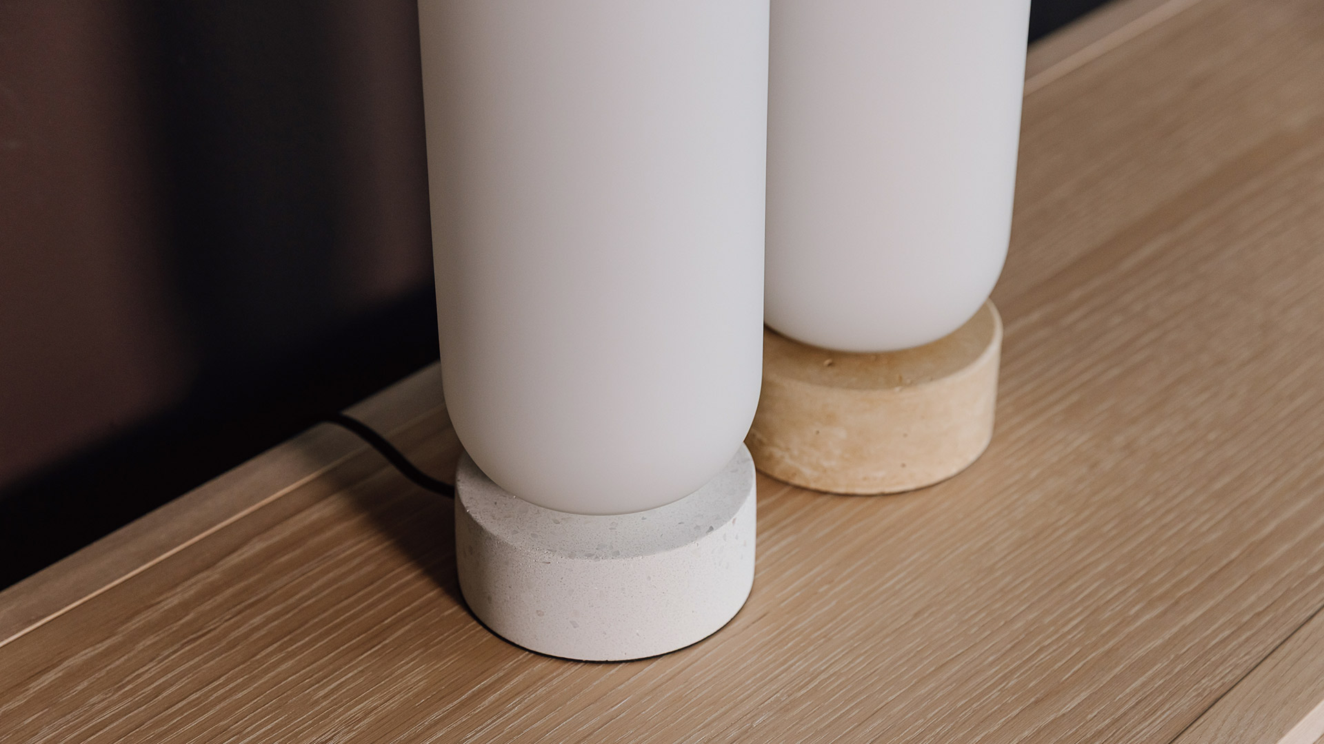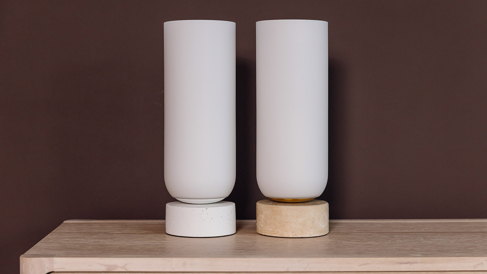 Simplistic and stylish stone table lamps. These sleek lamps boast a natural stone base with a beautiful opal style glass shade. Available in two colour options – choose from either a sandy travertine shade, or pale white