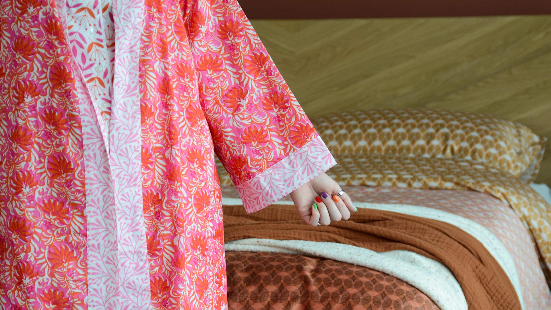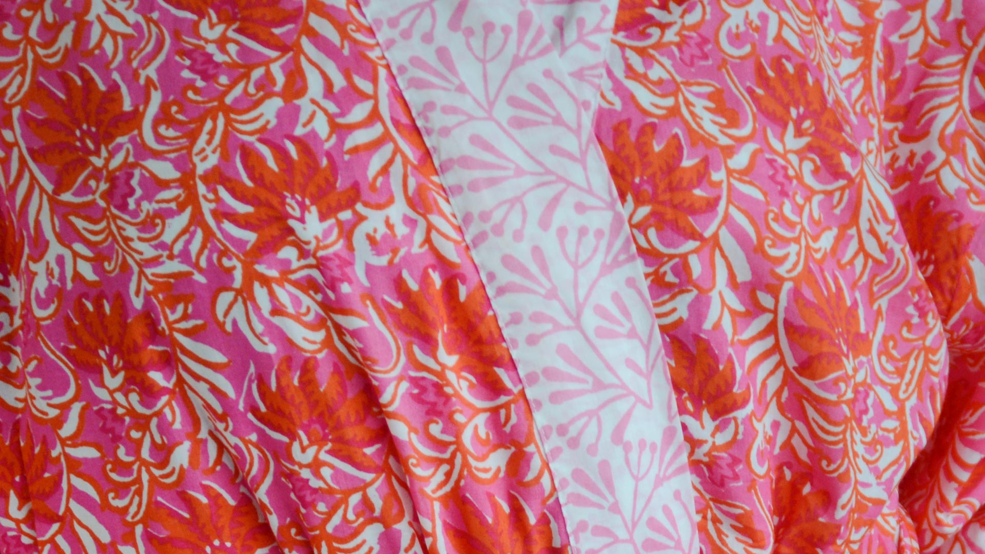This pink & orange floral print kimono is created using traditional block printing techniques. A lovely treat; either for yourself, or a gift for a friend!
