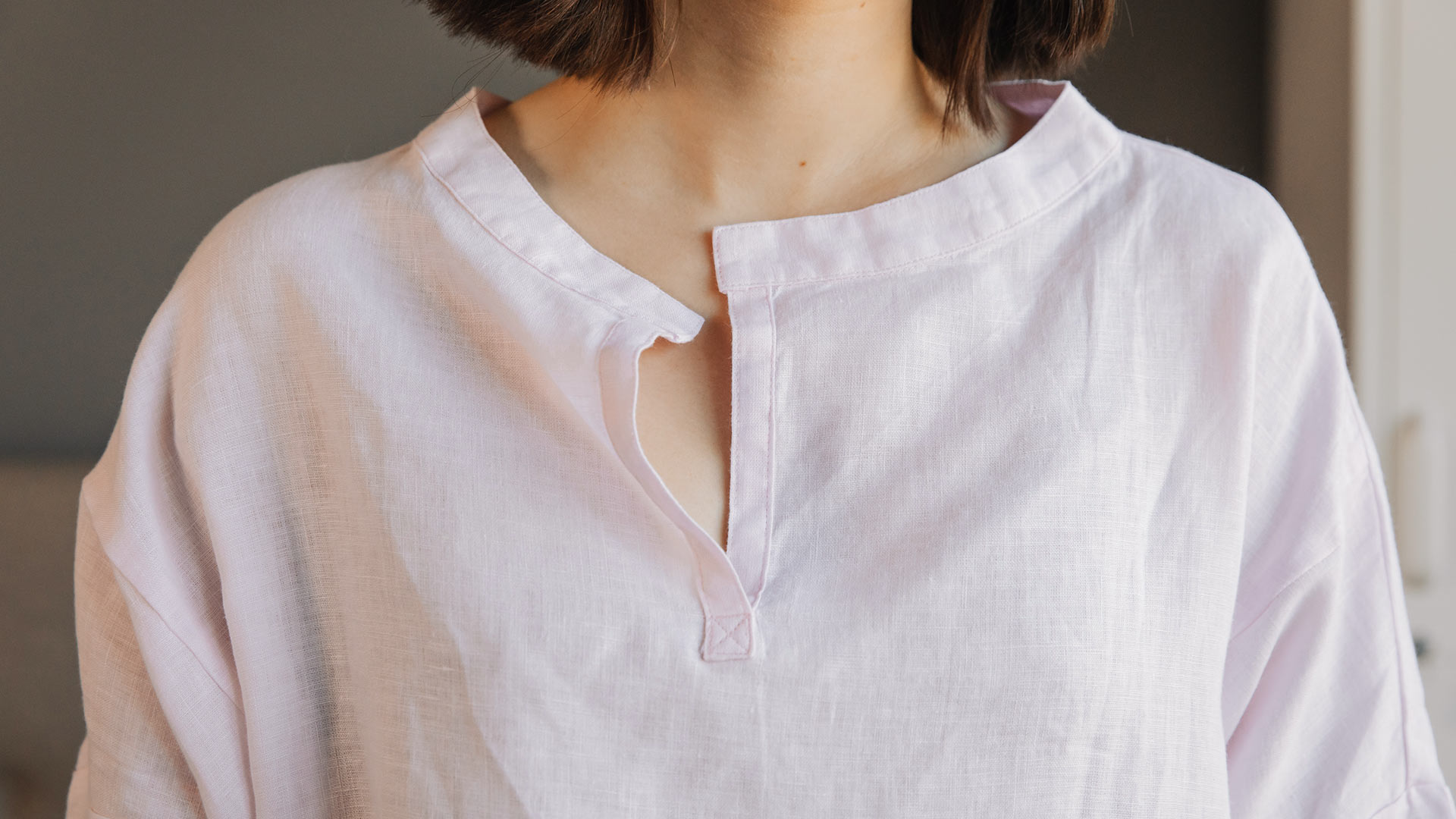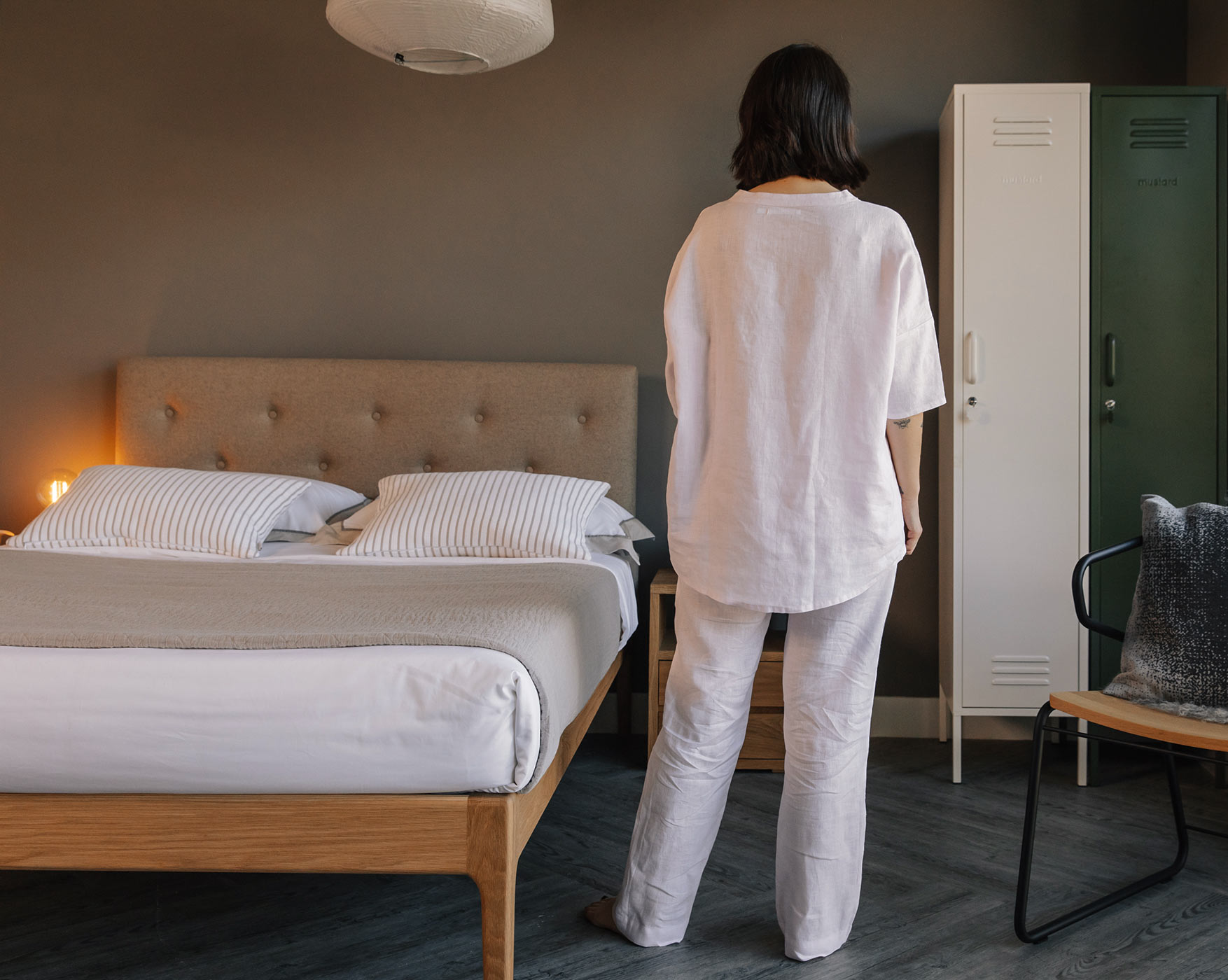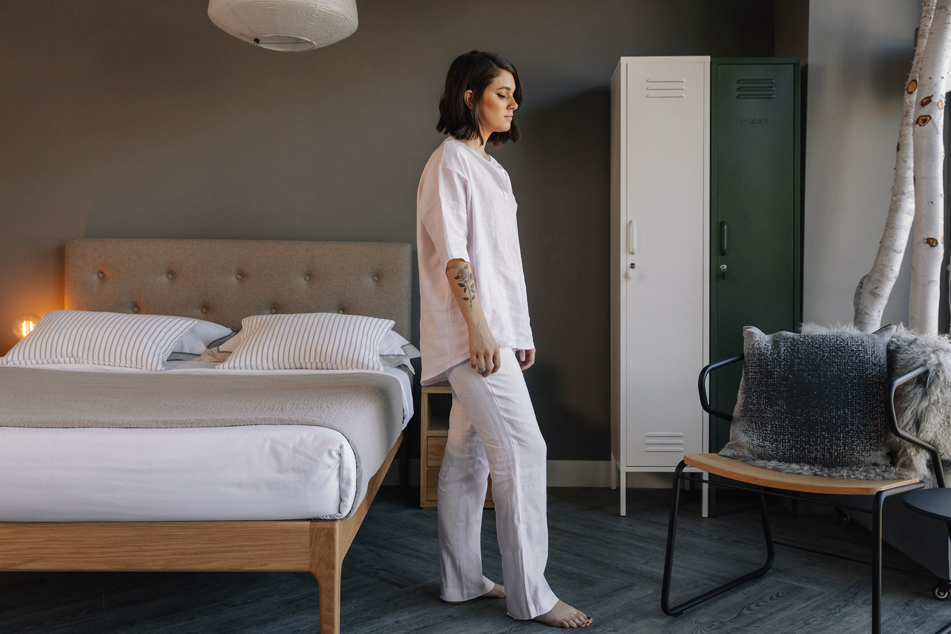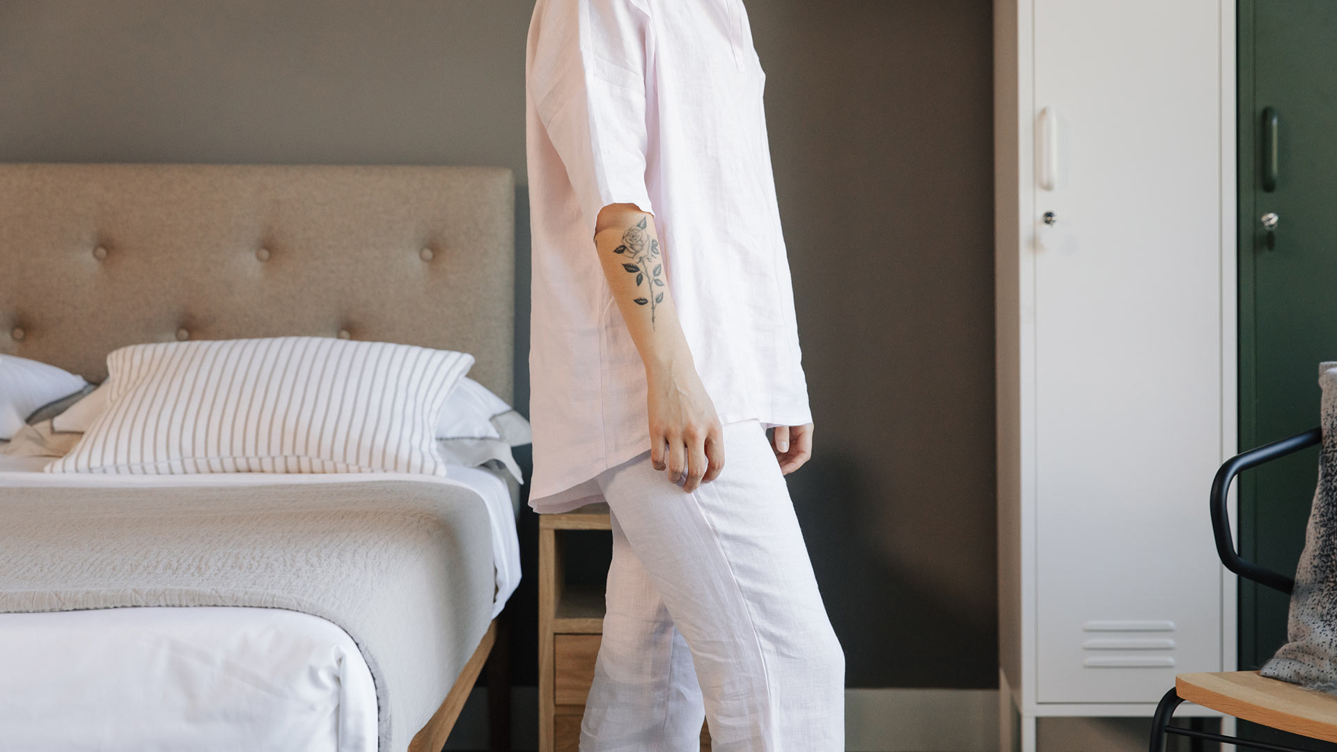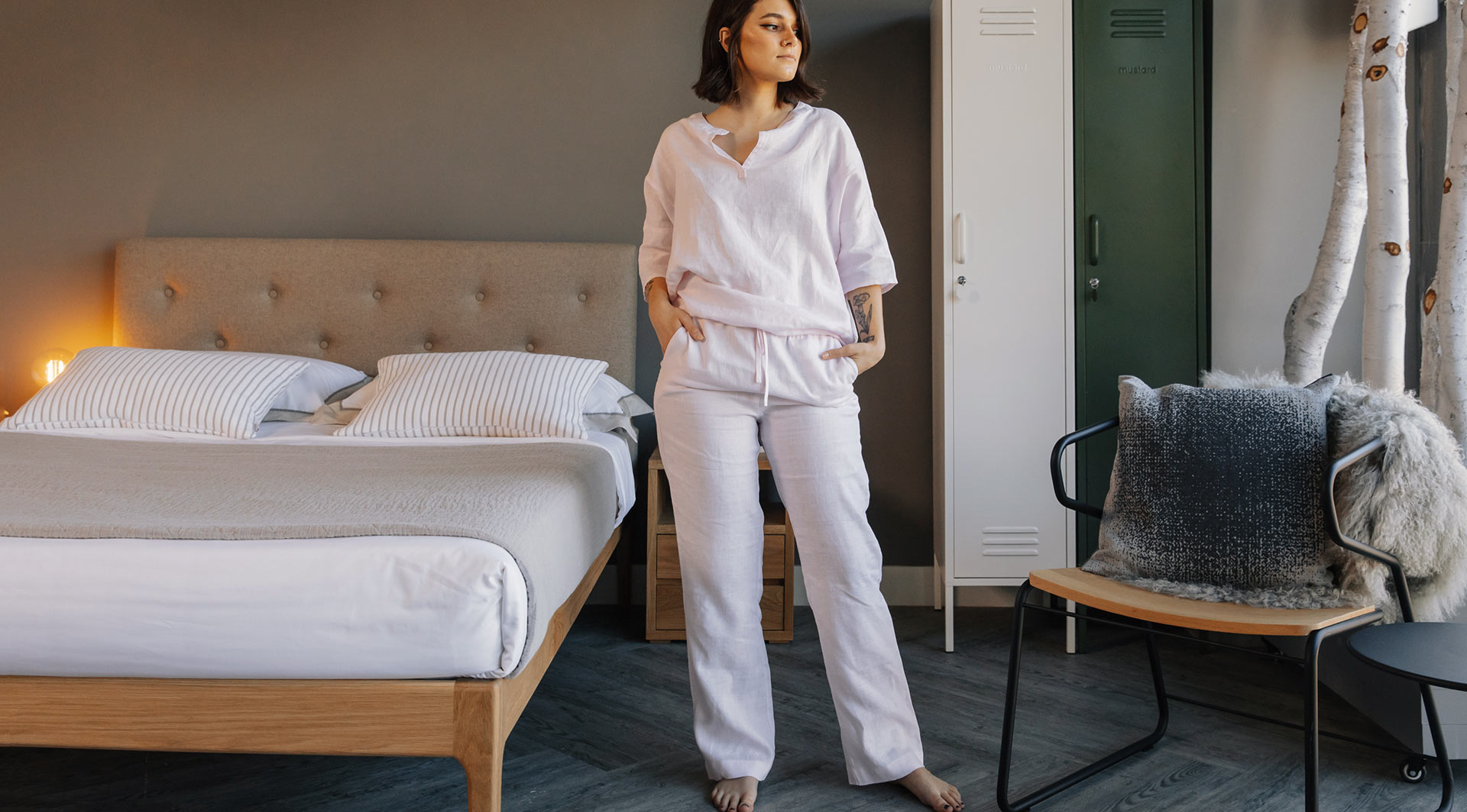 A collection of pink, pure linen pyjamas for women. The collection includes pink linen trousers with pockets and an elasticated waist, with a matching top with 3/4 length sleeves and a longer back length. These gorgeous, pink pure linen pyjamas make a great gift for a loved one. A very pale, cool pink pure linen.
