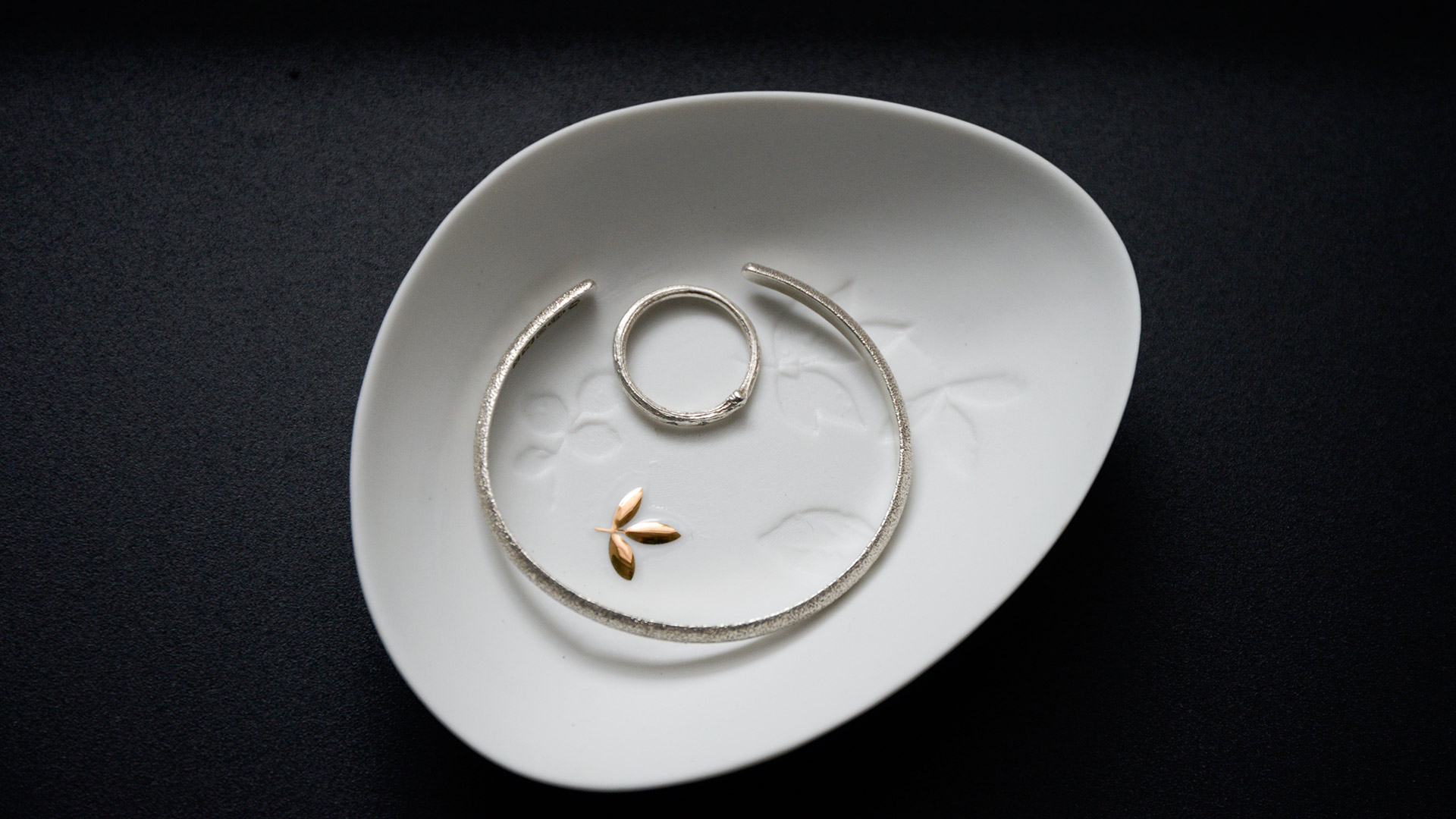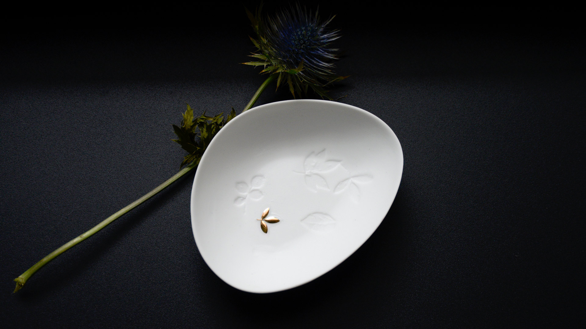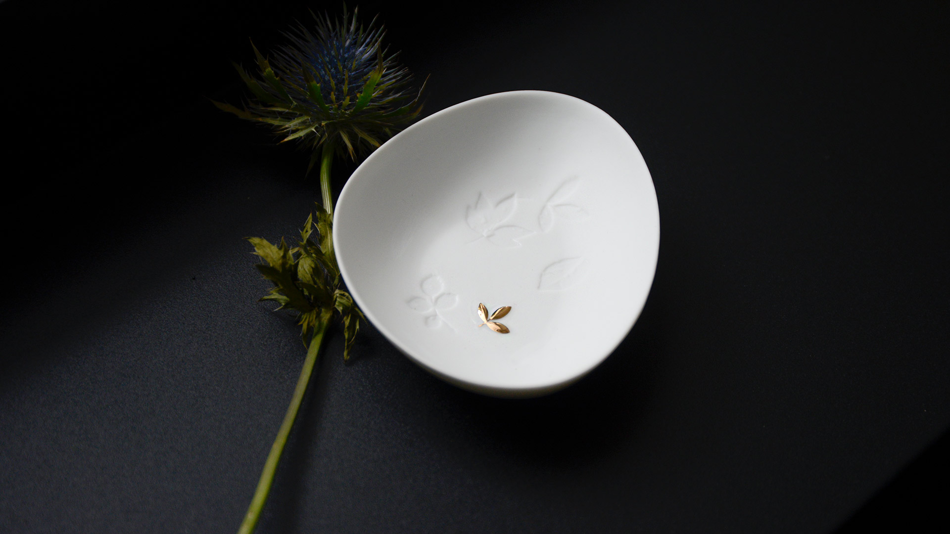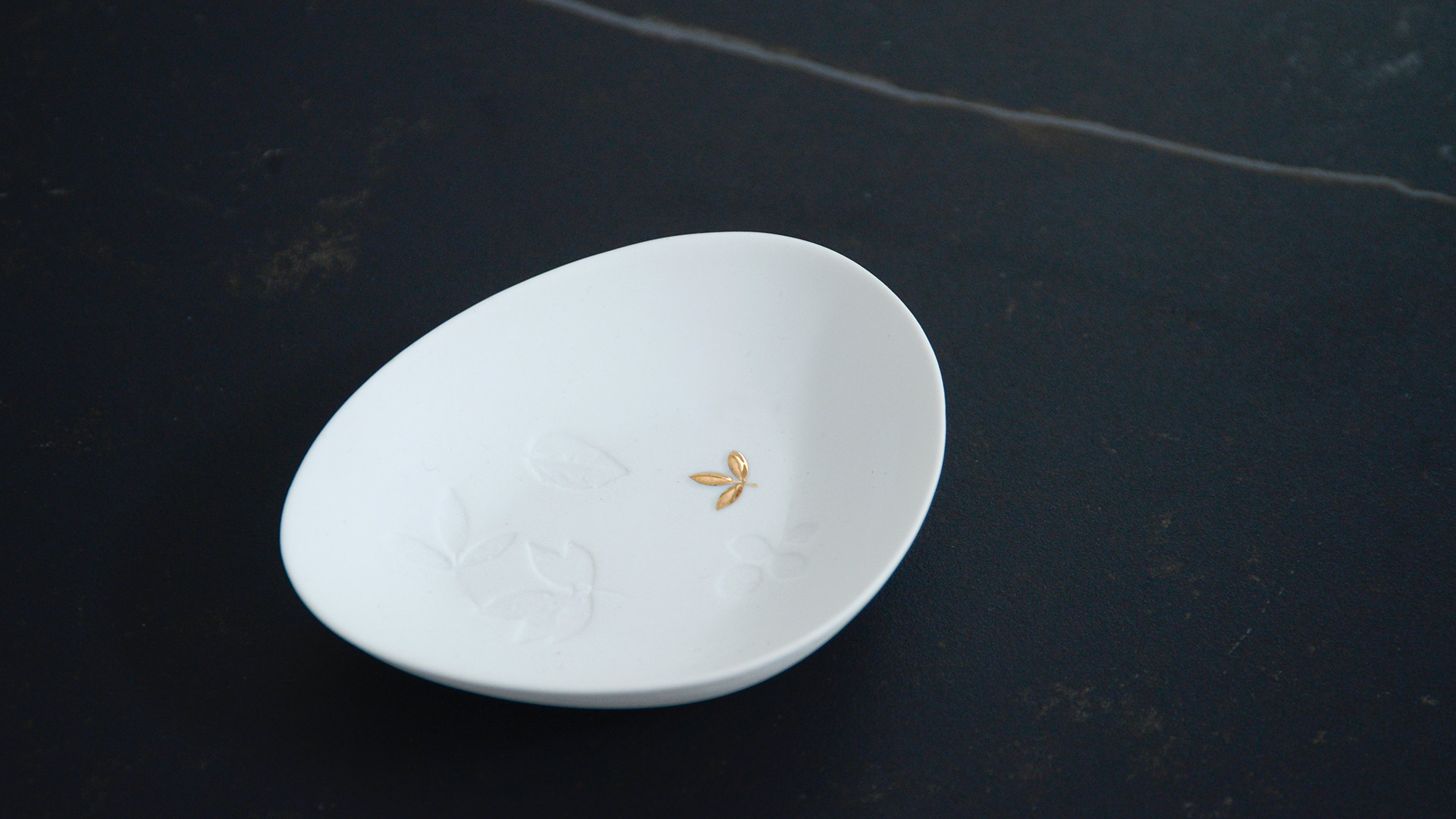 A mini dish with delicate leaf decoration in gold and branch imprints in the matte white porcelain.