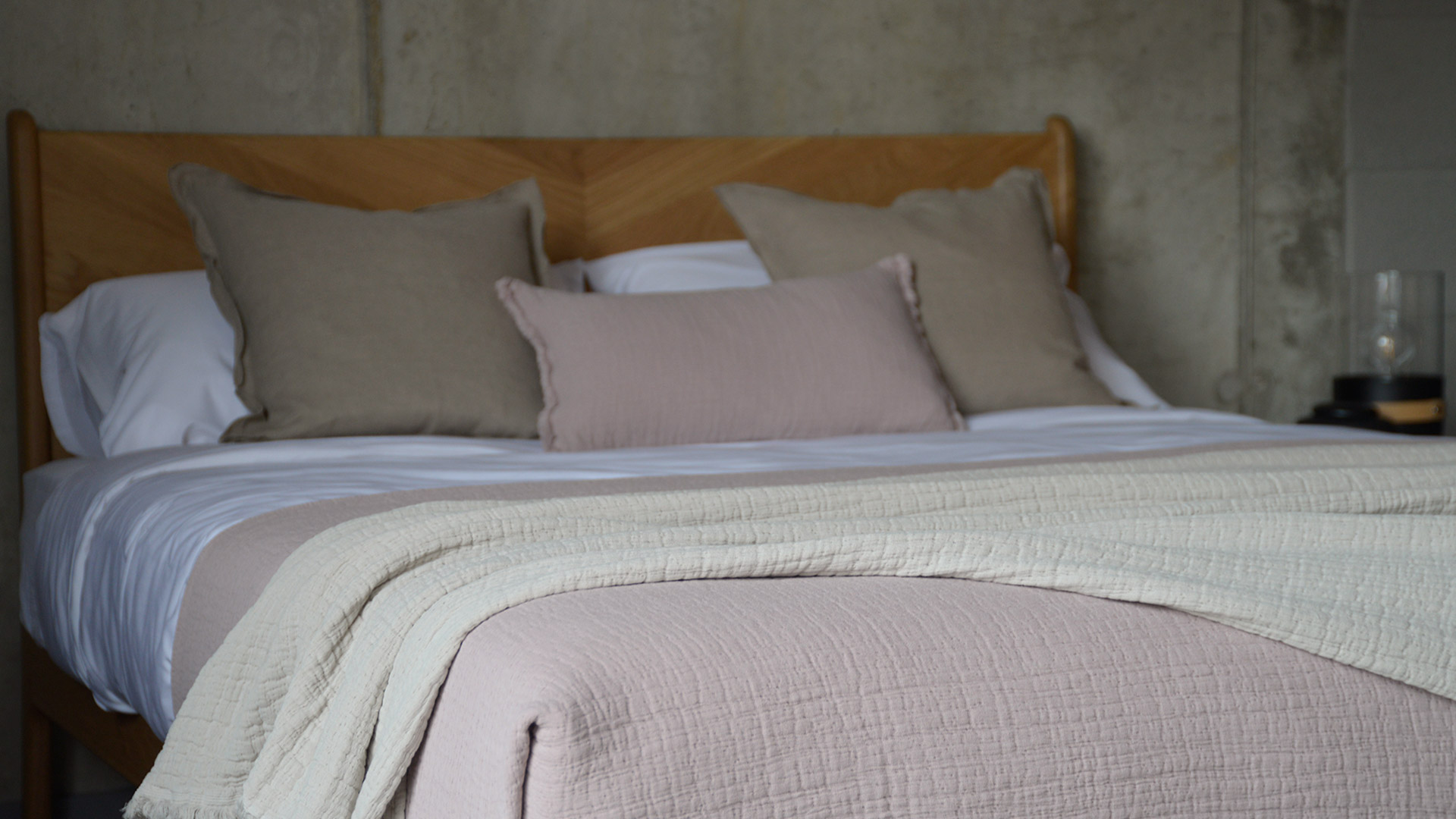 A collection of soft, cosy cotton throws made using a pure cotton fabric with a relaxed waffle style texture. These throws are available in three subtle, muted colours: ivory, ecru or dusty rose.