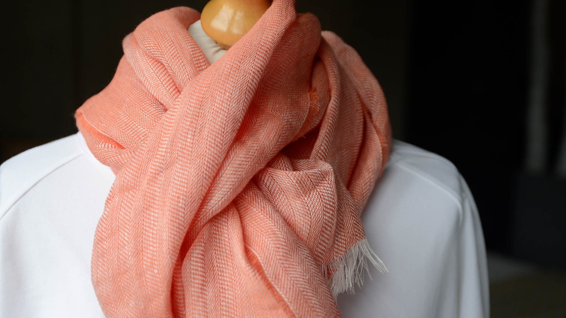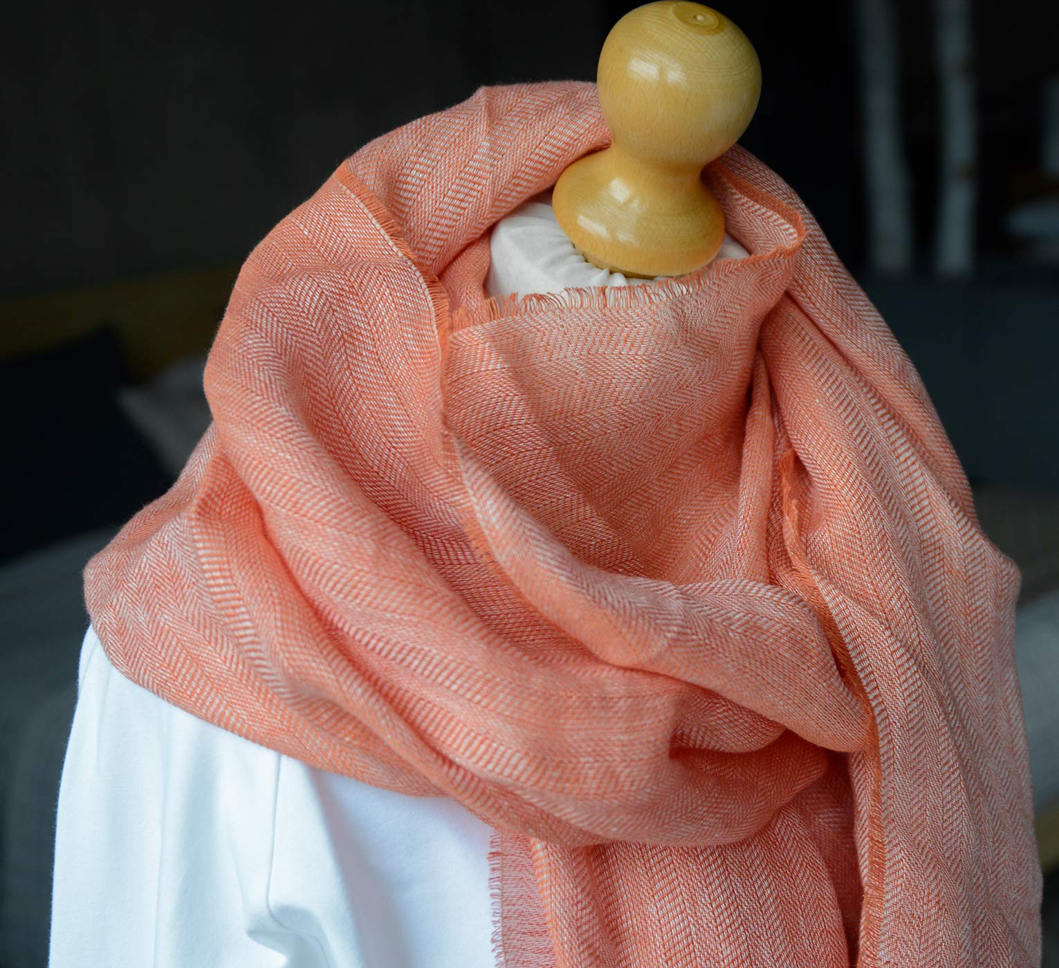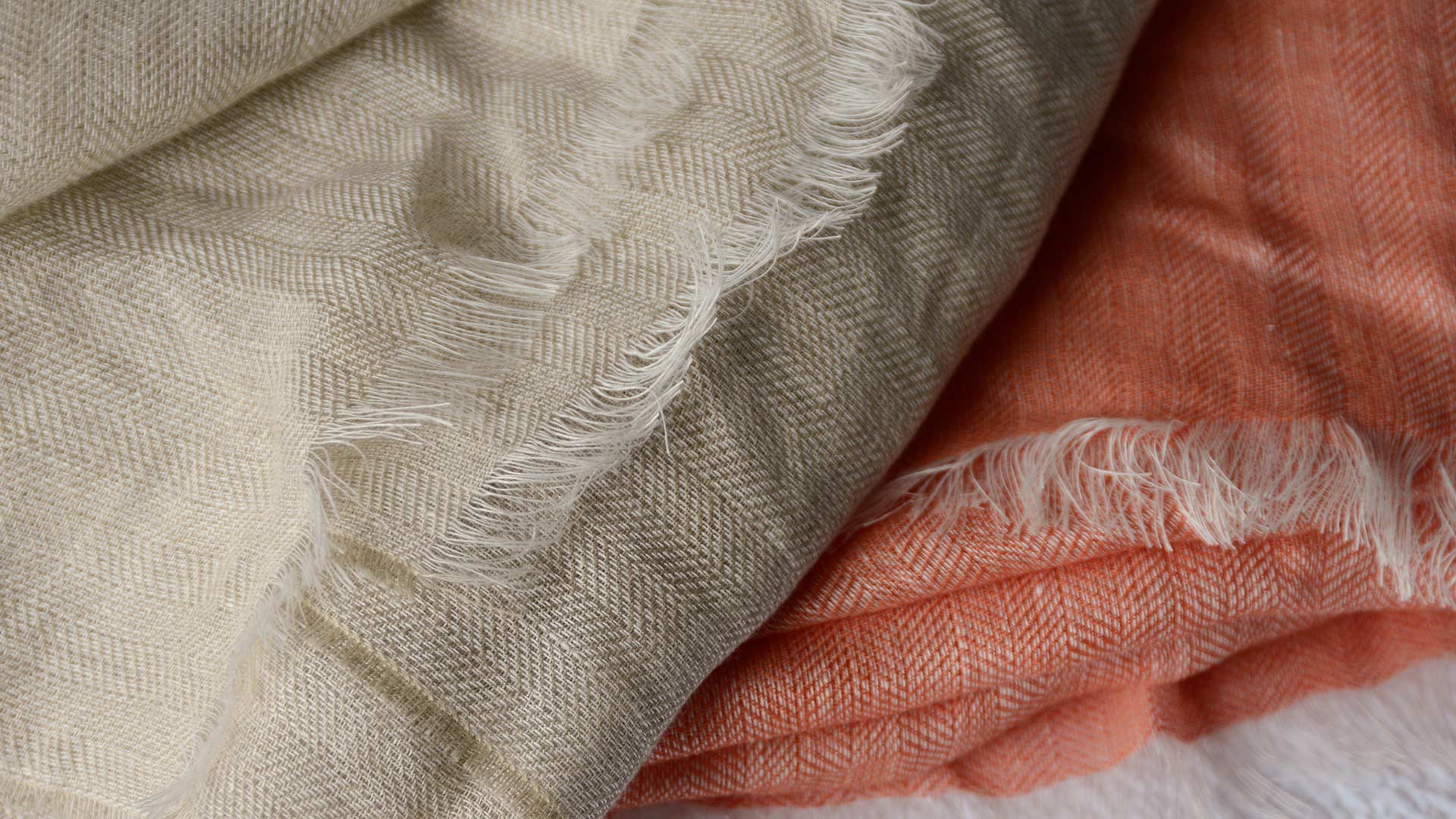 Light and soft, pure linen scarves in two colour options: – Oatmeal – a muted ecru shade – Nectarine – a soft, slightly cooler orange tone