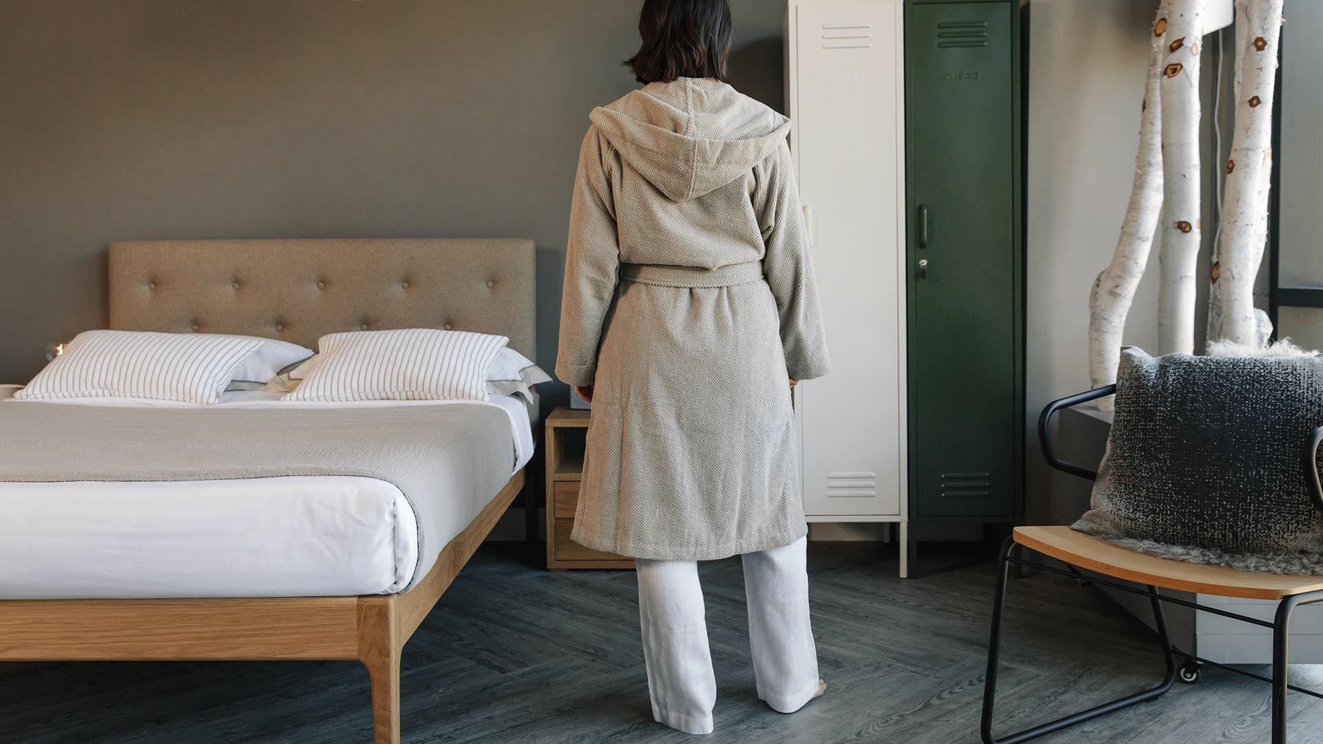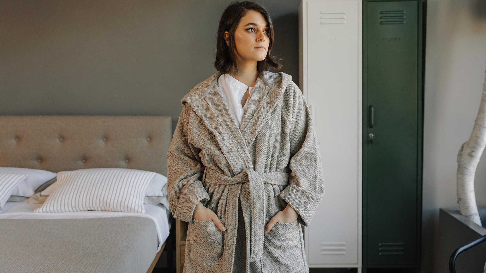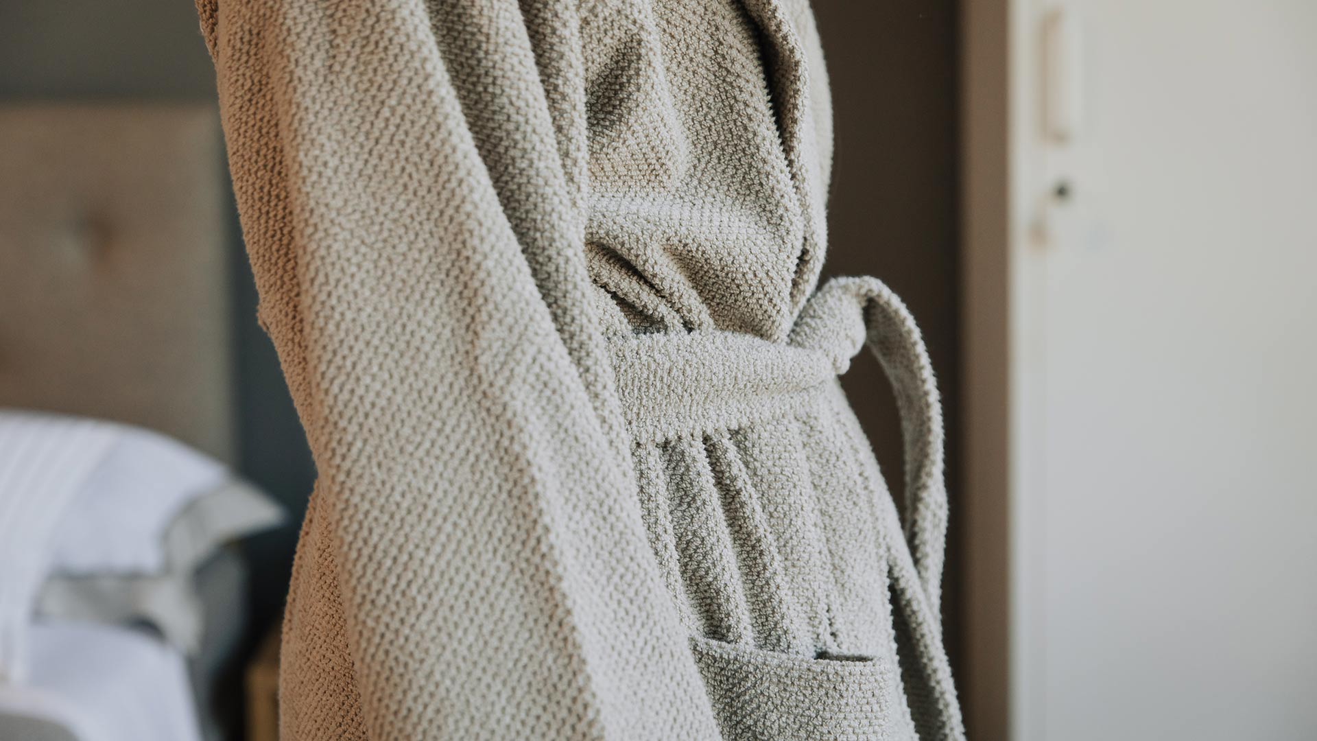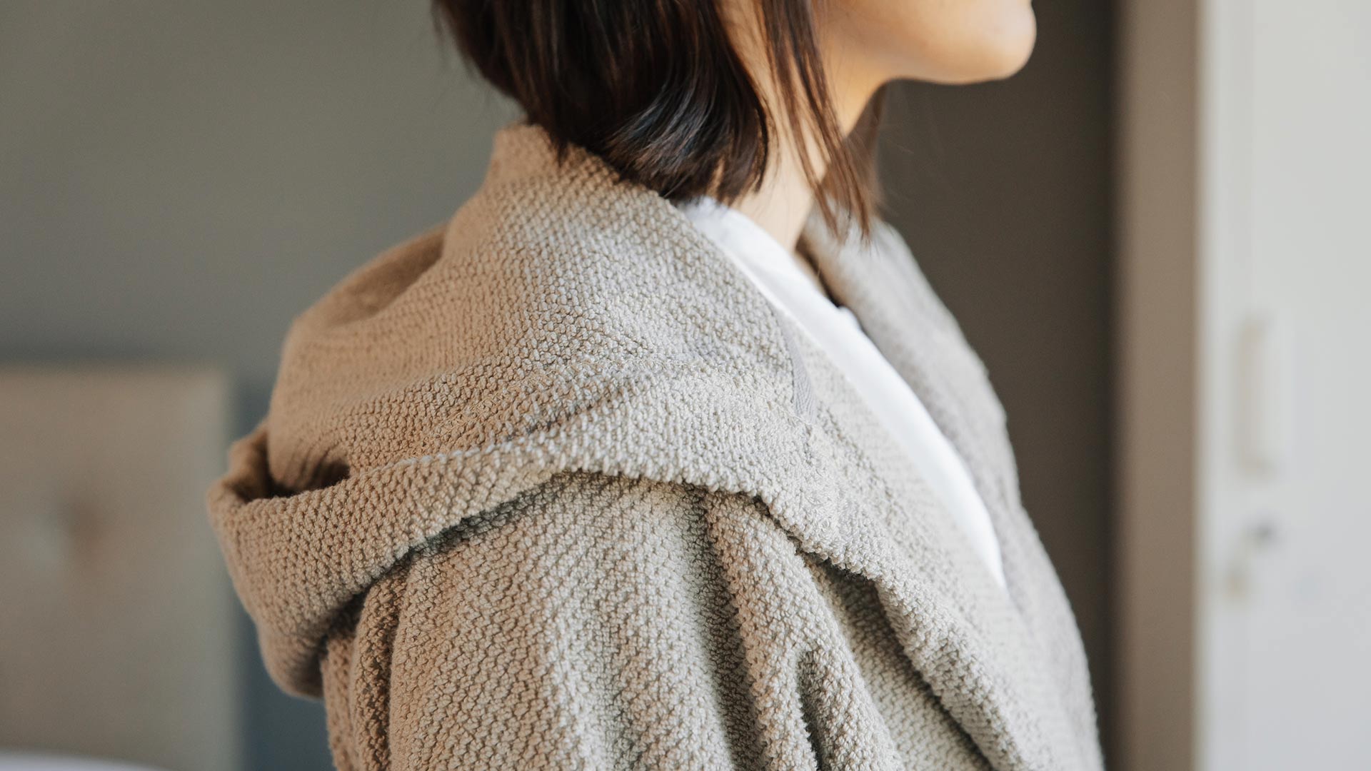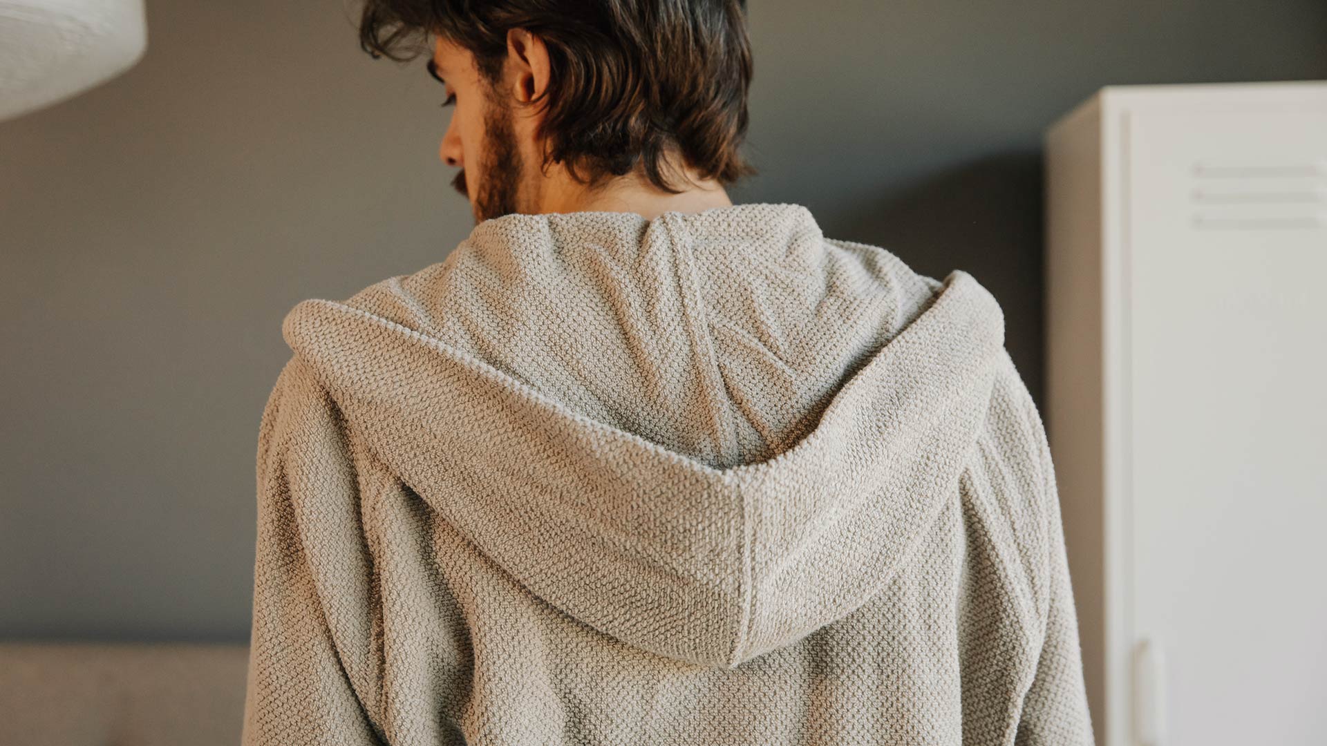 Stylish and comfortable – these unisex, hooded robes are soft against the skin and cosy. Available in putty – a cool, pale beige shade.