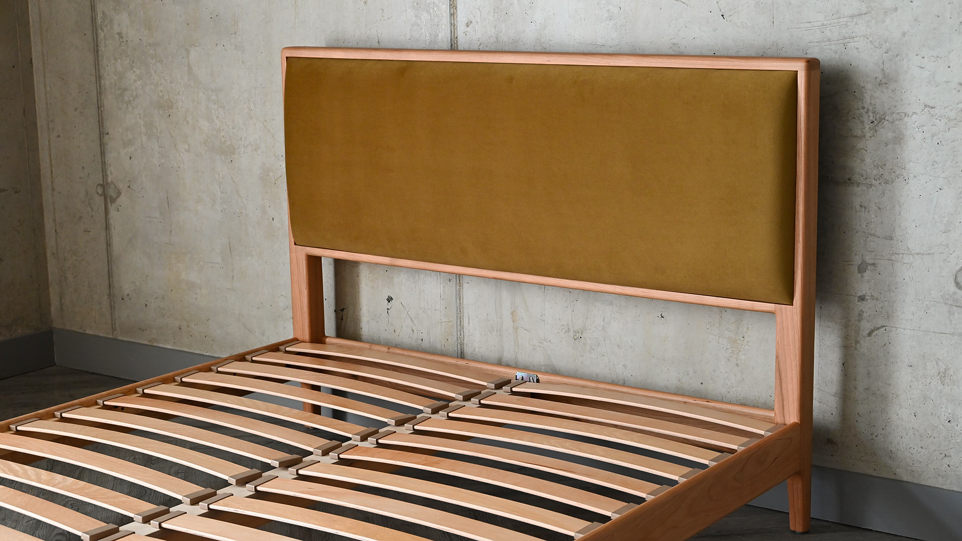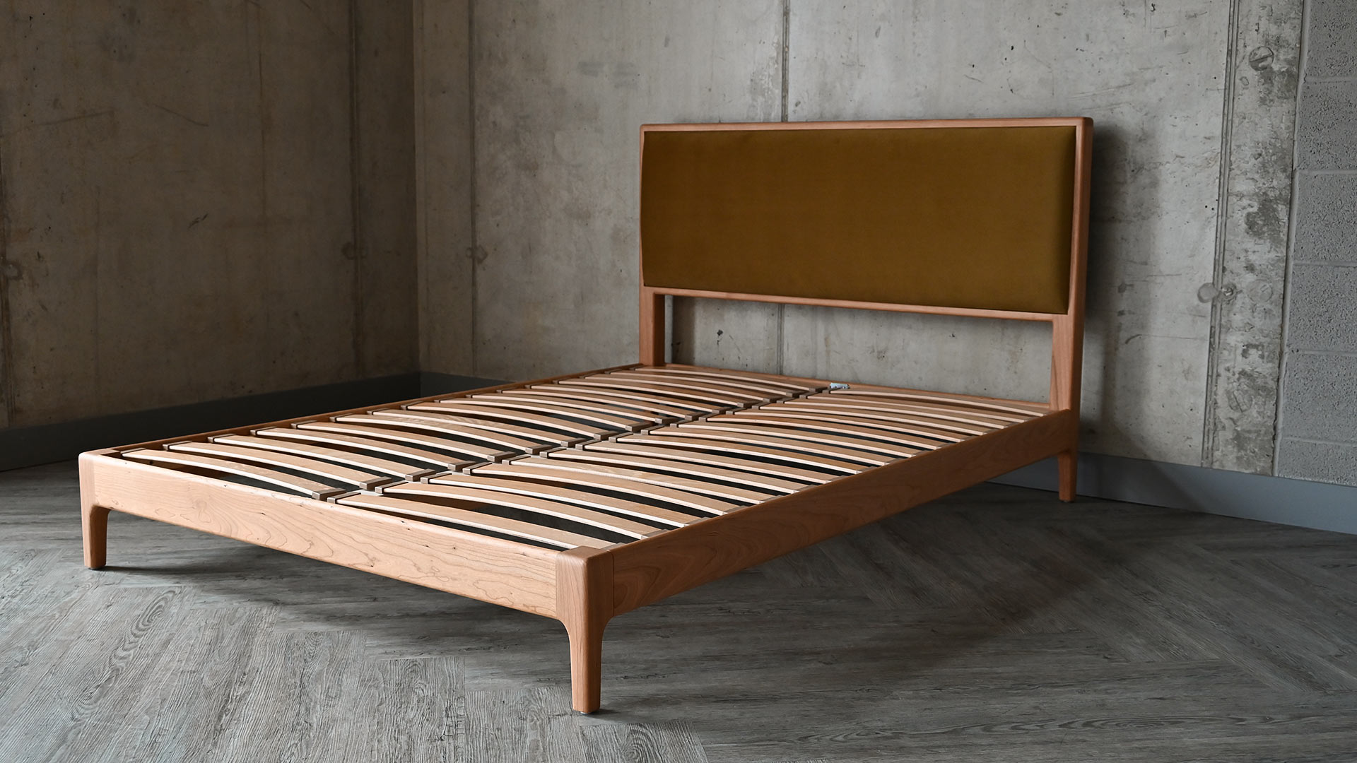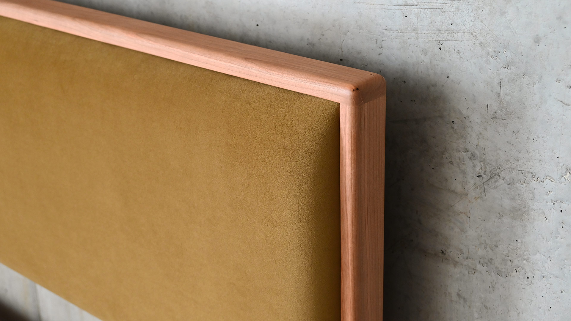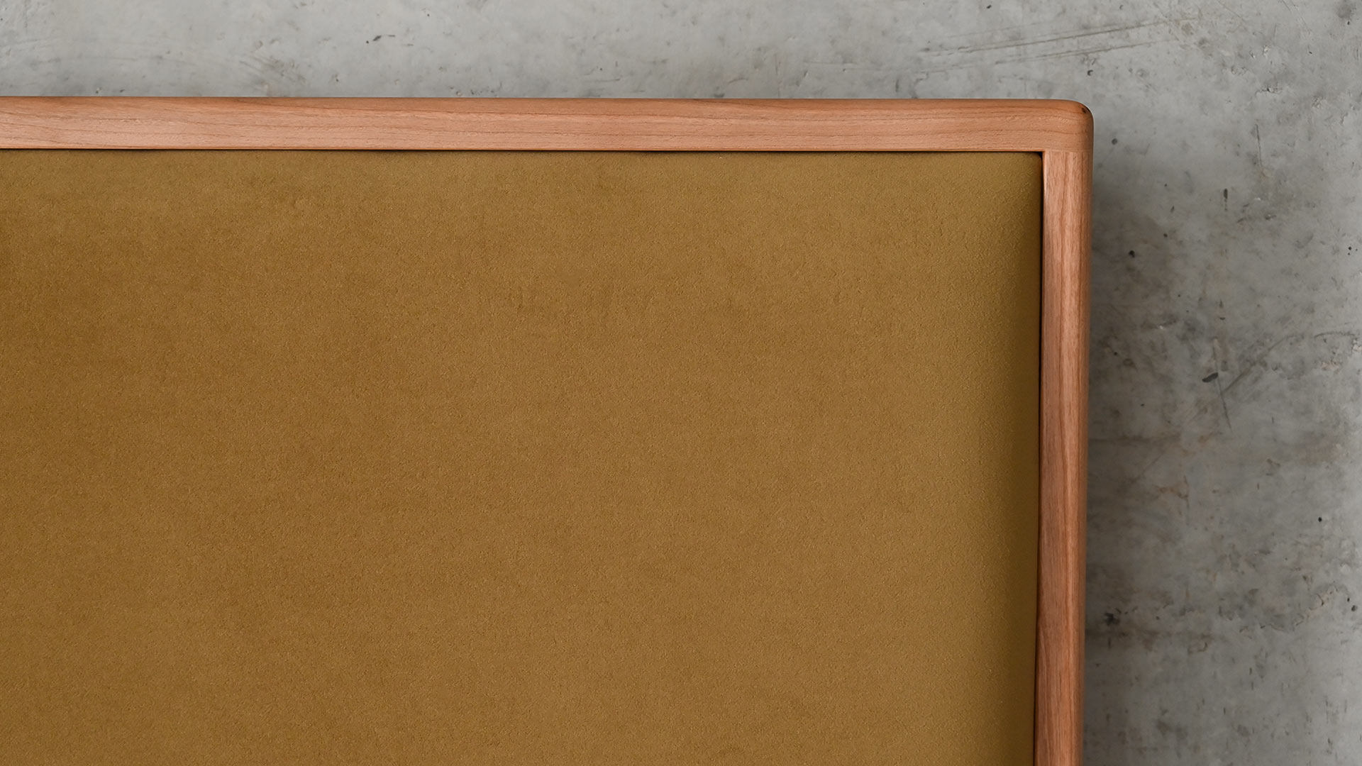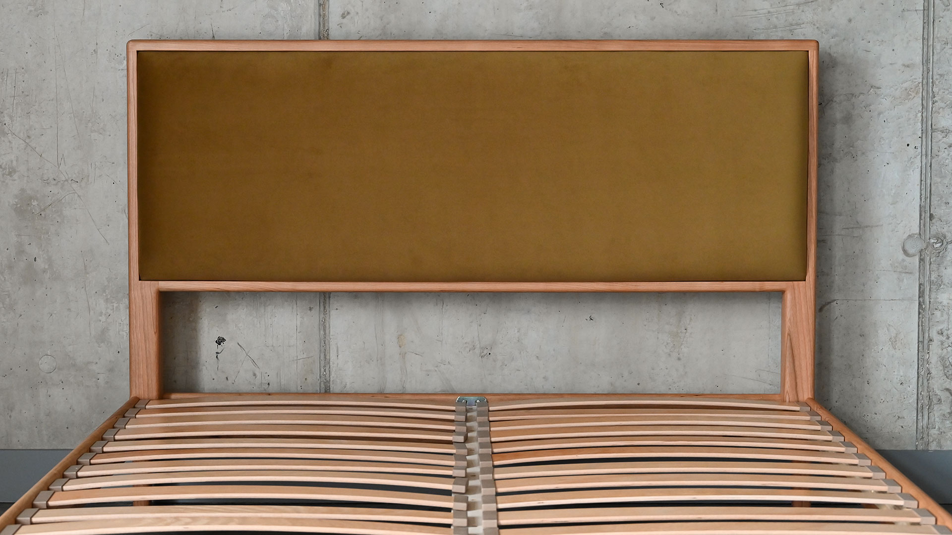 After a recent order cancellation, this custom Carlisle bed is available here on an expedited lead time. This quick-ship cherry bed is a UK king size (fits a 150 x 200cm mattress). It features a striking headboard upholstered in Eco Velvet Plantation. It has not been on display – it has only been briefly assembled for photography.