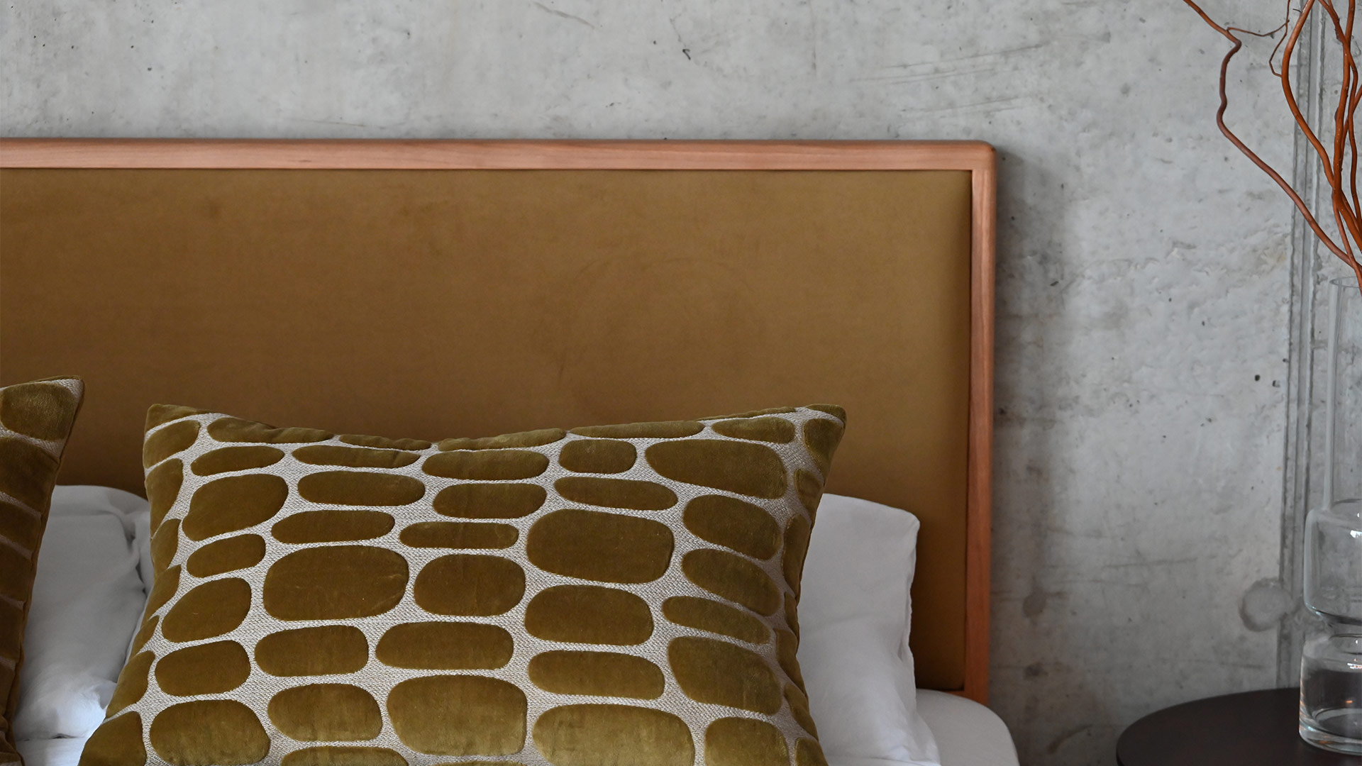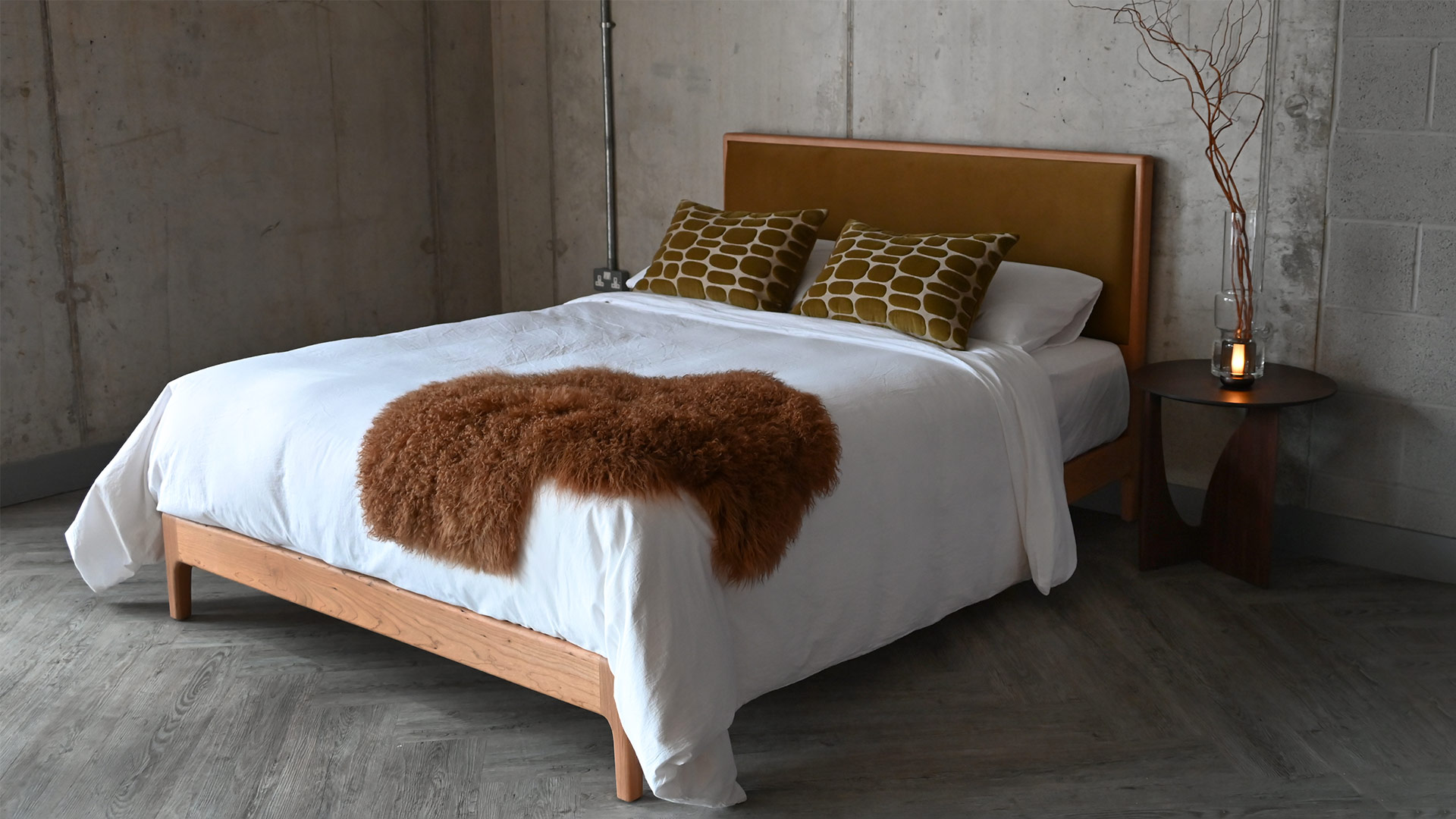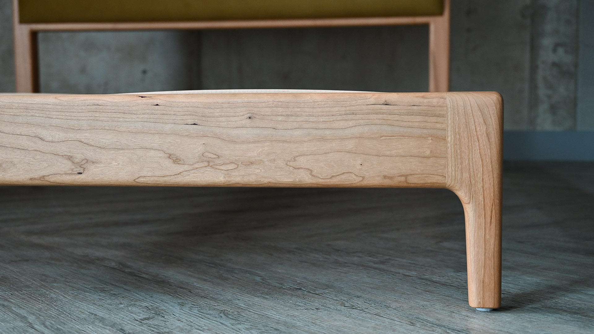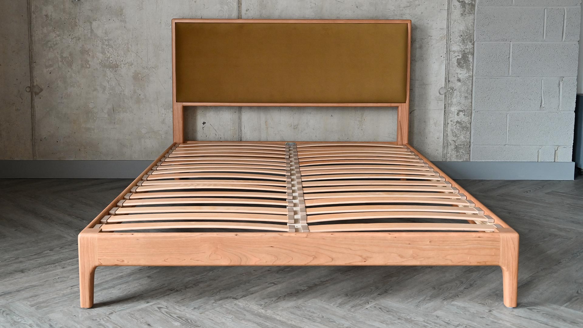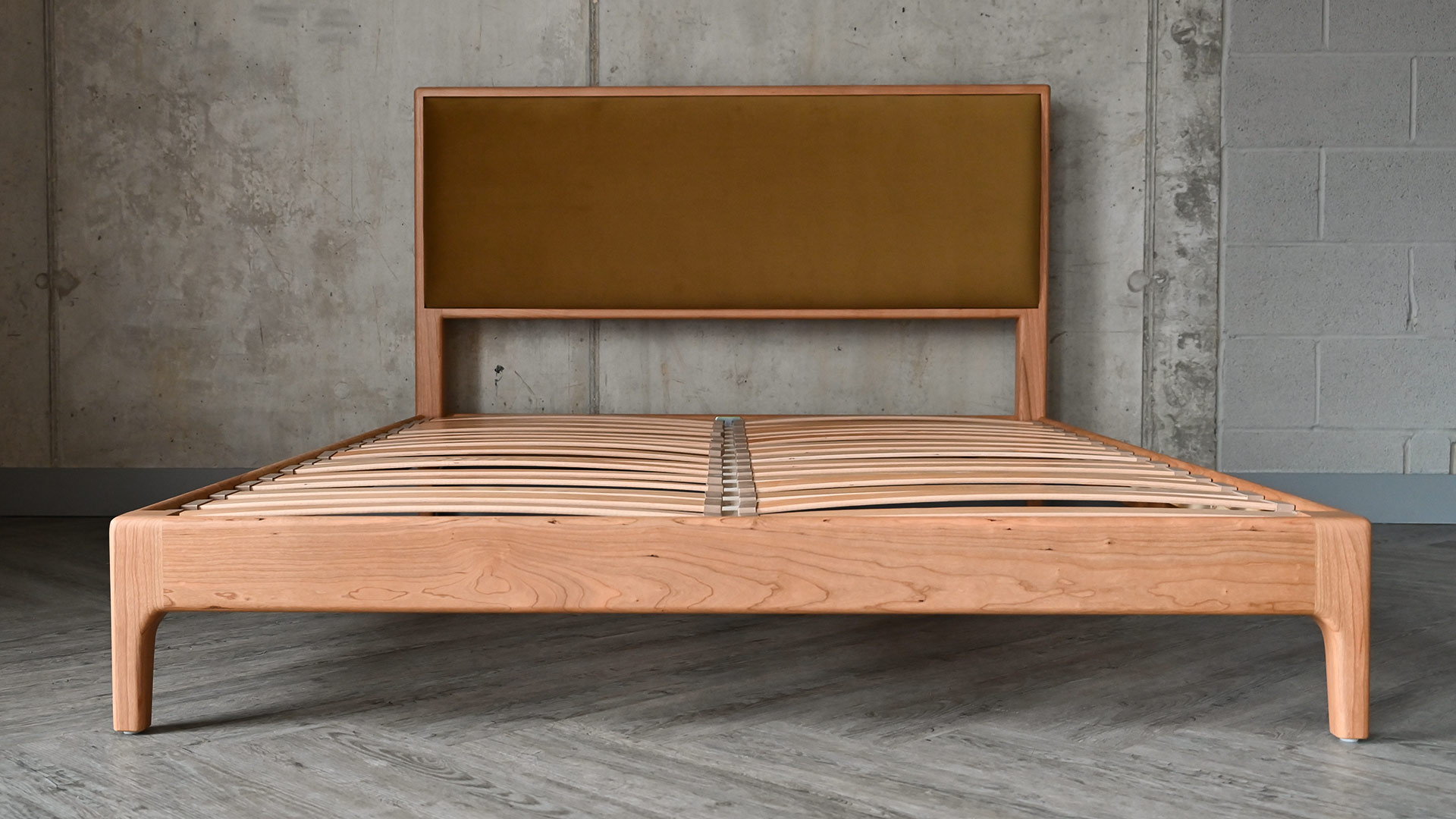 After a recent order cancellation, this custom Carlisle bed is available here on an expedited lead time. This quick-ship cherry bed is a UK king size (fits a 150 x 200cm mattress). It features a striking headboard upholstered in Eco Velvet Plantation. It has not been on display – it has only been briefly assembled for photography.