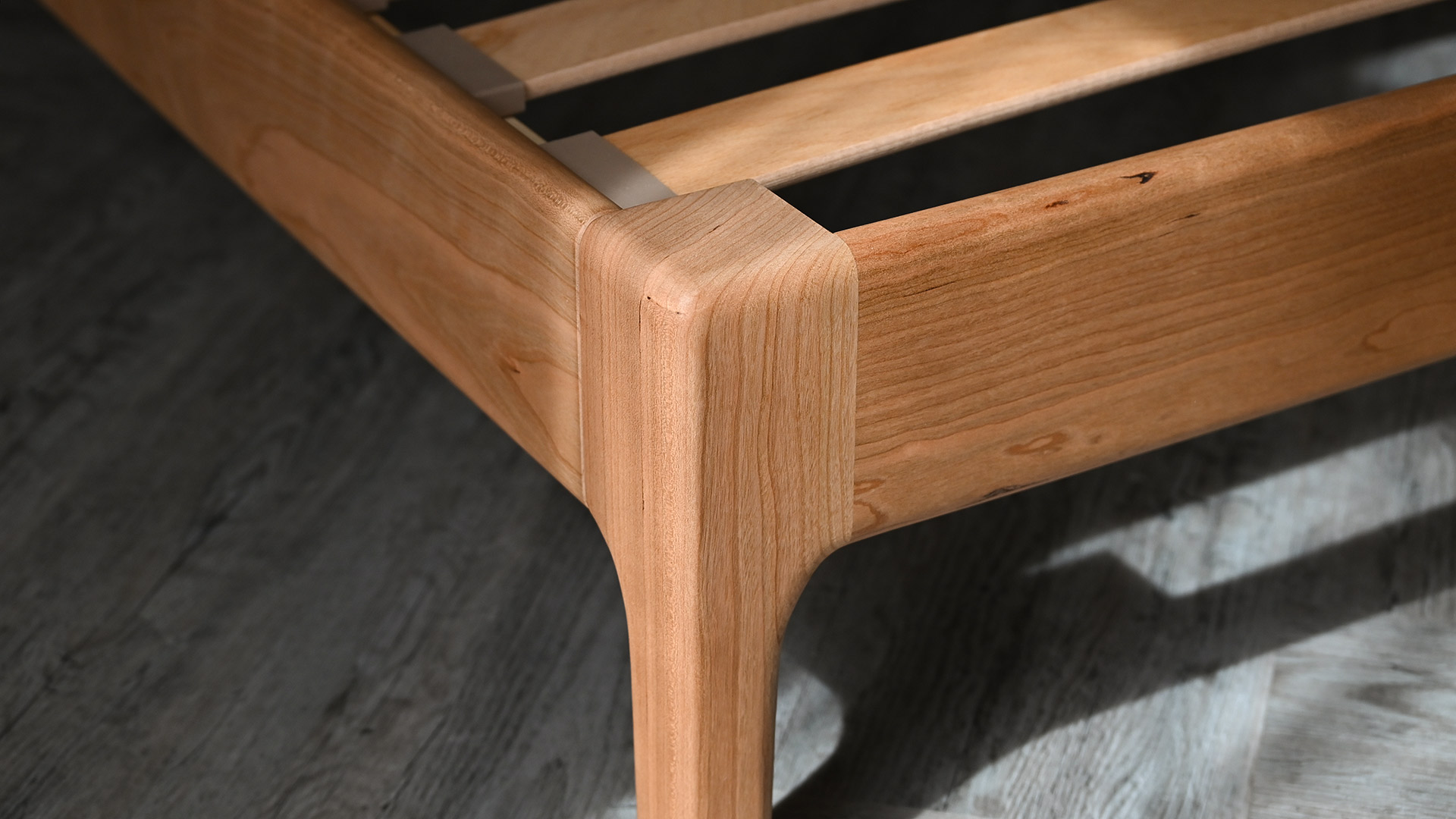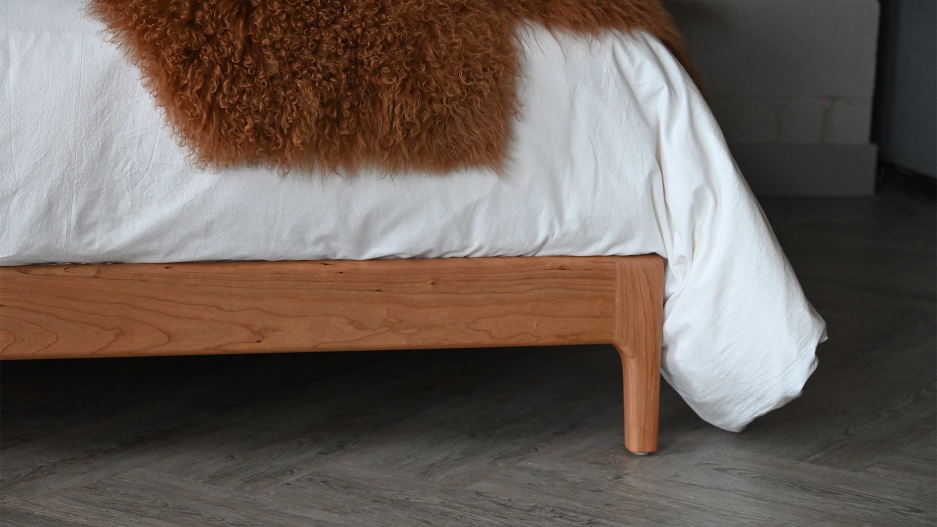 Here we have a quick ship cherry bed base available to ship in 1 – 2 weeks. After a last minute order cancellation, this kingsize (150 x 200cm) Carlisle has already been made in solid cherry, with a padded headboard upholstered in Eco Velvet Plantation. This bed base has not been on display, and has only been used for photography purposes.