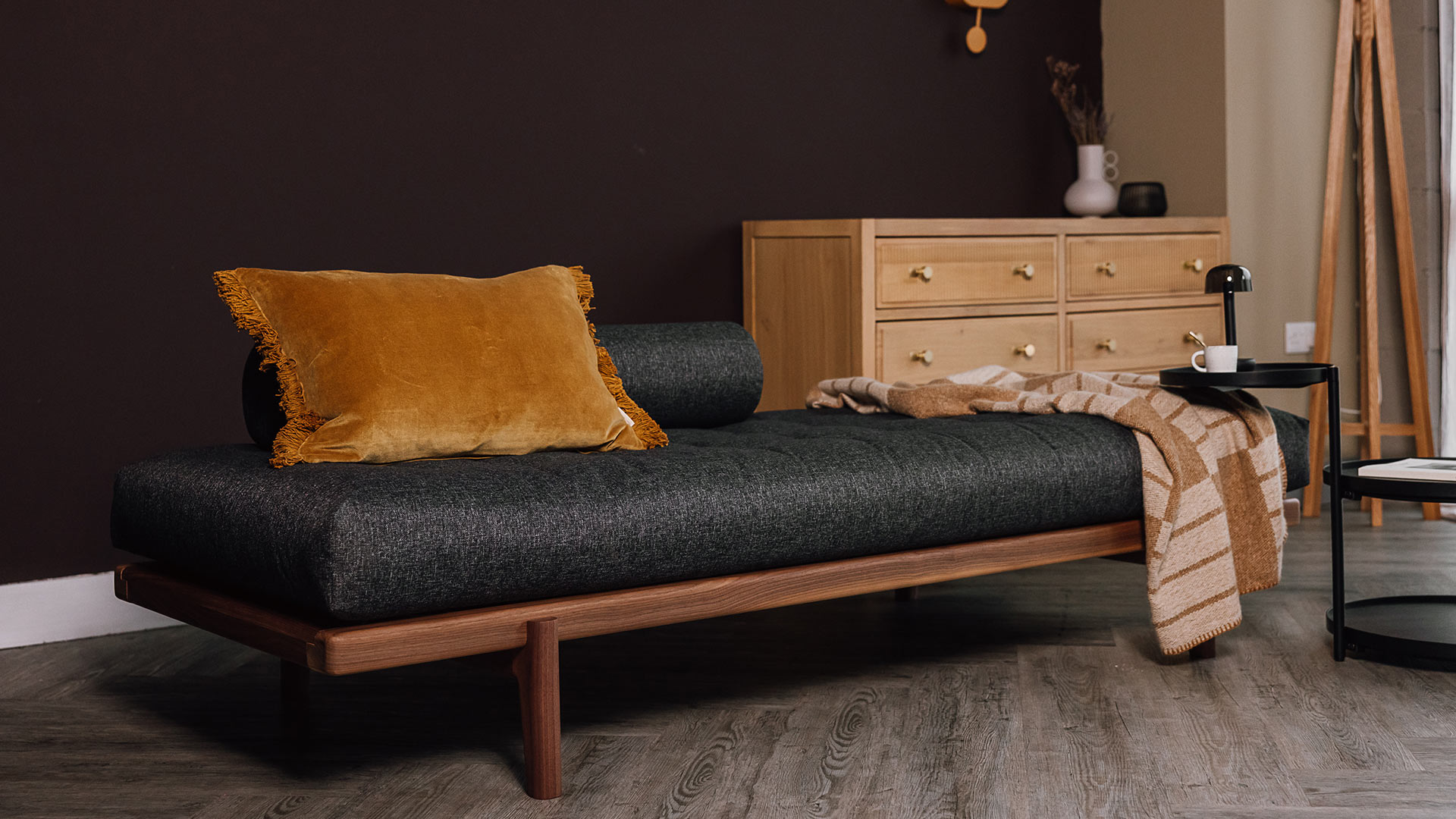 Available here on an expedited lead time, this walnut Osaka Day Bed is available on a lead time of 1 -2 weeks (+ delivery). If you would prefer to order a new day bed in a different timber or in another fabric choice, please see the original product page (linked below). It has not been on display – it was brought to our showroom for photography only.