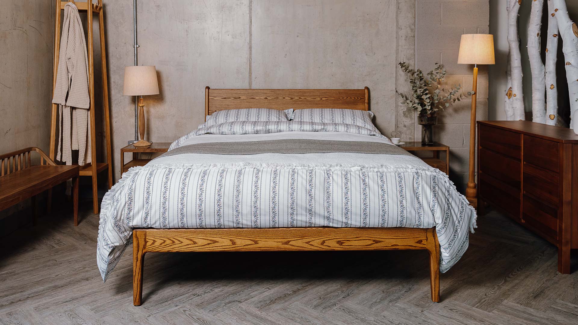 Arguably our most popular bed, the Camden is a classic design featuring a bold panel headboard, expertly crafted from your choice of solid wood timber. Complimented by the elegant curves of the headboard legs and gently softened edges. Available here in a special edition, Warm Smoked Ash finish in King size.
