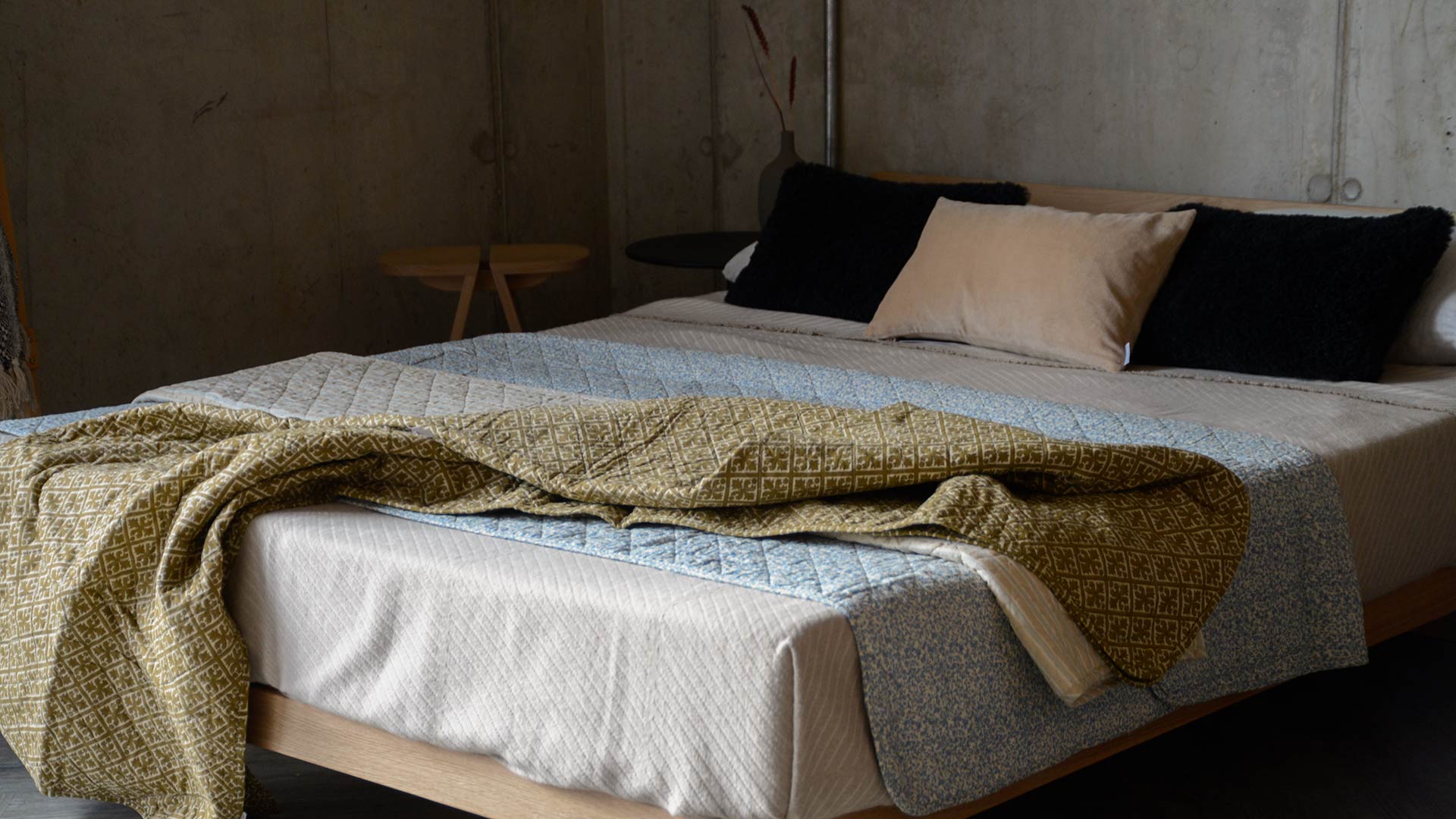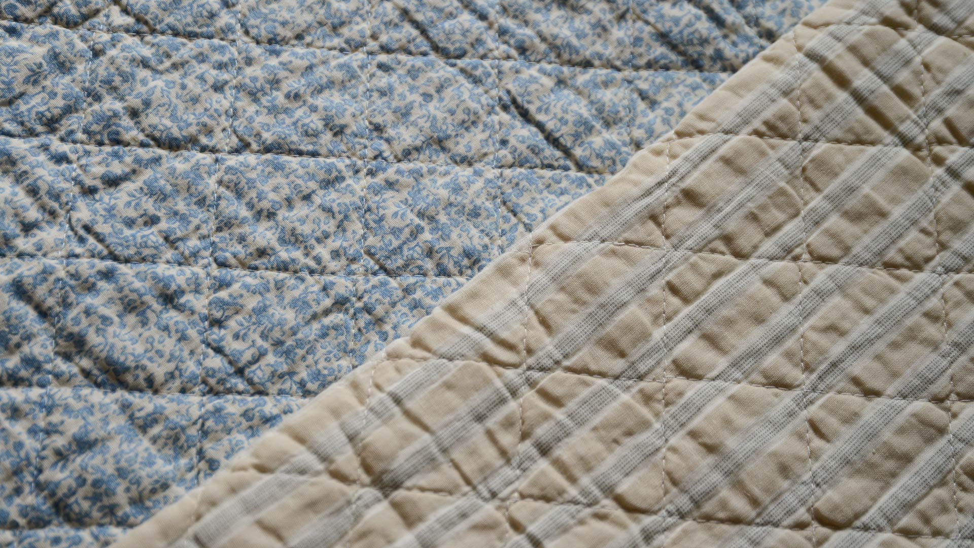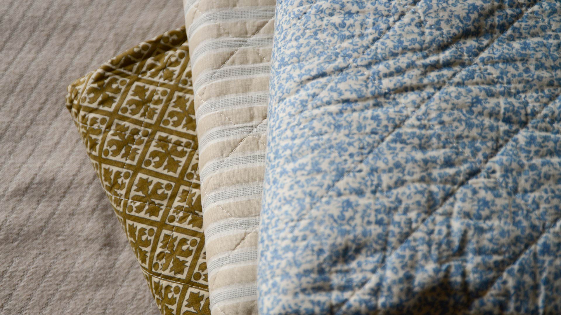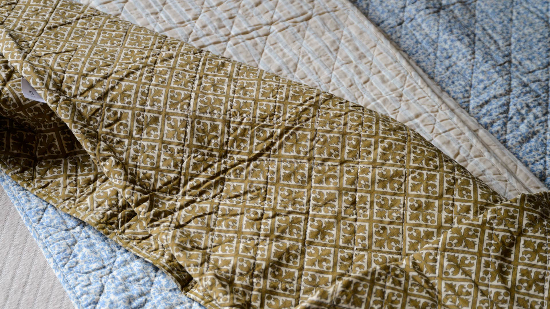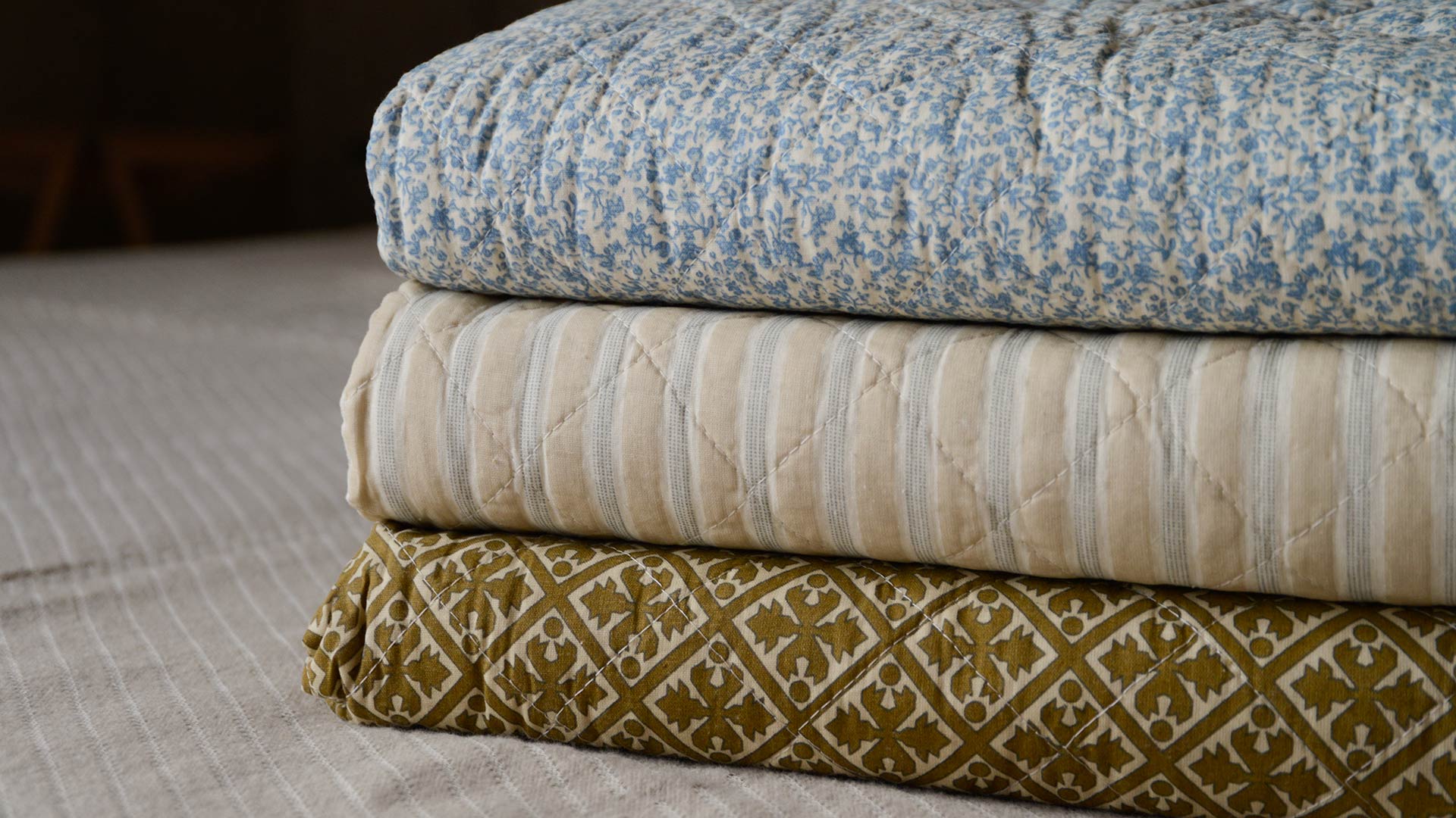 Light-weight, colourful quilted throws in blue, deep gold and soft cream – with fresh printed patterns: florals, diamonds and stripes. Stylish cotton quilted blankets in a soft, patterned fabric.
