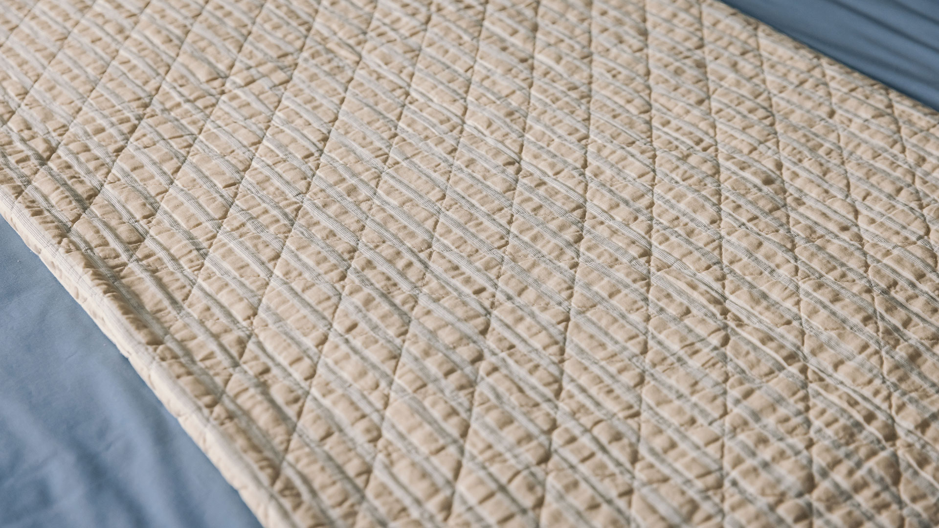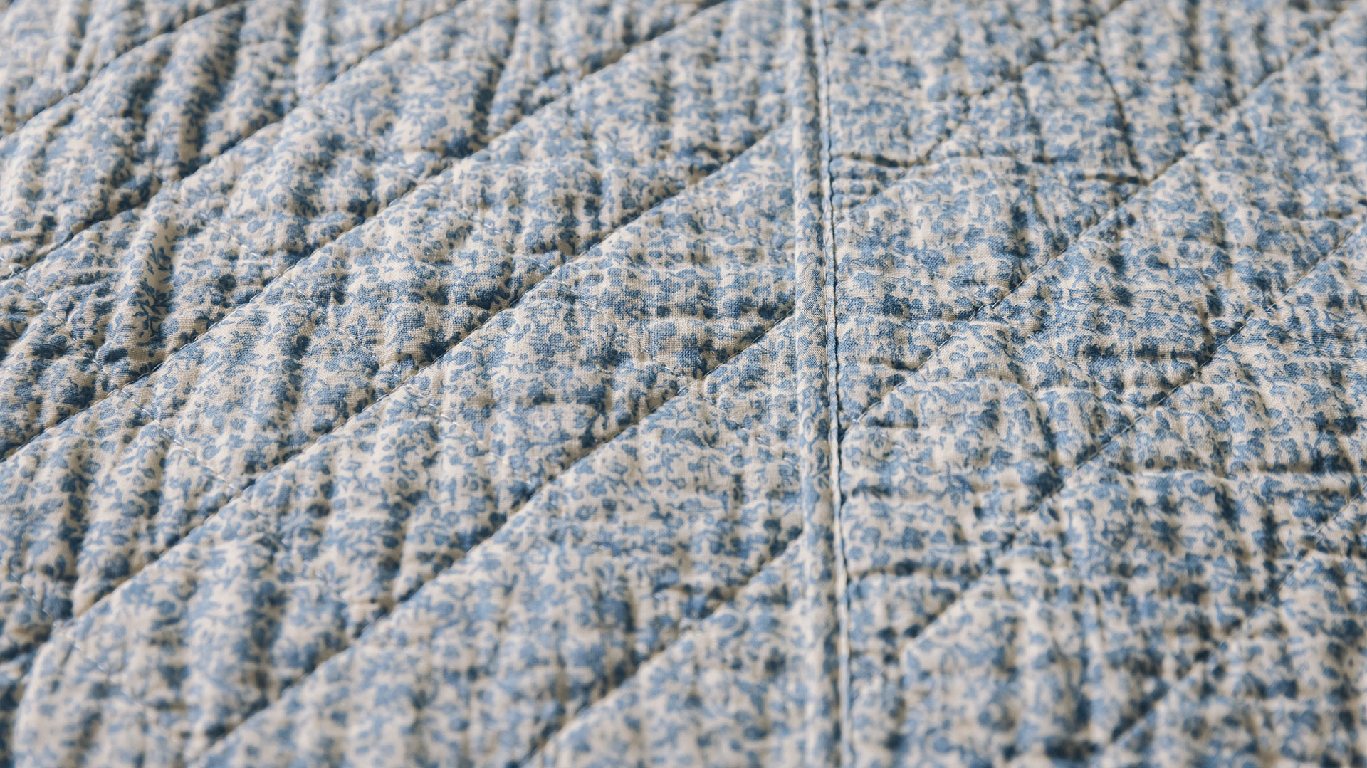 Stylish, cotton quilted throws. Available in three patterns in complimentary blues and creams: blue & ivory floral print, cream & blue stripes or deep gold diamond pattern over a cream background. It has a stitched design to create the ‘quilted’ effect.