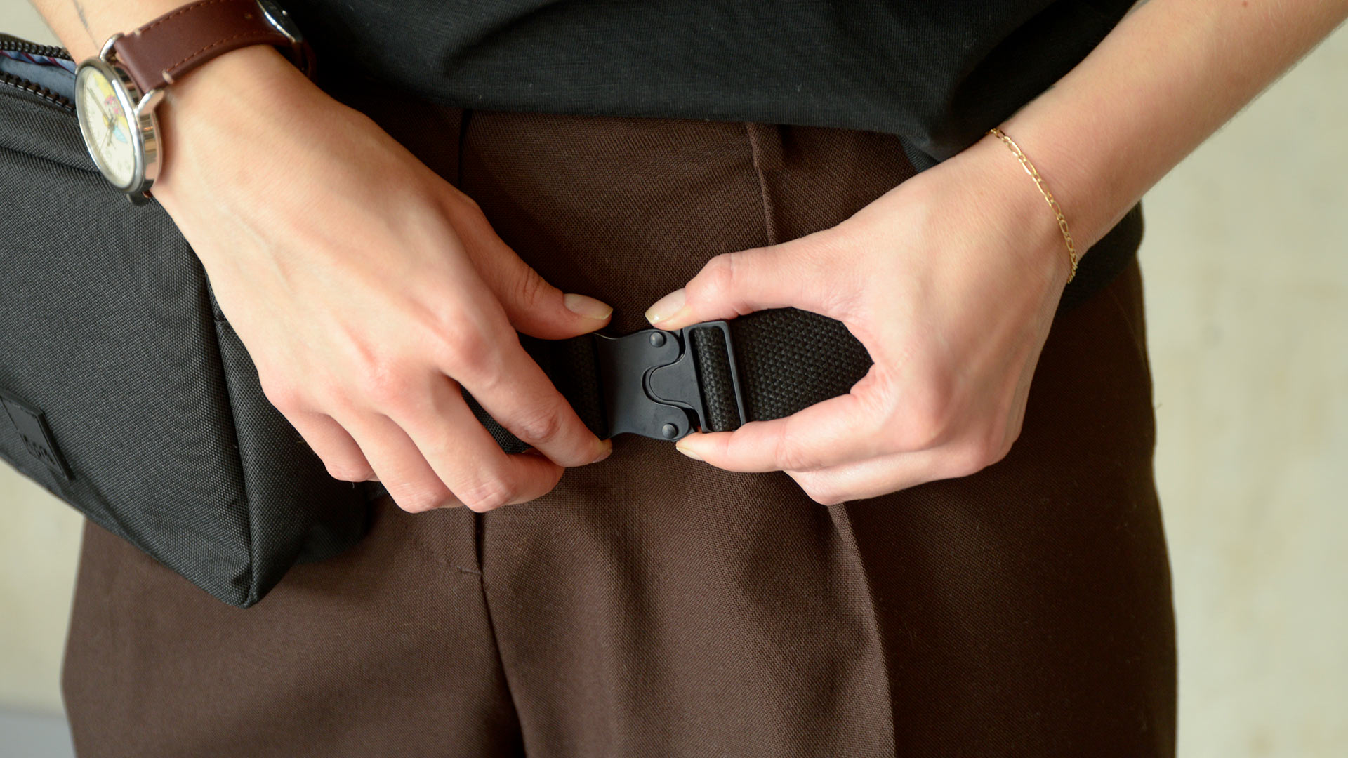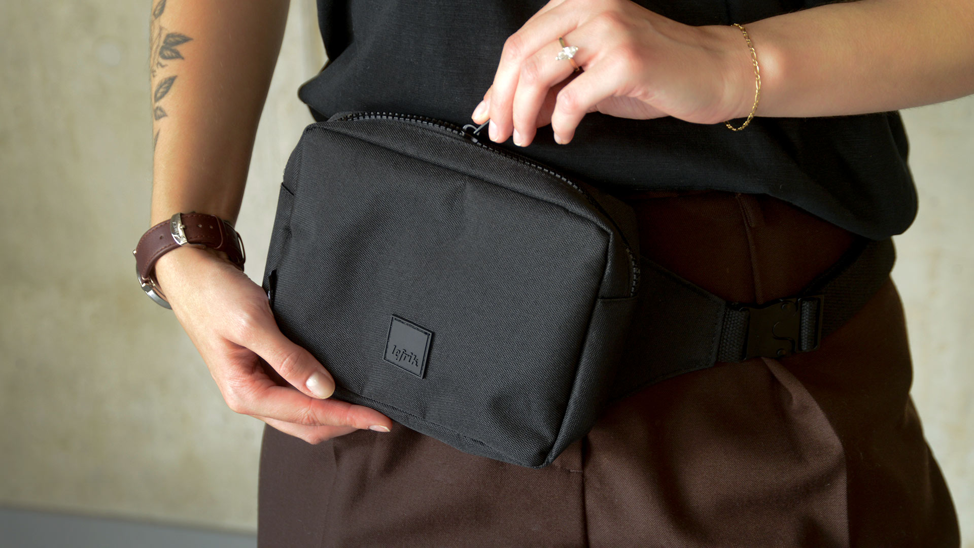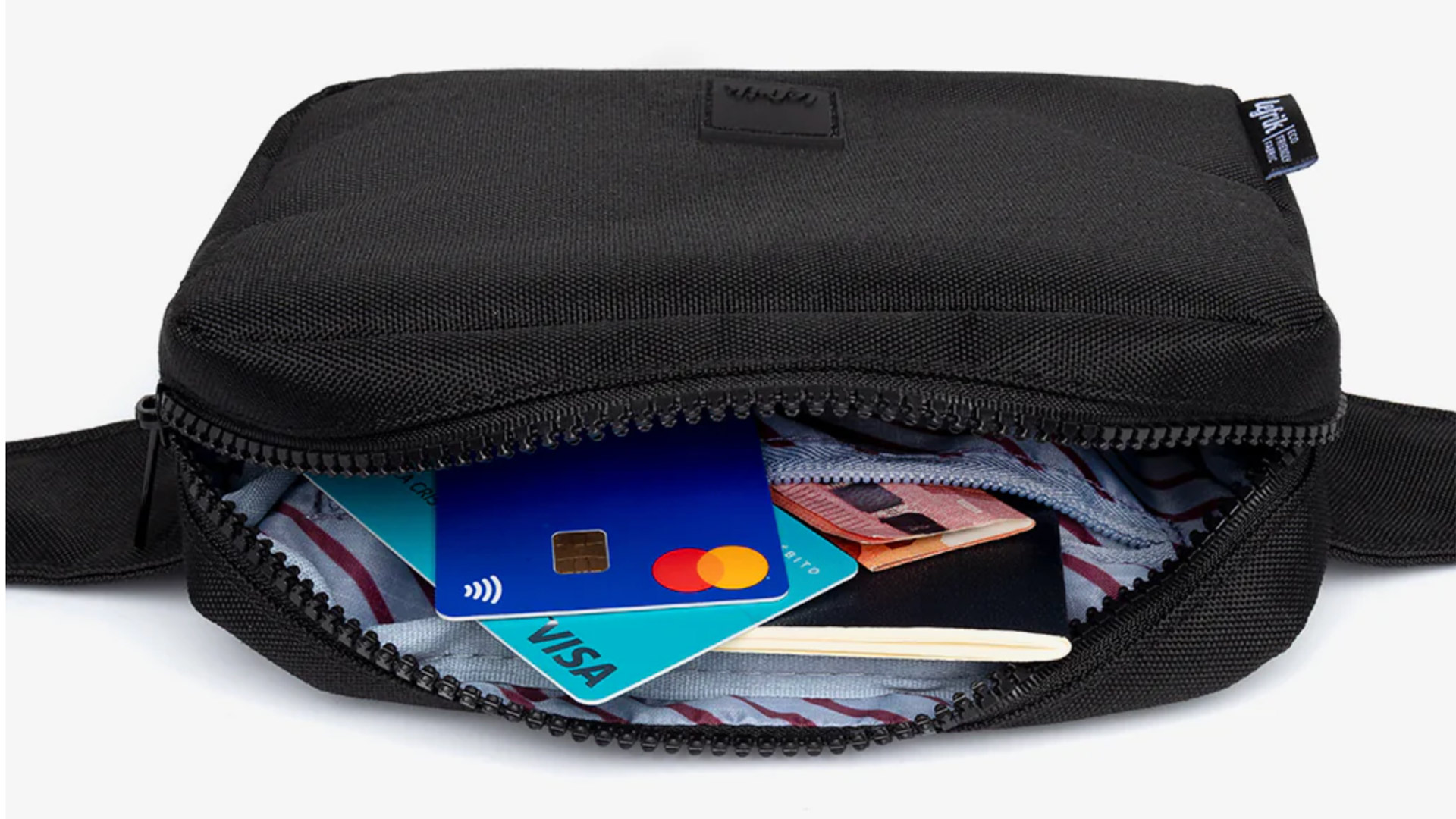 Its main zipped compartment has two interior pockets, and a separate zipped compartment can be found on the back. The cotton strap features a simple clip closure.This recycled plastic crossbody bag can also be used as a bumbag.