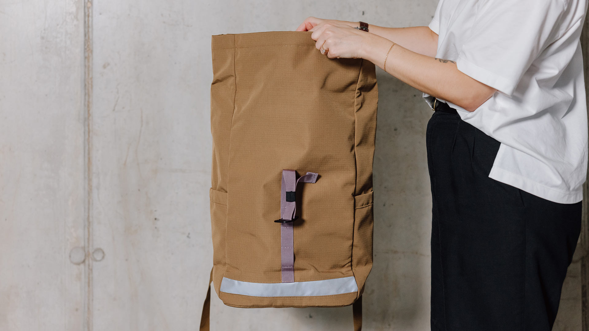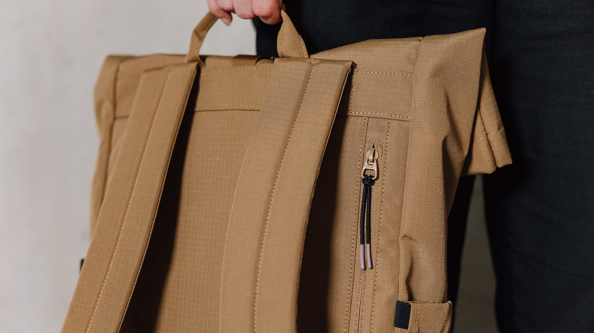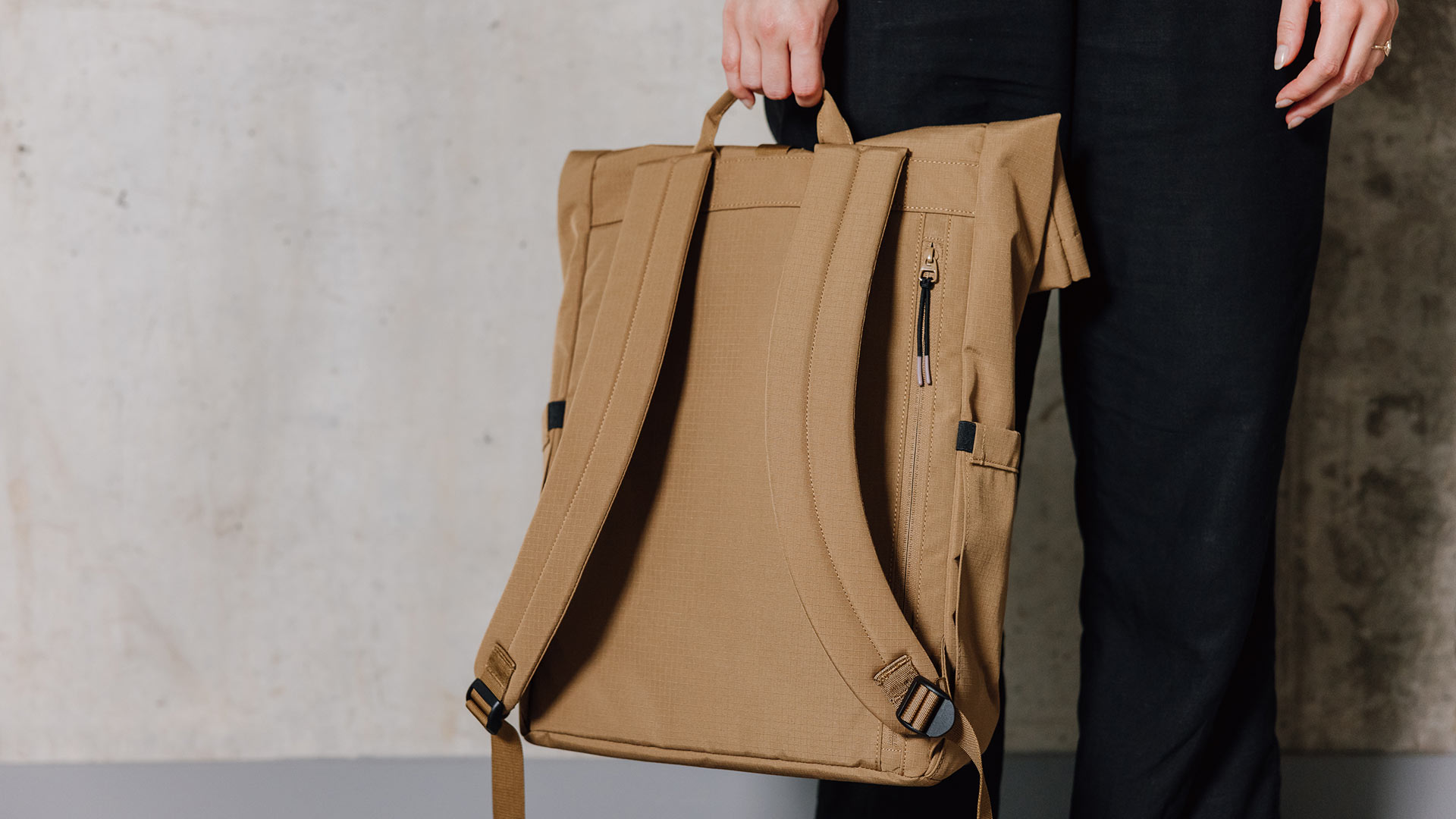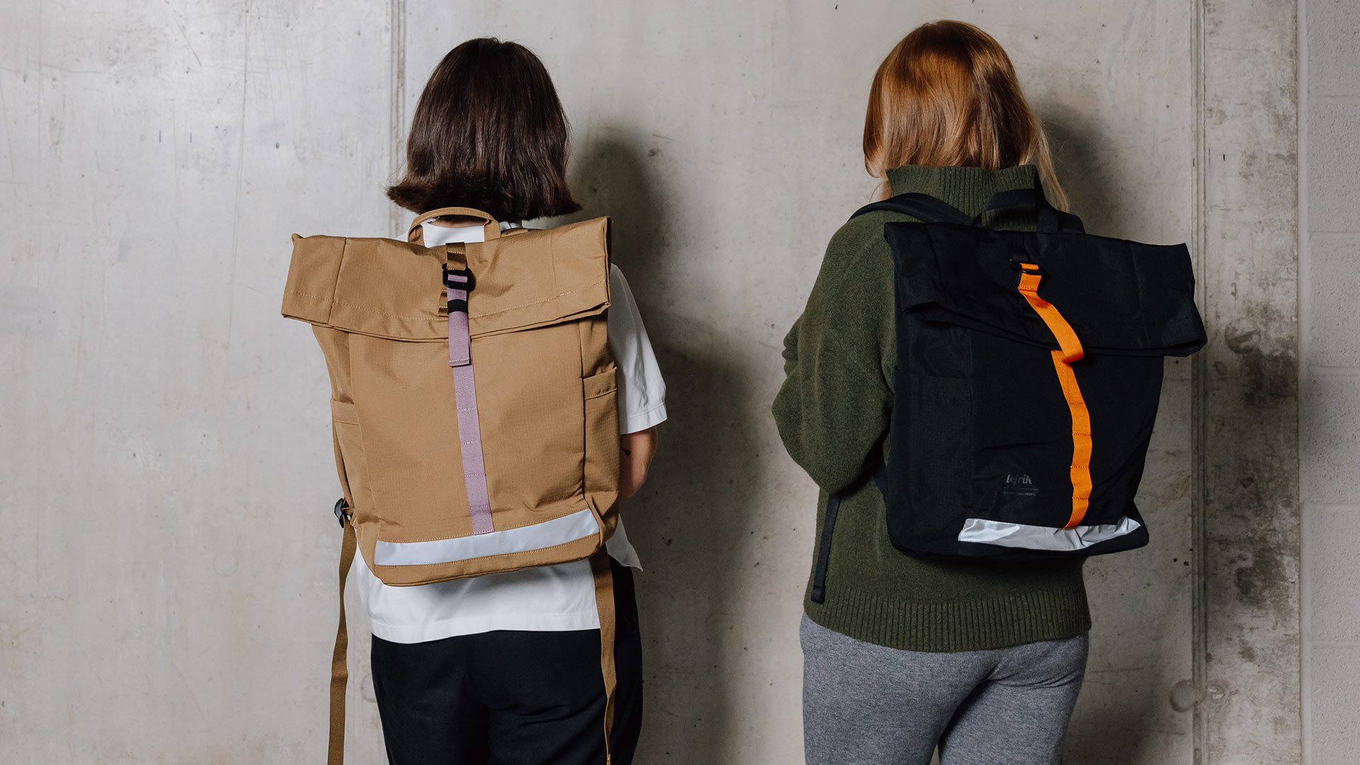 Please note: the black roll-top backpack has a velcro closure, whereas the camel colour has a magnetic closure.