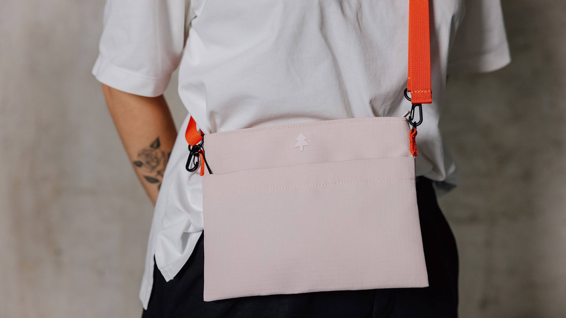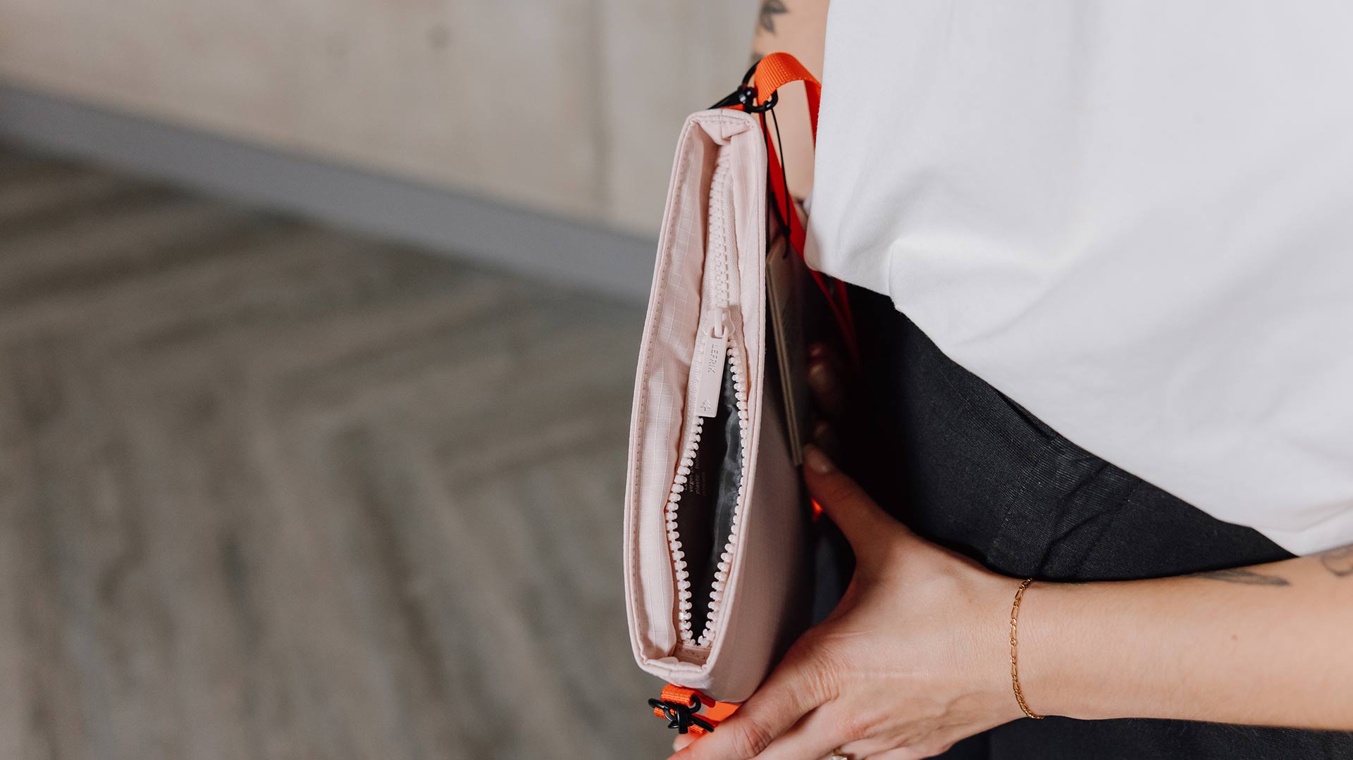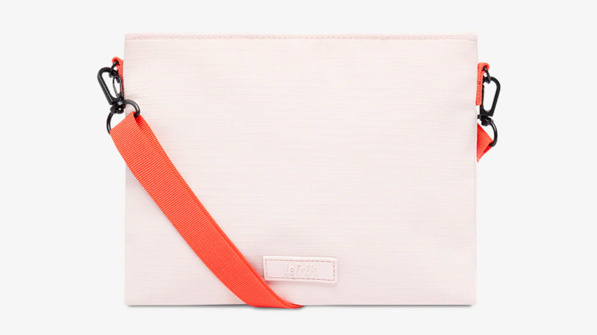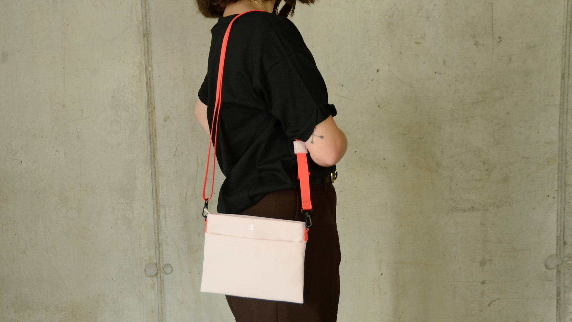 This small blush pink shoulder bag features a bright coral, cotton shoulder strap that can be adjusted so that it can be used as a crossbody bag. Alongside the zipped main compartment, the inner features another small zipped compartment and the outer section has an open pocket spanning the width of the bag.
