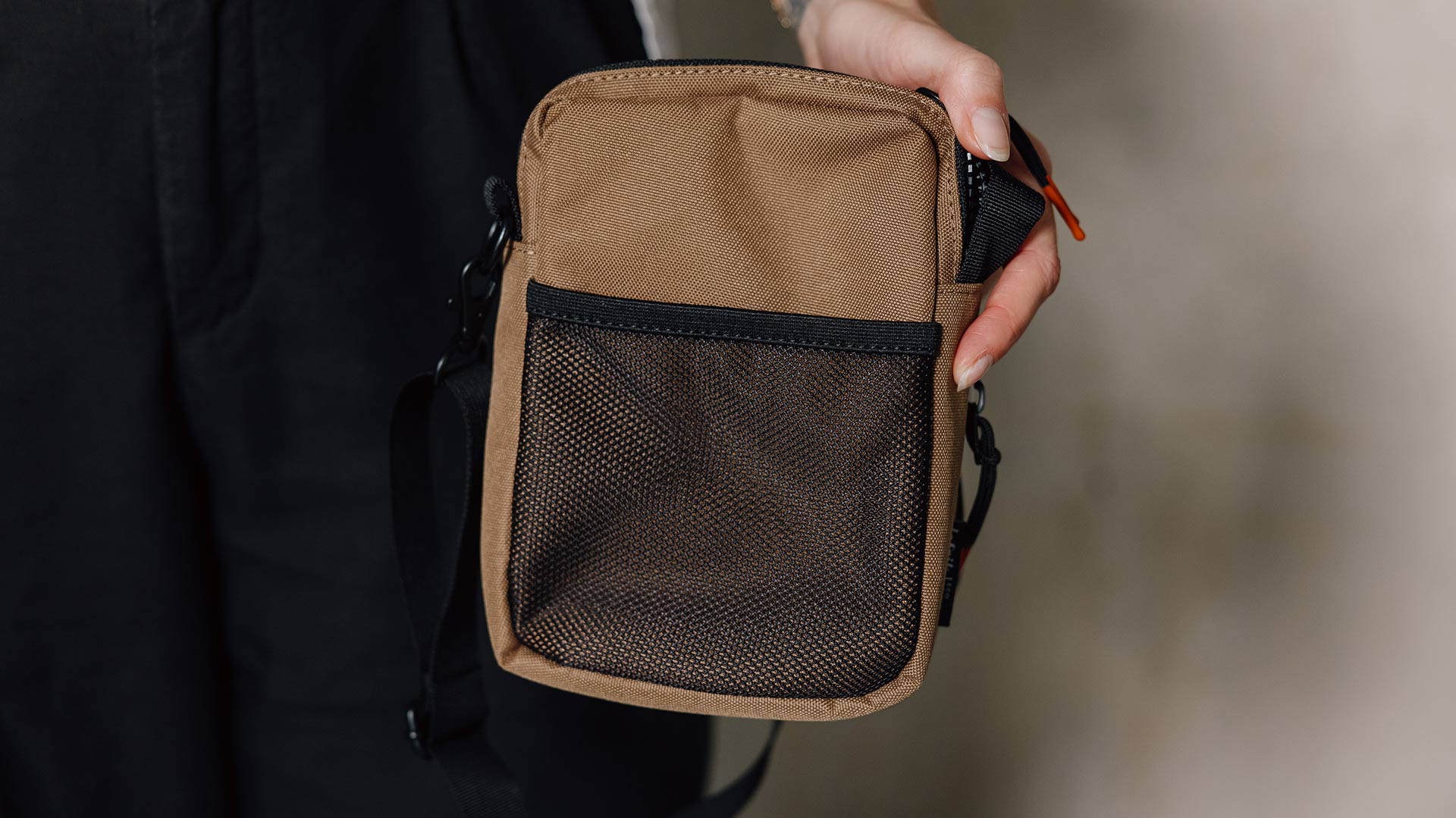 Comprises of one main zipped compartment, and a smaller, zipped front pocket. These bags also feature a separate elastic net compartment on the back. The cotton strap is detachable via a simple clip closure.