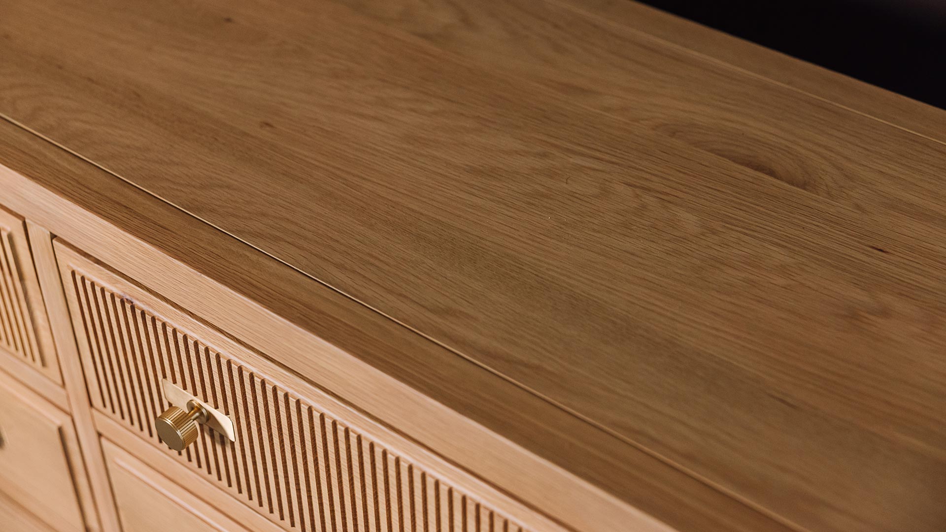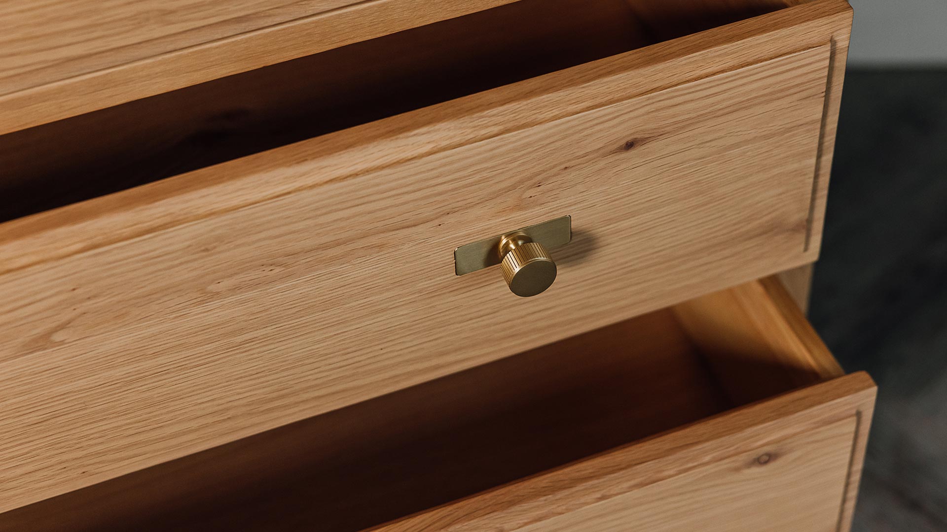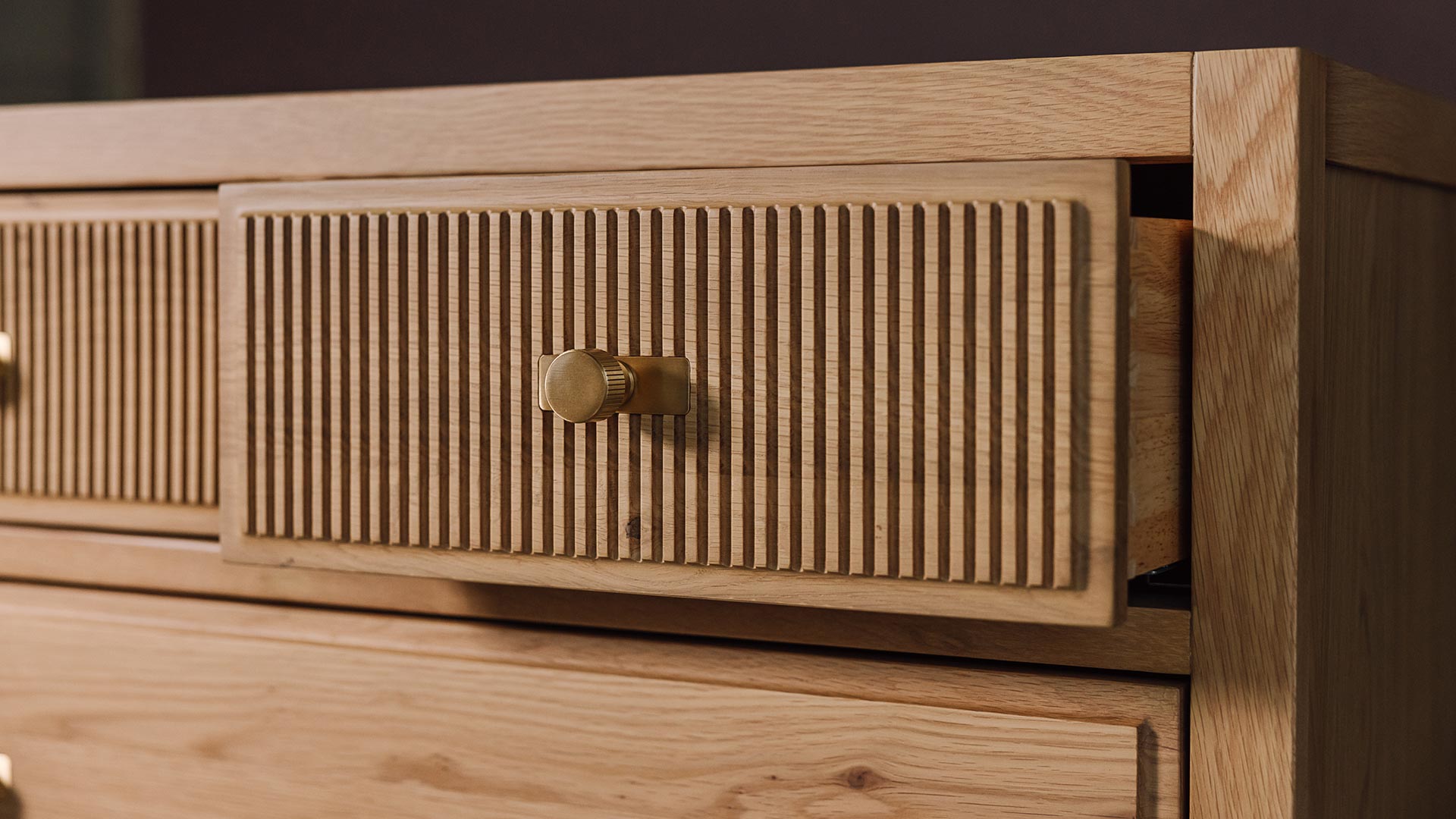 Gently inspired by the art deco design movement of the early 20th century, this collection is characterised by a unique, reeded drawer front. Finished with classic brass hardware, these pieces boast a classic, retro-inspired design that is grounded in modernity thanks to its solid materials.