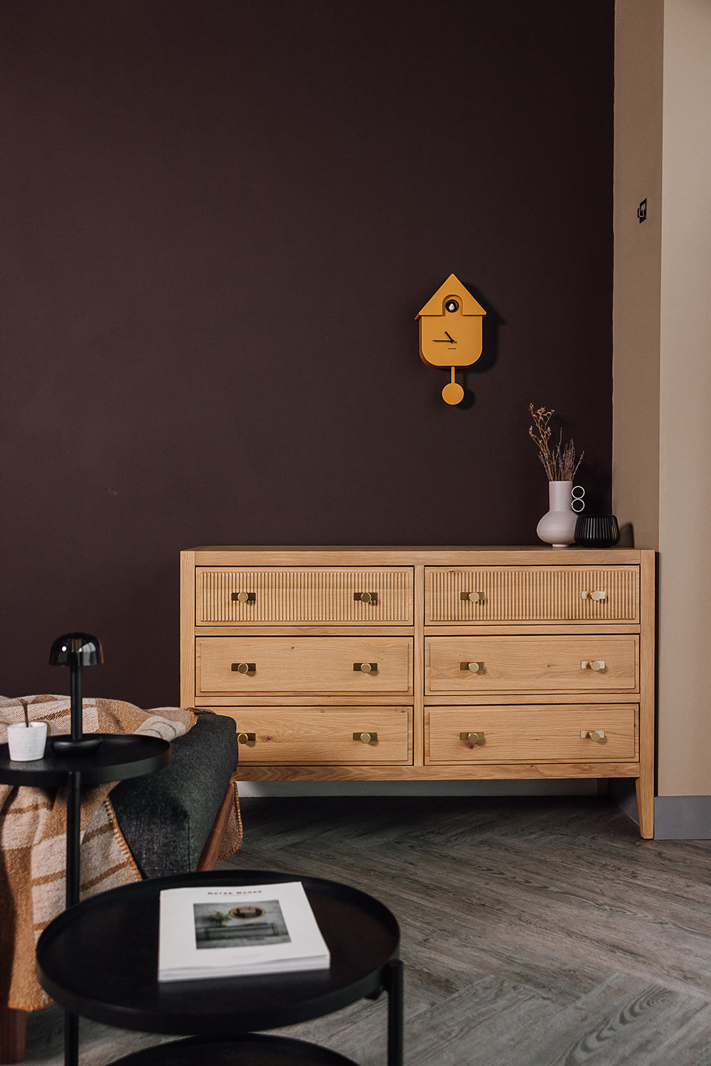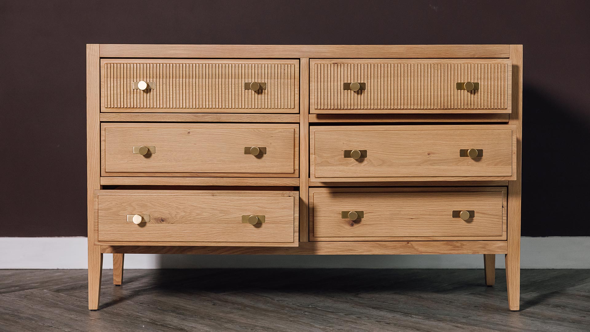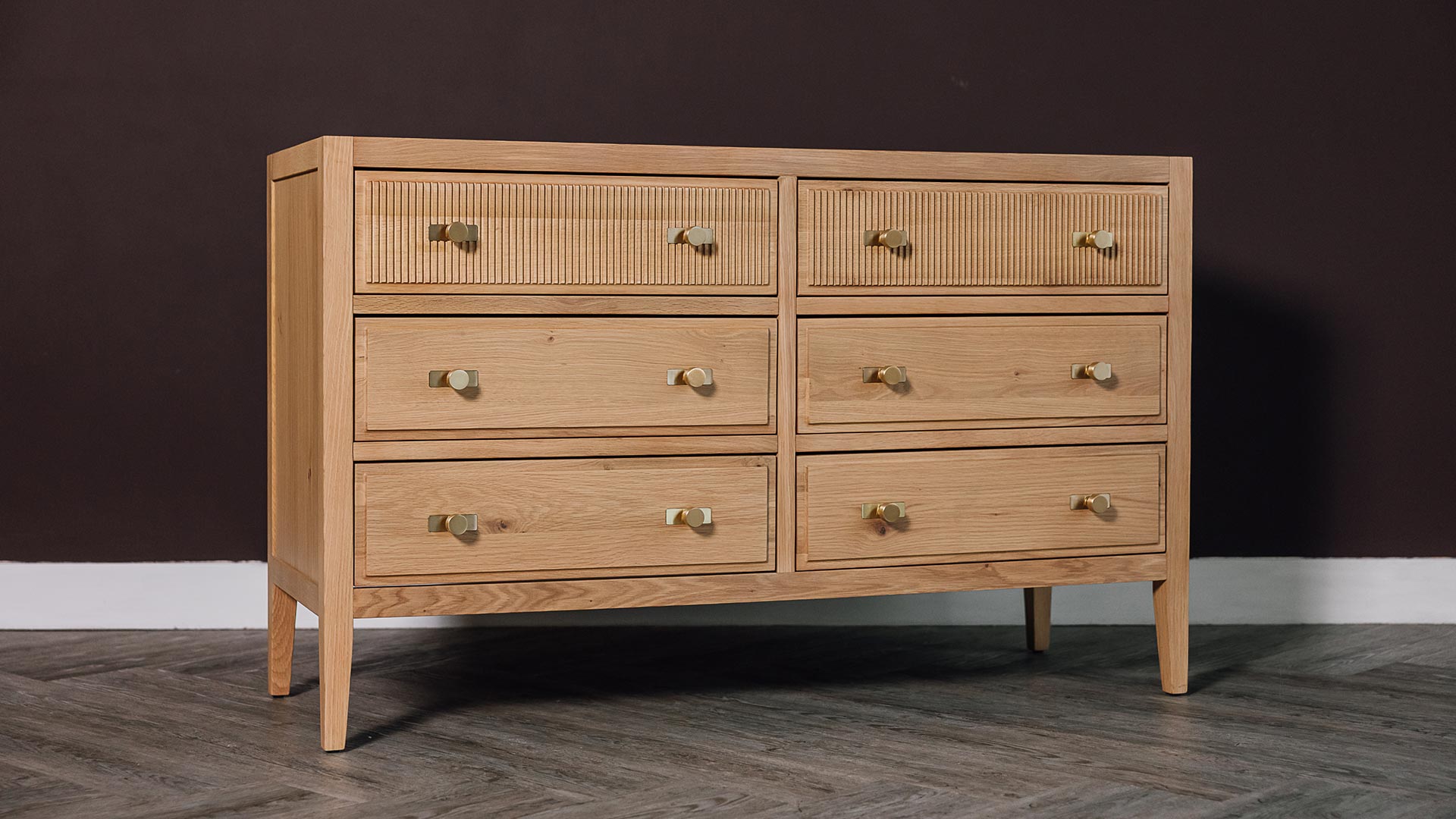 Part of the Deco collection, this elegant, stylish reeded oak chest of drawers offers a timeless design. Complete with six spacious drawers, it’s ideal for keeping your home neat and tidy. Made from solid oak and oak veneer, this piece shows off the beauty found in natural hardwood. Its slender legs and gentle taper give it a refined, elegant look. Perfect in the lounge, hallway or bedroom.
